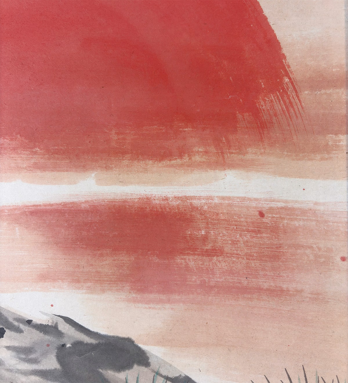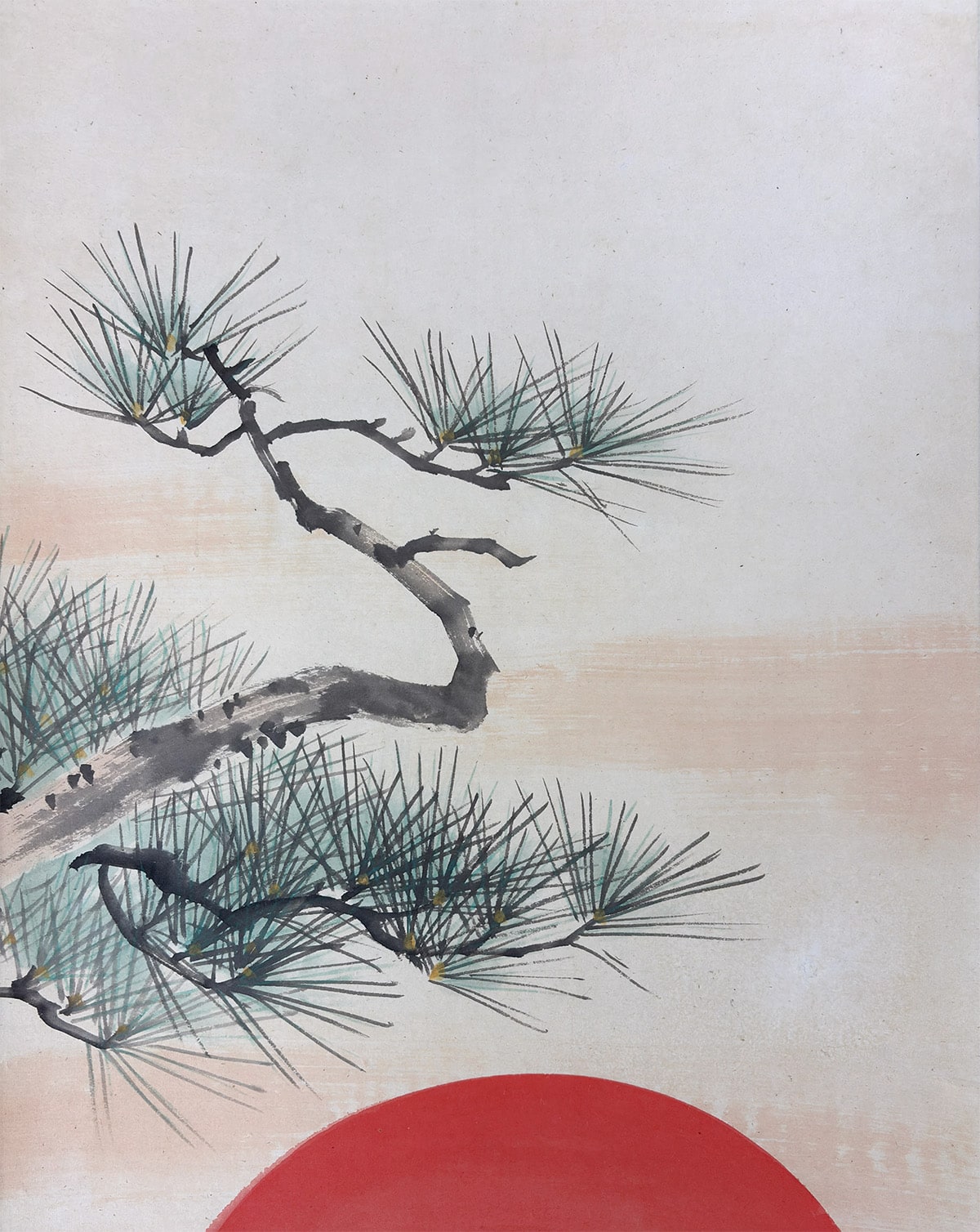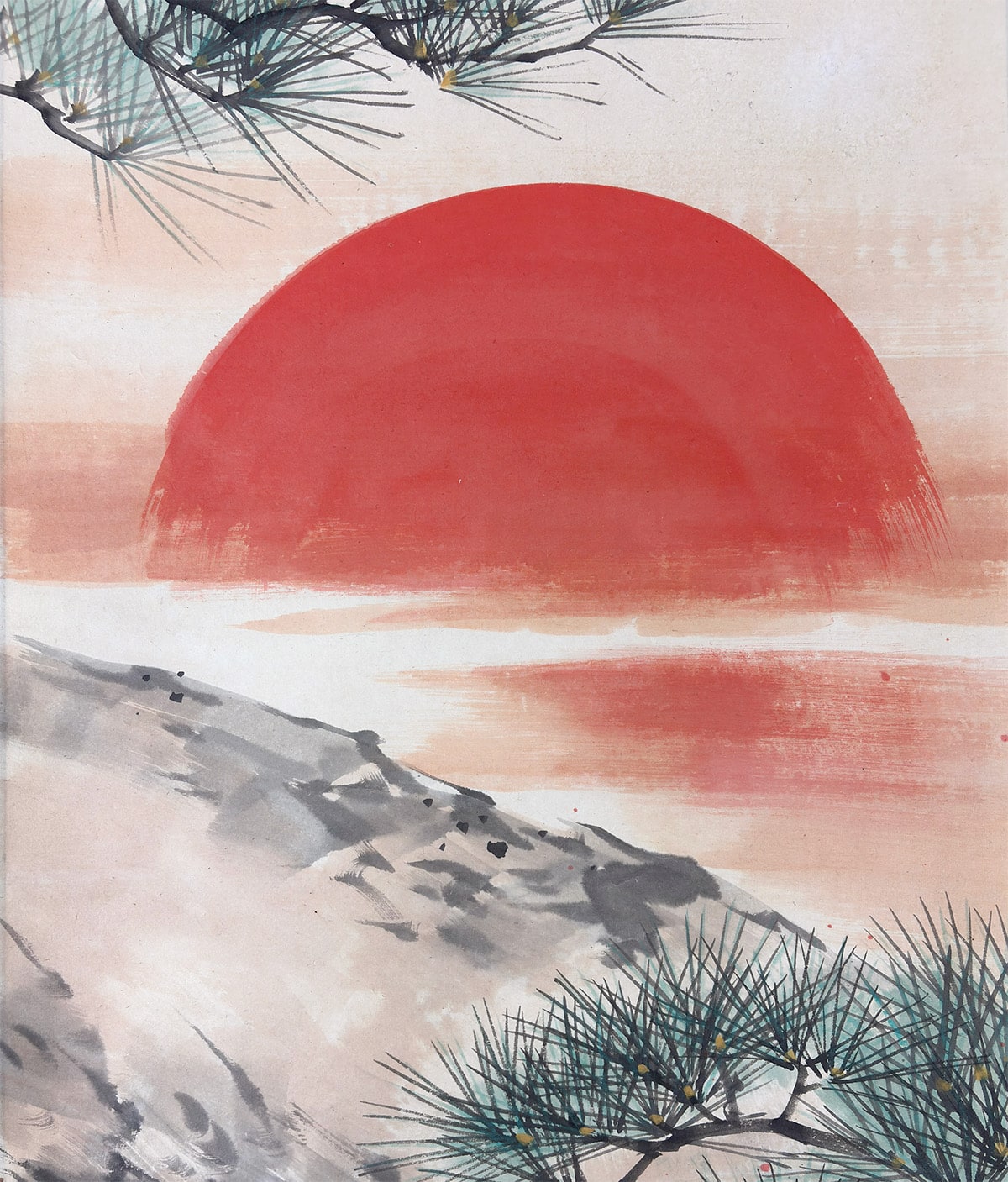 ●背景には余計な要素を置かず、老松と旭日の二主題だけで構成されているため、画面全体に清澄な空気が漂います。余白の取り方が巧みで、光と影の対比が自然に生まれ、見る者の視線を松から太陽へと導きます。飾る空間に凛とした気配をもたらしつつ、どこか穏やかな安らぎも感じさせる一幅です。
