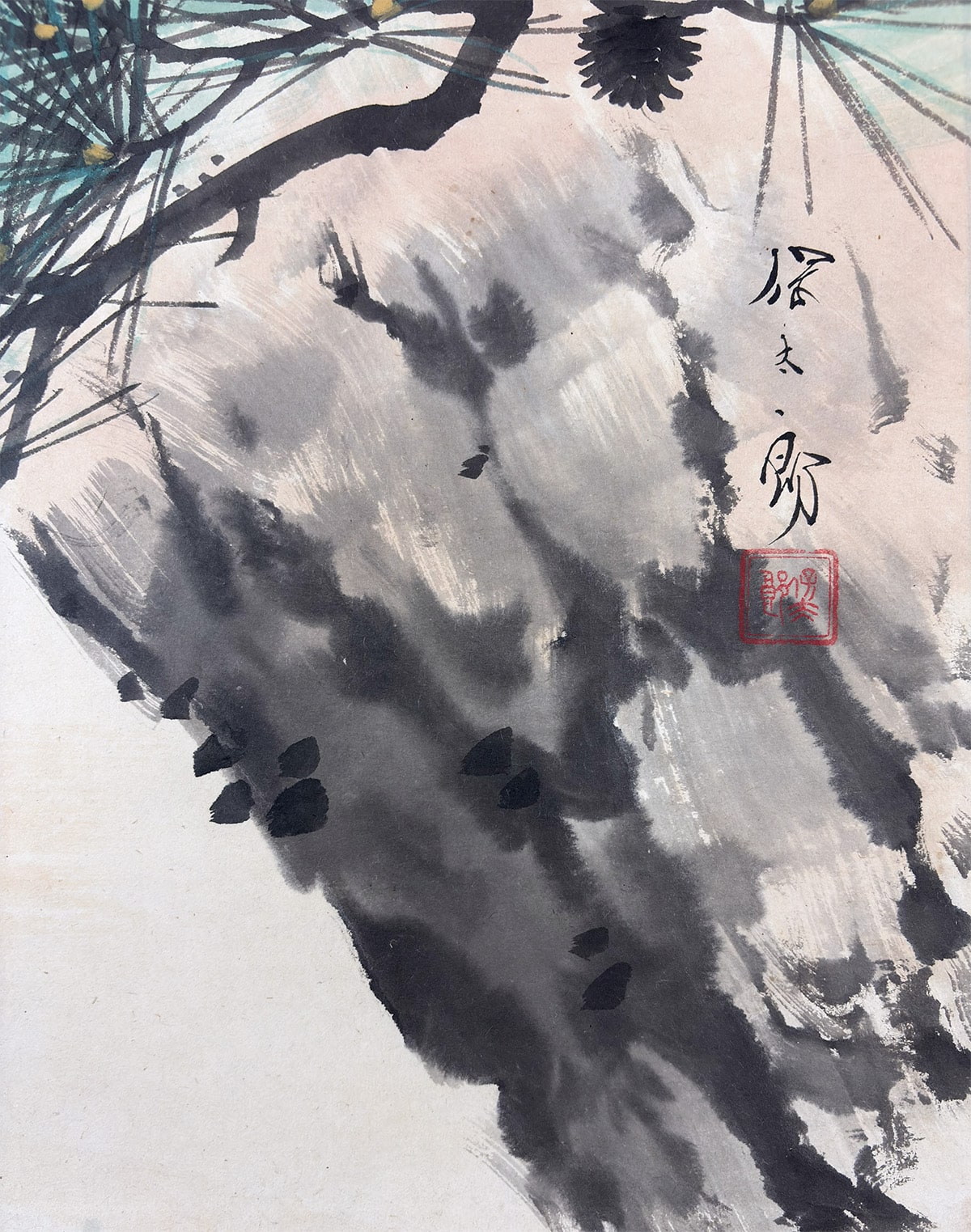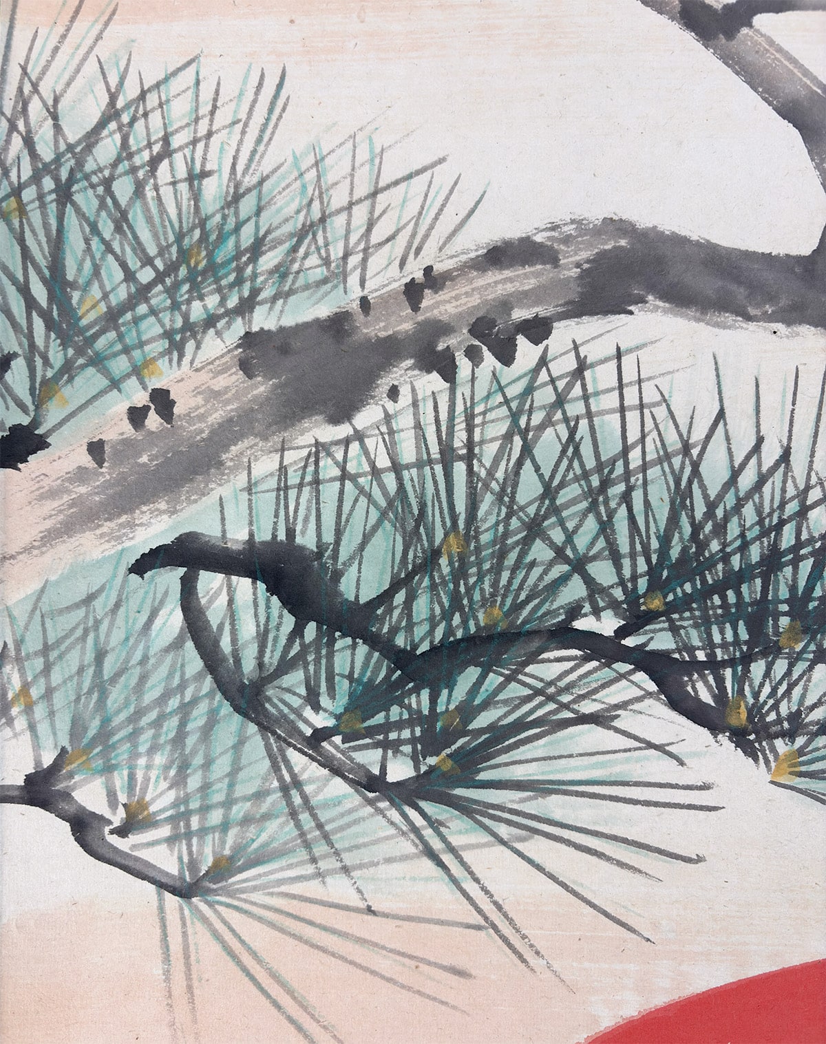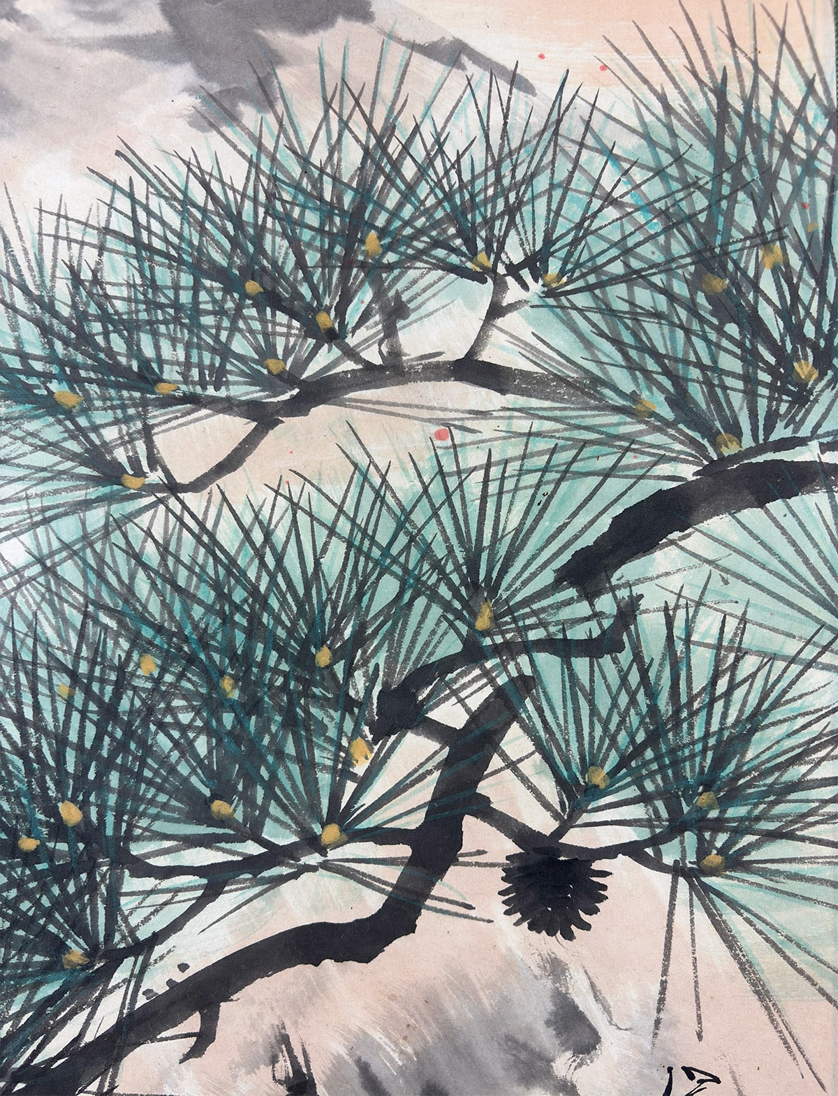 ●背景には余計な要素を置かず、老松と旭日の二主題だけで構成されているため、画面全体に清澄な空気が漂います。余白の取り方が巧みで、光と影の対比が自然に生まれ、見る者の視線を松から太陽へと導きます。飾る空間に凛とした気配をもたらしつつ、どこか穏やかな安らぎも感じさせる一幅です。