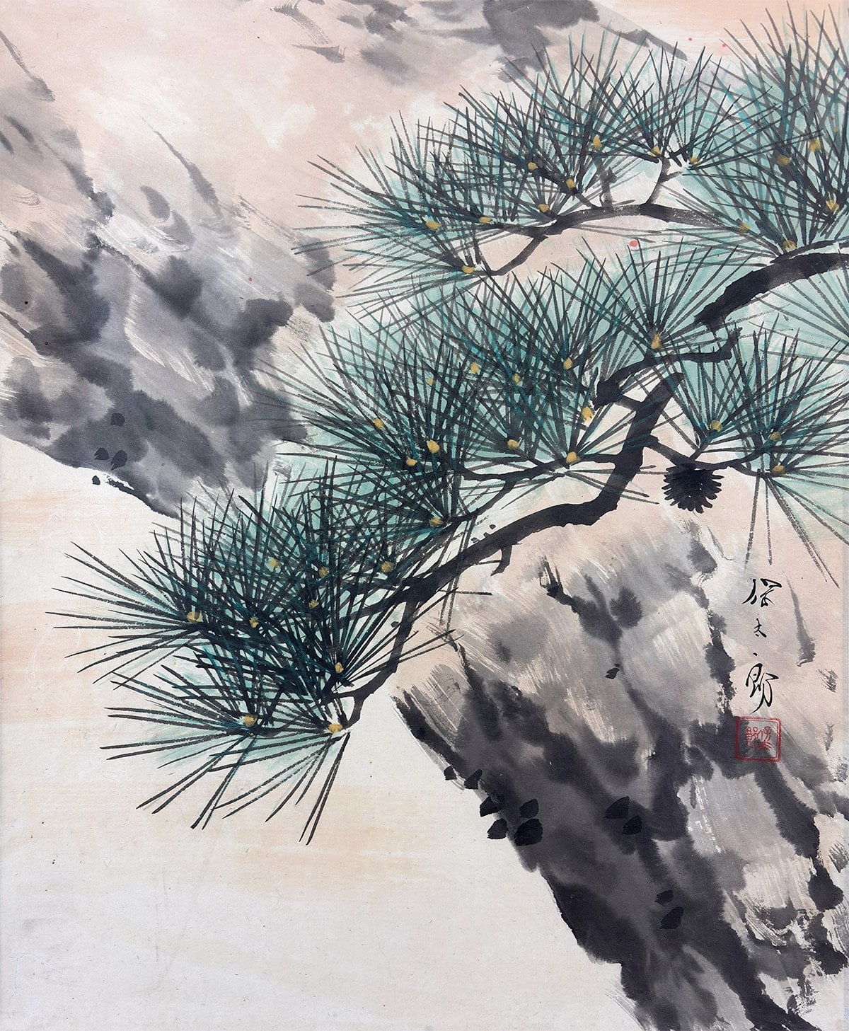 ●老松の端正な枝ぶりが美しく、その枝の向こうに昇る朝日がやわらかな光を広げています。静かな雰囲気の中に、明るい希望が感じられる一幅です。余計な要素を入れないことで、どんな場所にも飾りやすい清々しい作品になっています。