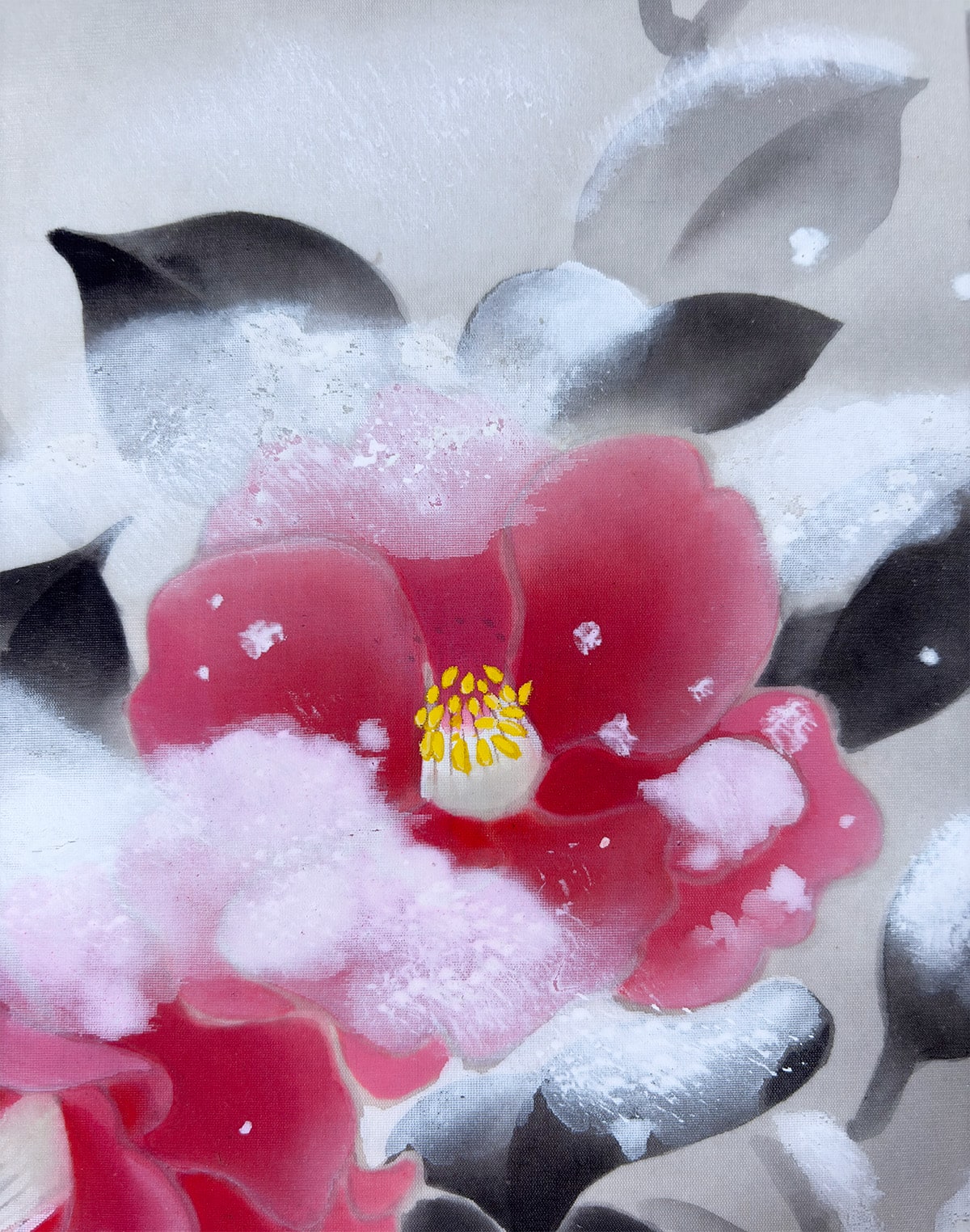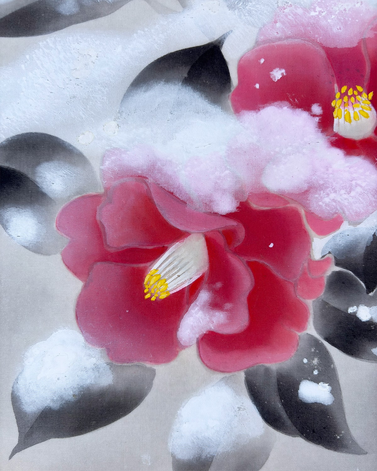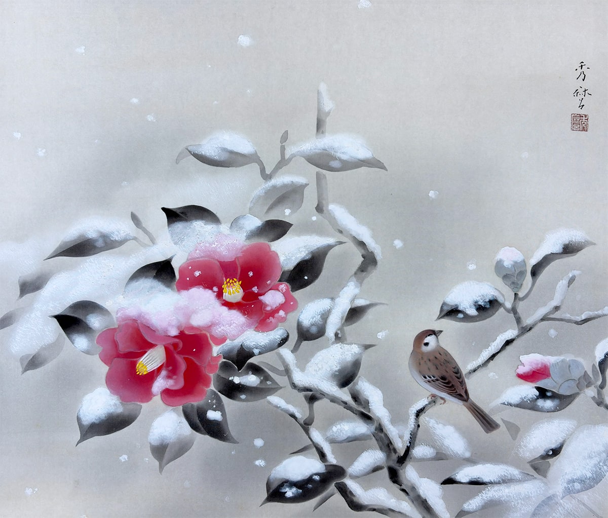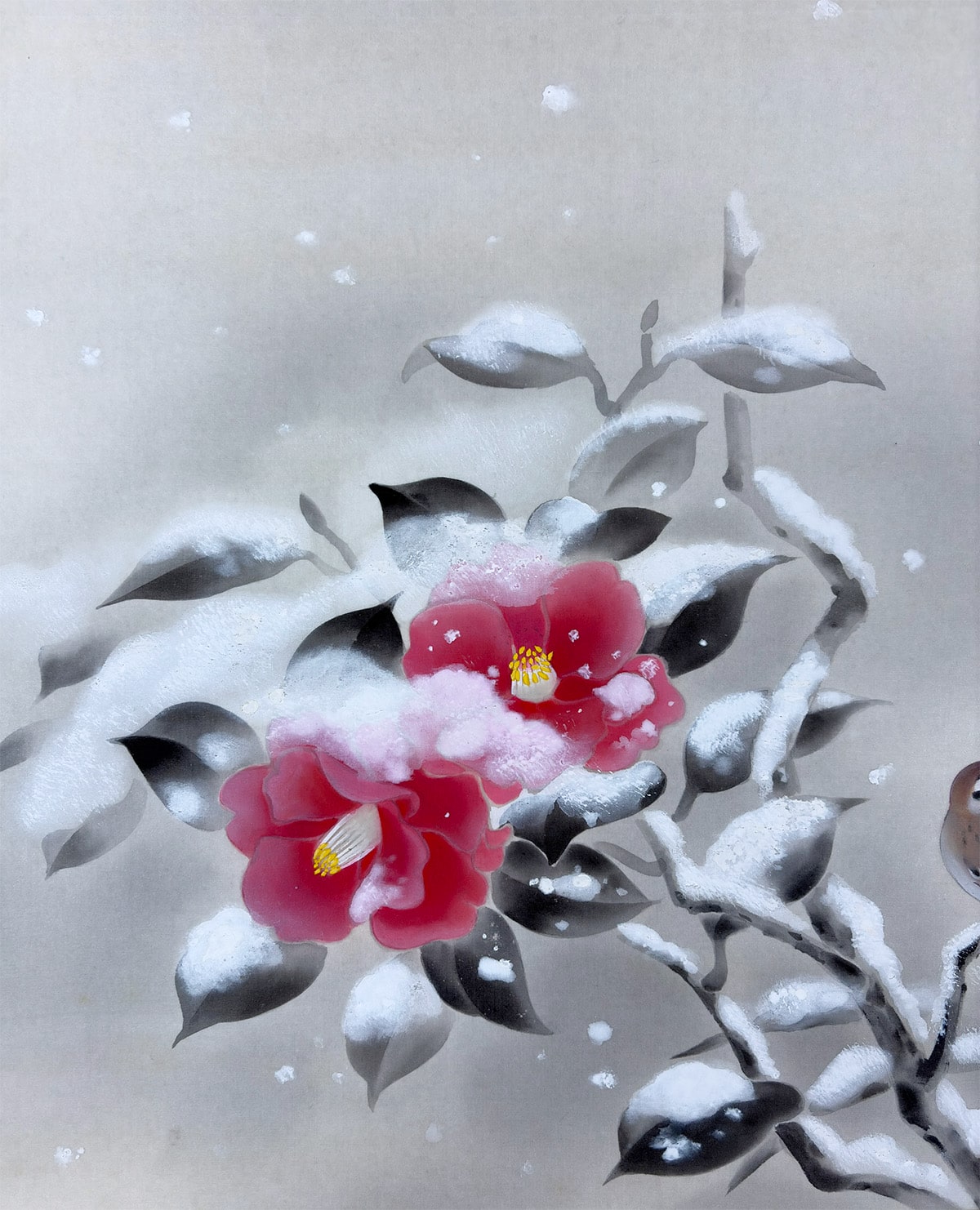 ●冬の床の間を彩る掛物として格別で、雪の量感・椿の艶・雀の愛らしさが調和し、静謐でありながら心を和ませる一幅です。