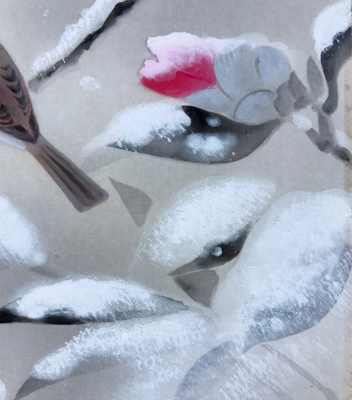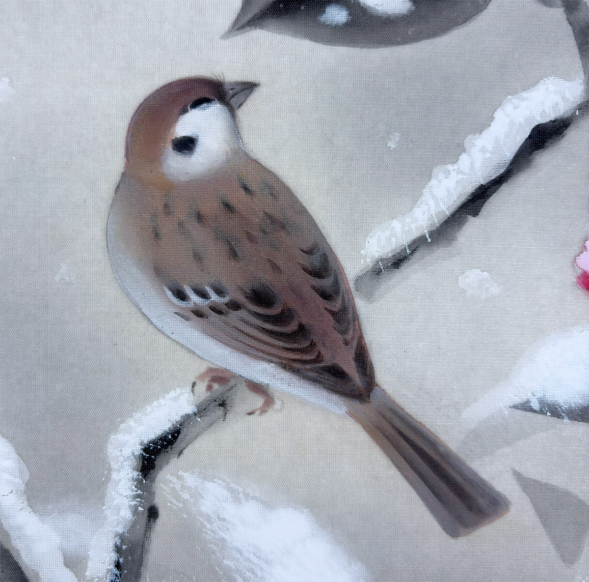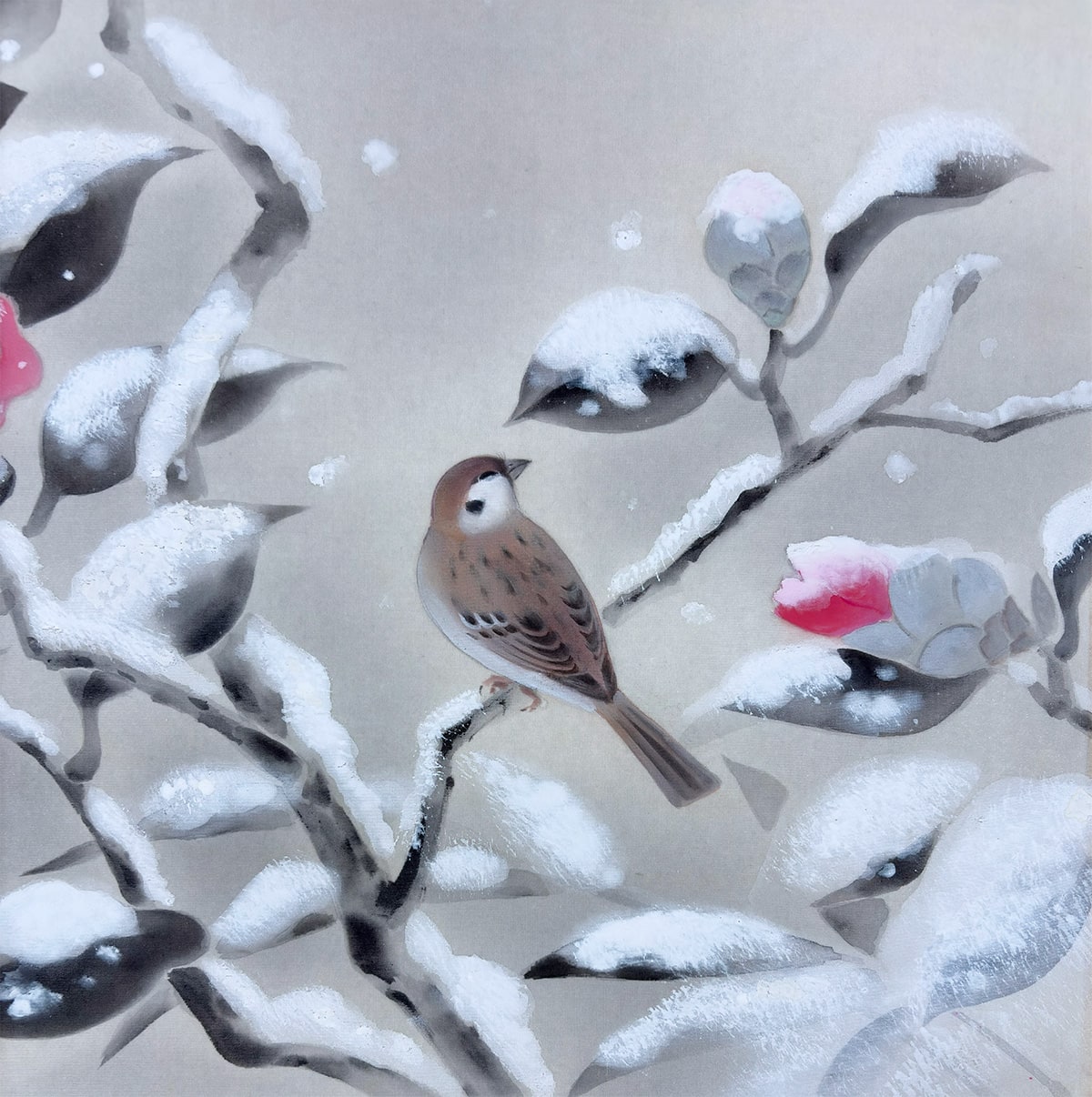 ●枝には雪が厚く積もり、冬の静けさがひときわ深く感じられます。その白さの中で寒椿の紅が鮮やかに浮かび上がり、一羽の雀がふっくらと身を寄せて佇む姿が、厳寒の中の小さな温もりを伝えてくれます。