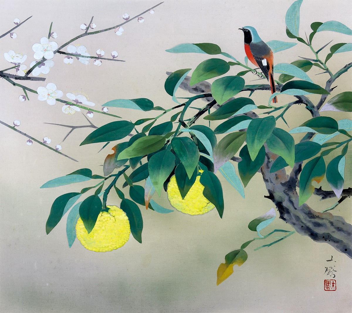 ●柚子の実ふくらむ枝に、紅胸の常鶲(ジョウビタキ)がそっととまり、白梅がほのかに香る。