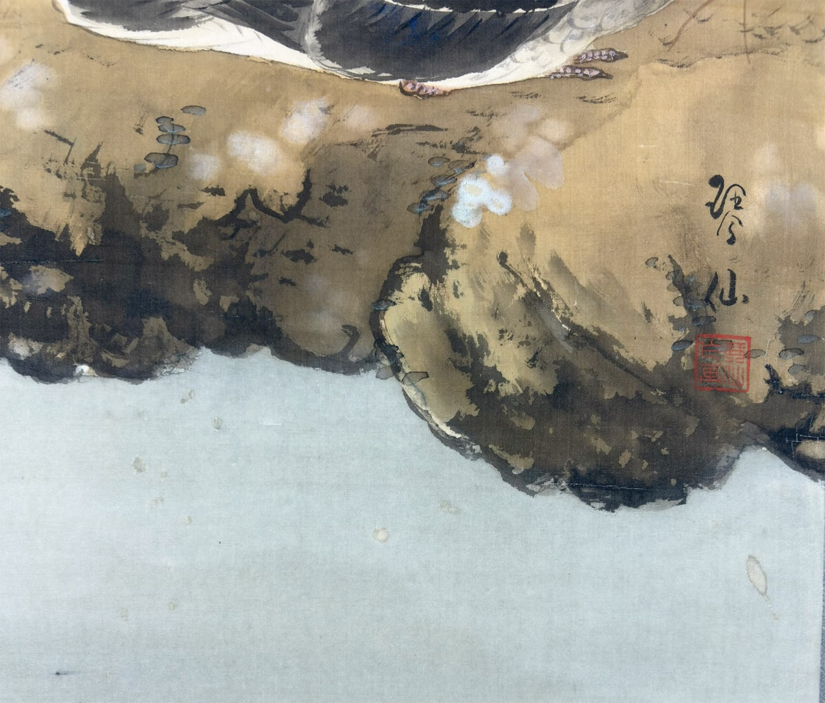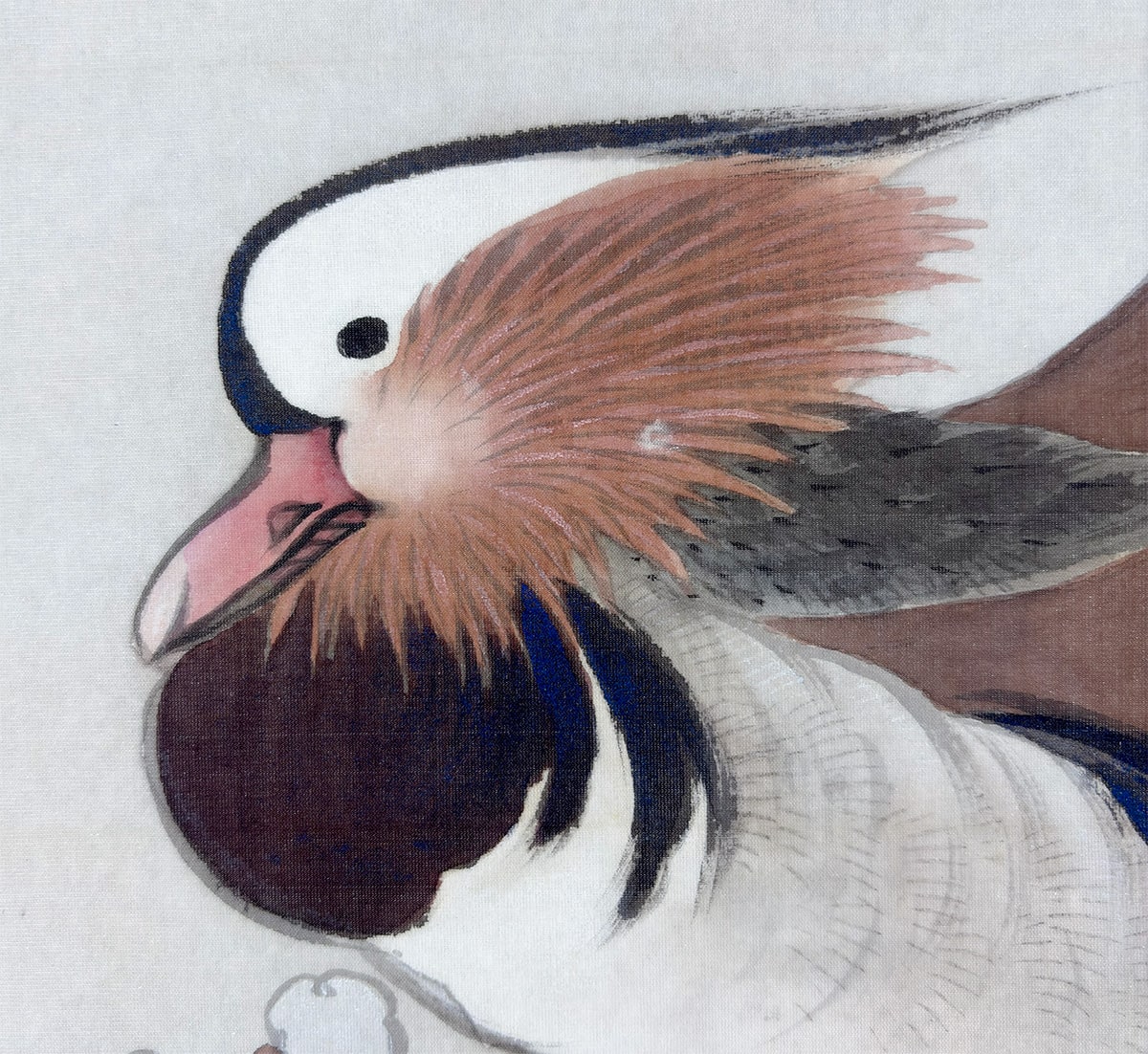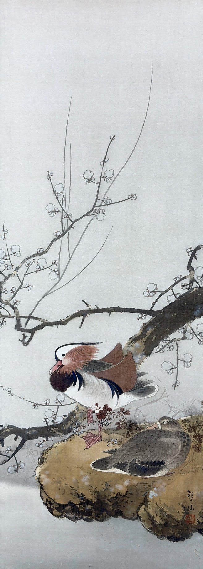 ●春の兆しを告げる梅の花と、仲睦まじく寄り添う鴛鴦(おしどり)を描いた本作は、自然の美と人の情を繊細に映し出す一幅です。琴仙先生は、大正年代頃の日本画家と思われます。本作でも、柔らかな筆致と品格ある色彩が、静謐な情景を見事に表現しています。