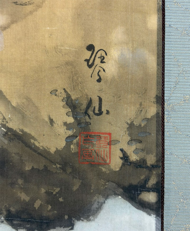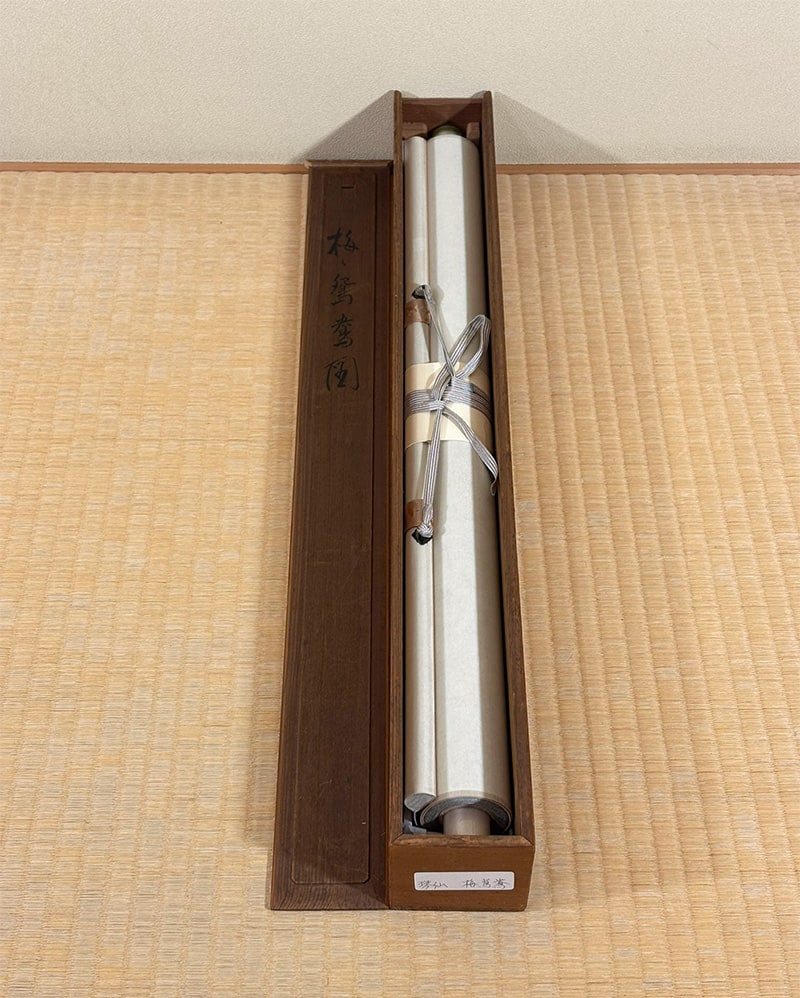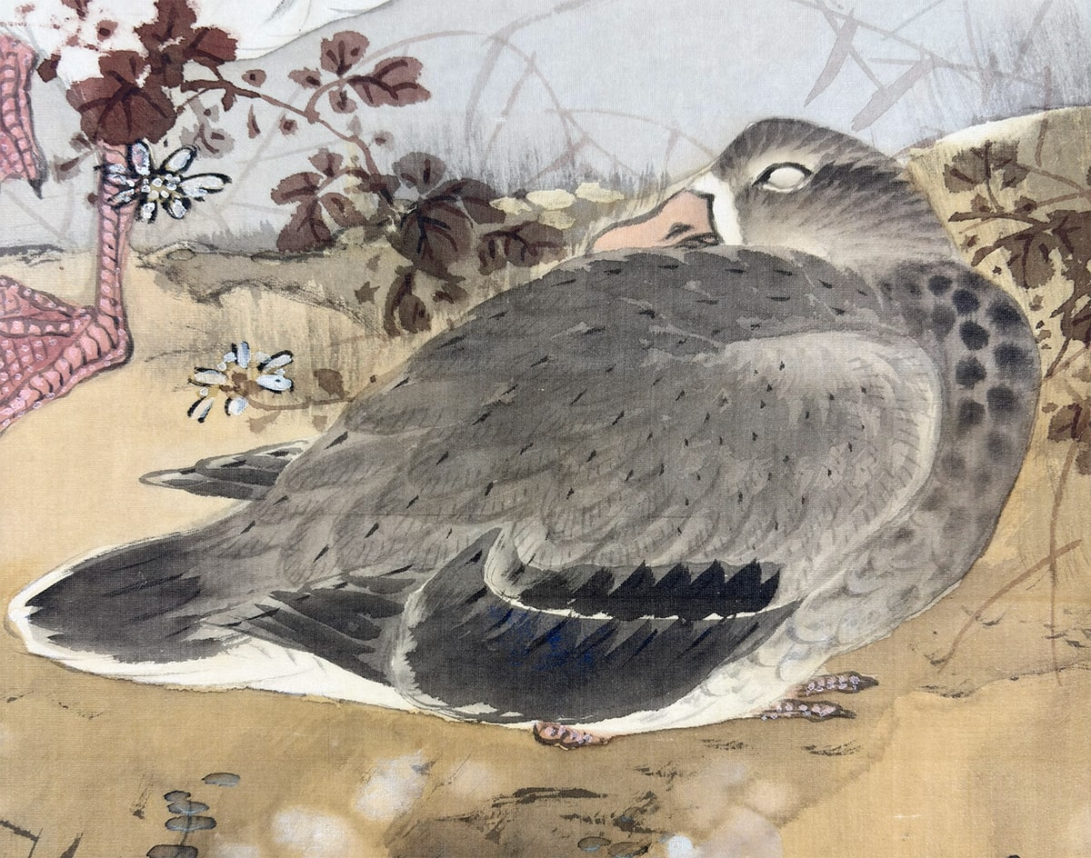 ●春の兆しを告げる梅の花と、仲睦まじく寄り添う鴛鴦(おしどり)を描いた本作は、自然の美と人の情を繊細に映し出す一幅です。琴仙先生は、大正年代頃の日本画家と思われます。本作でも、柔らかな筆致と品格ある色彩が、静謐な情景を見事に表現しています。