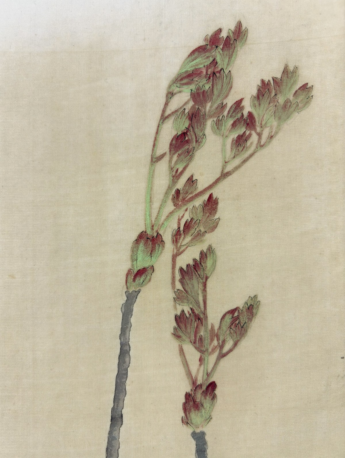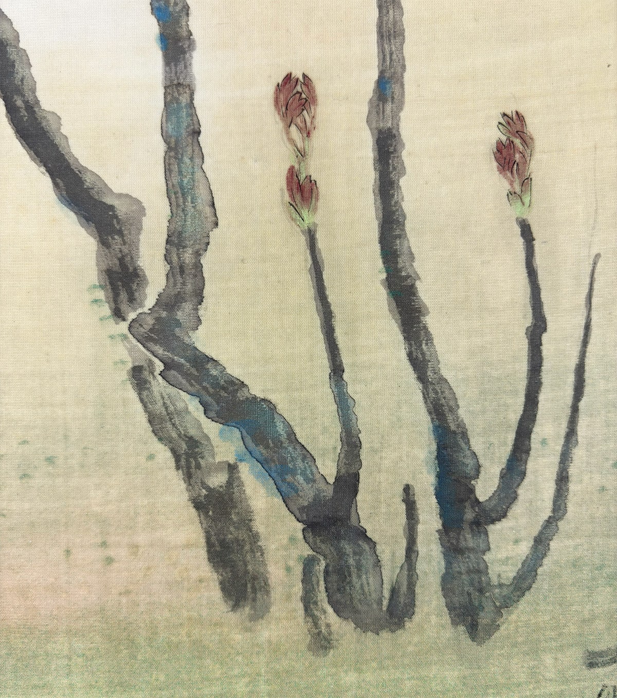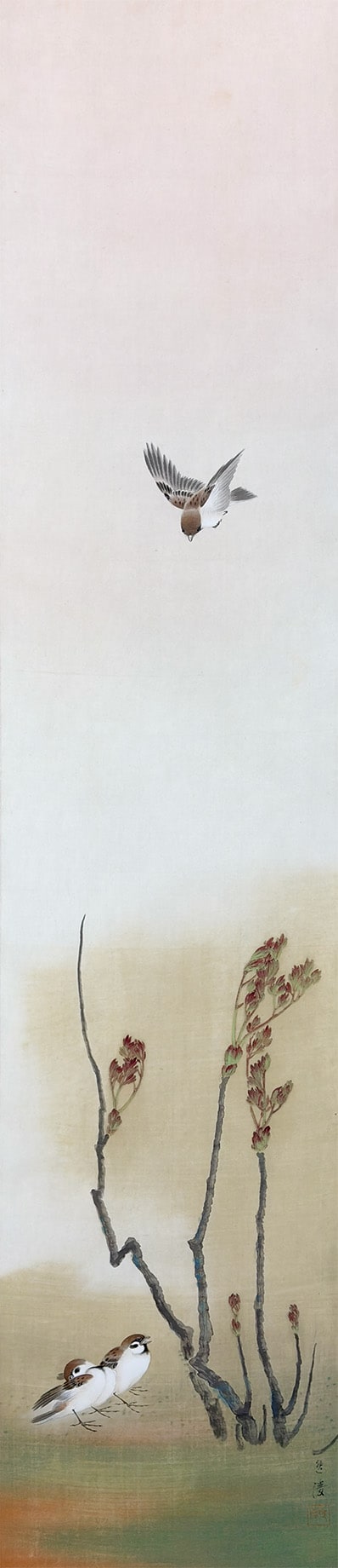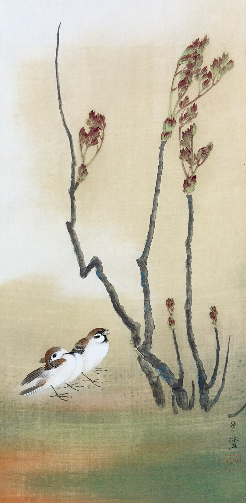 ●春の兆しを告げる牡丹の芽。その柔らかな枝に寄り添う三羽の雀が、季節の息吹と命のぬくもりを静かに語りかけてきます。