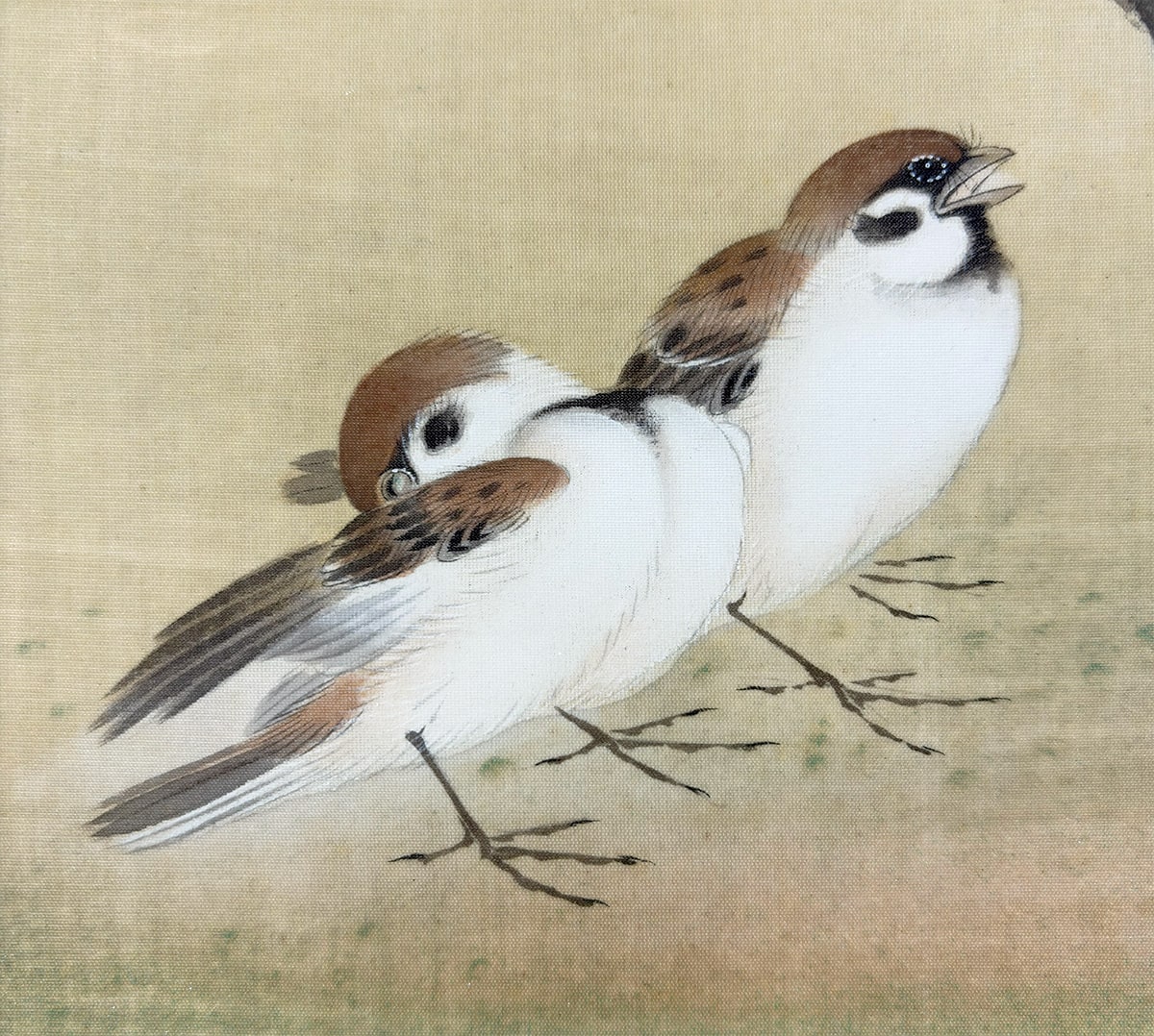 ●空を舞う一羽と、地に佇む二羽の雀たちの姿は、自然の中で交わされるささやかな対話のよう。逸陵先生の筆は、雀のふくらみや羽根の質感を細やかに捉え、見る者の心にやさしく響きます。