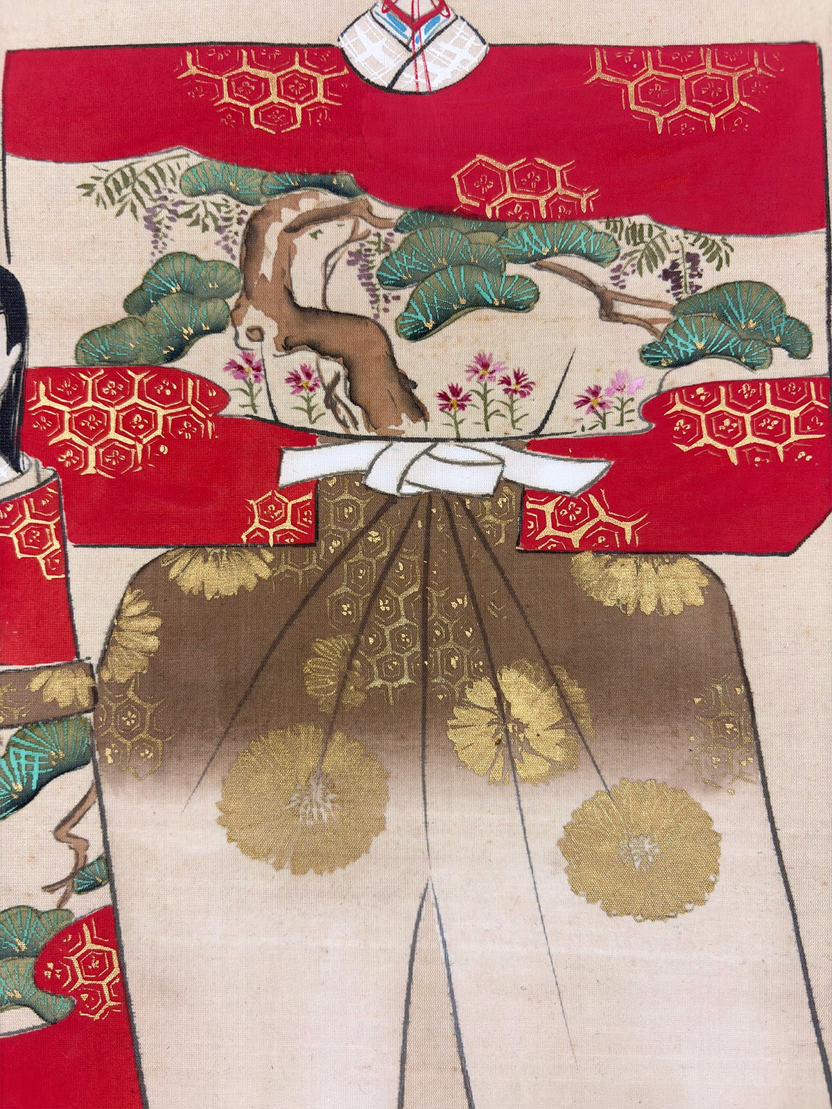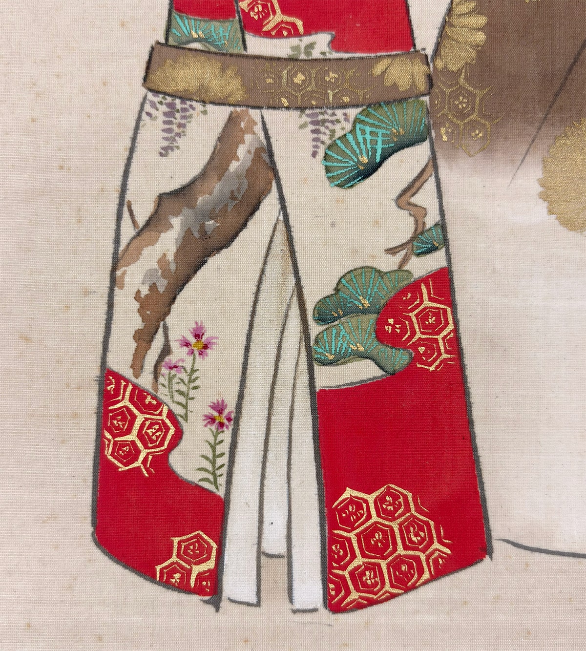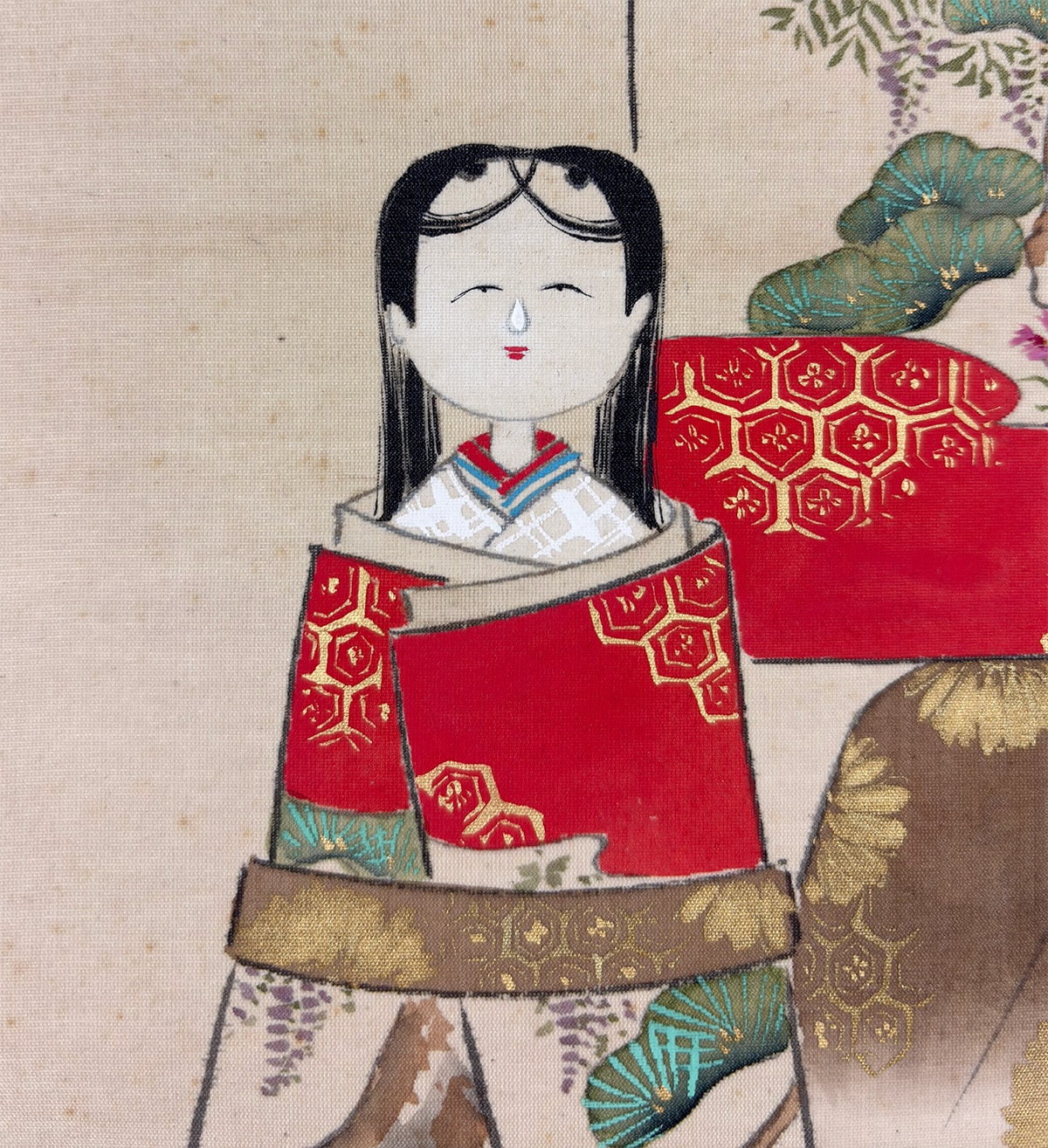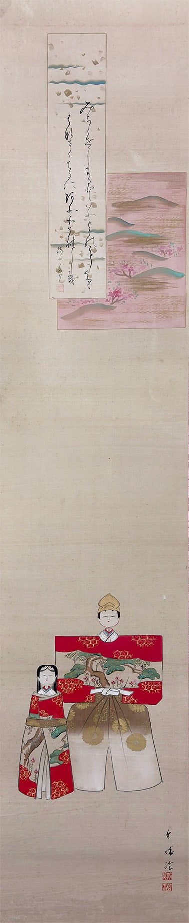 ●春の訪れを告げる節句の象徴、「立雛」を題材にした本作は、雅やかな装束に身を包んだ男雛・女雛が並び立つ姿を描いた、香城先生による端正な一幅です。背景には柔らかな山並みと咲き誇る桜が配され、季節の彩りとともに、古来より伝わる夫婦円満・家内安全の願いが込められています。