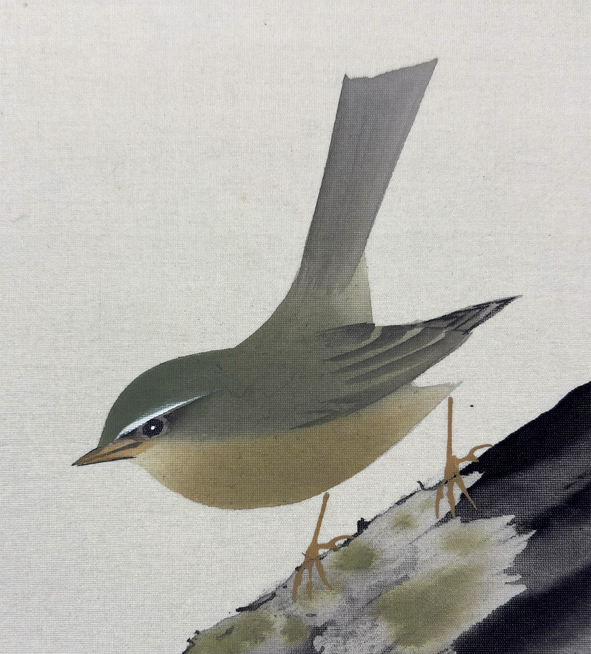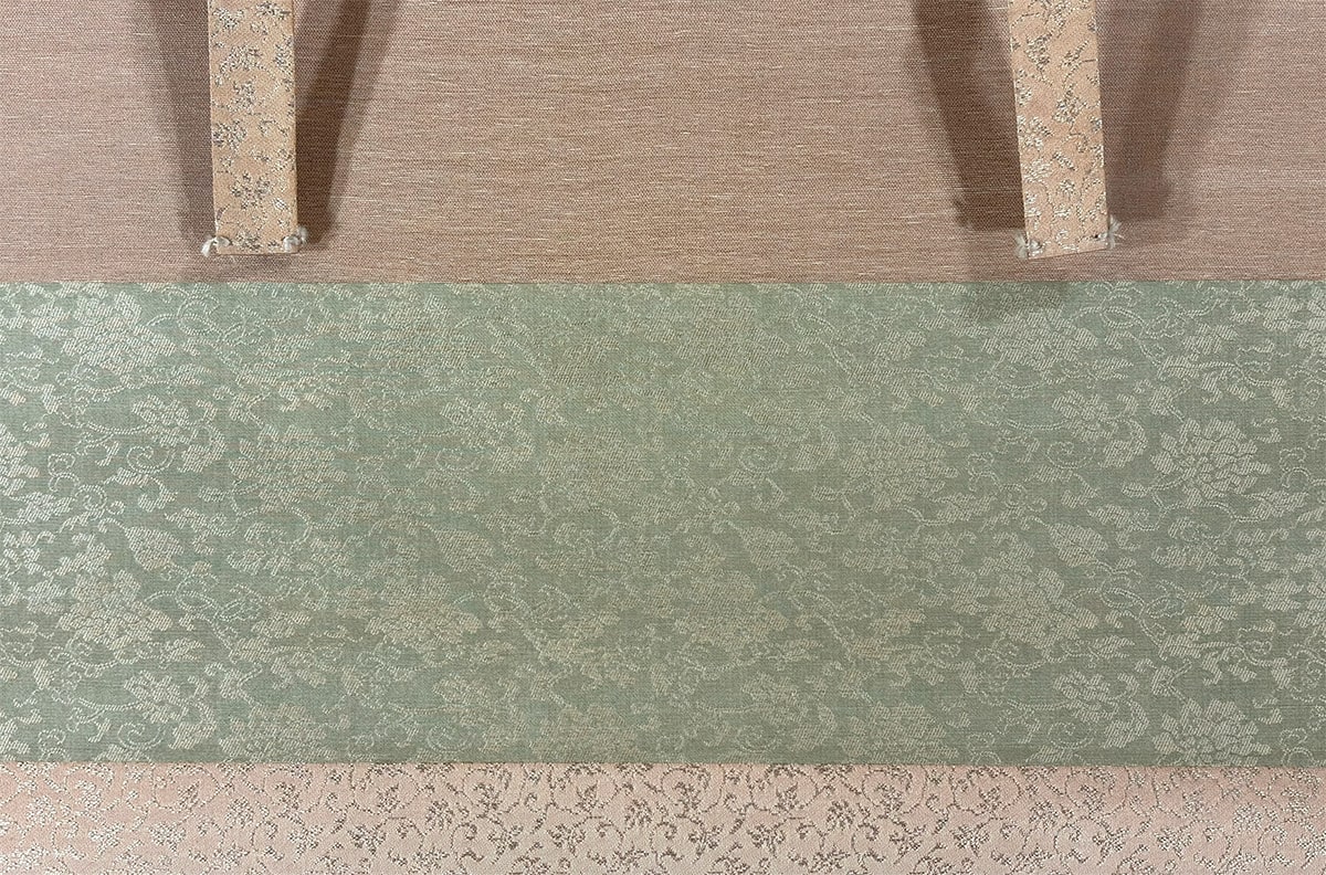 背景の淡いグラデーションが、静謐な空気感を醸し出し、花鳥画でありながら詩情豊かな余白を感じさせます。表具には上品な緑の花文様と、柔らかな桃色の裂地を用い、作品の優美さを引き立てています。