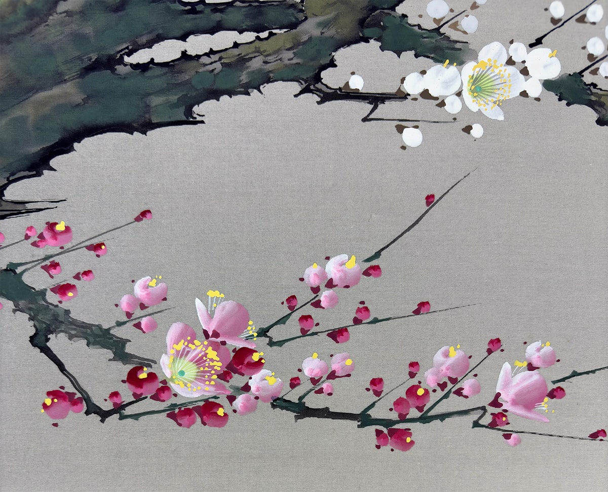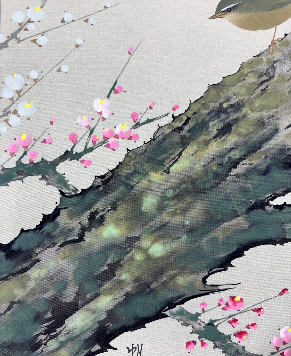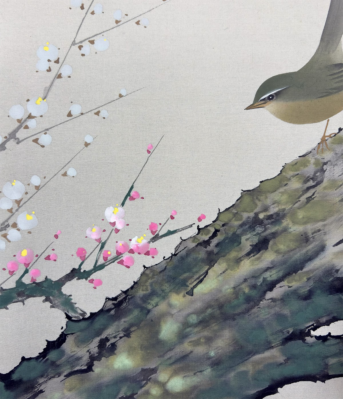 春の訪れを告げる梅の花と、古来「春告鳥」と称される鴬(うぐいす)を描いた、季節感あふれる一幅です。山田帆丘先生は、自然の機微を繊細に捉えることで知られる画家で、本作でも梅の古木の力強さと、鴬の柔らかな佇まいが見事に調和しています。