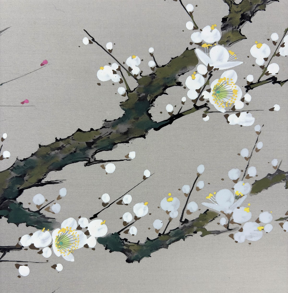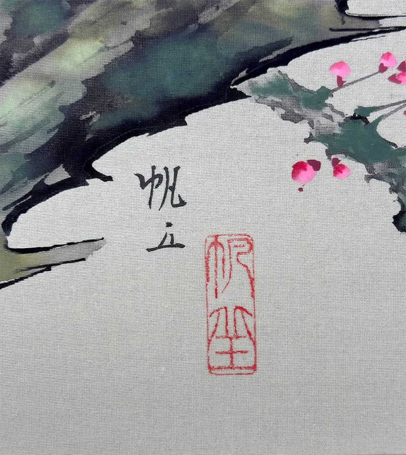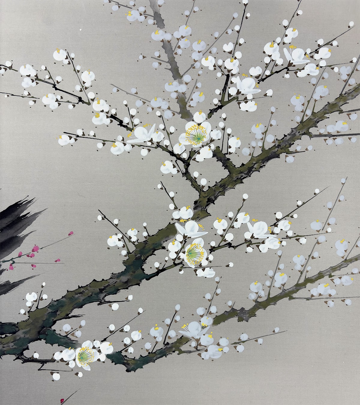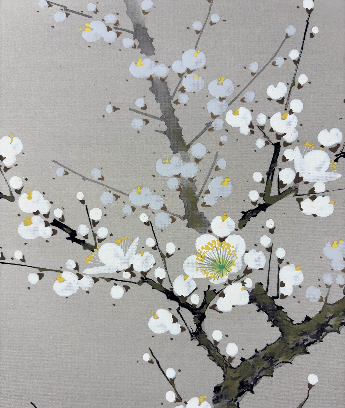 春の訪れを告げる梅の花と、古来「春告鳥」と称される鴬(うぐいす)を描いた、季節感あふれる一幅です。山田帆丘先生は、自然の機微を繊細に捉えることで知られる画家で、本作でも梅の古木の力強さと、鴬の柔らかな佇まいが見事に調和しています。