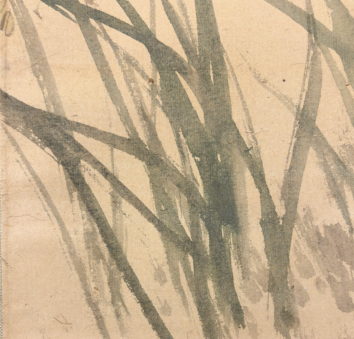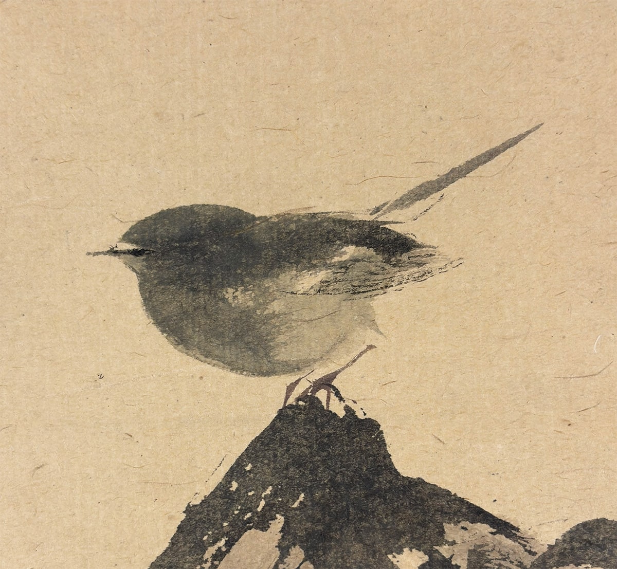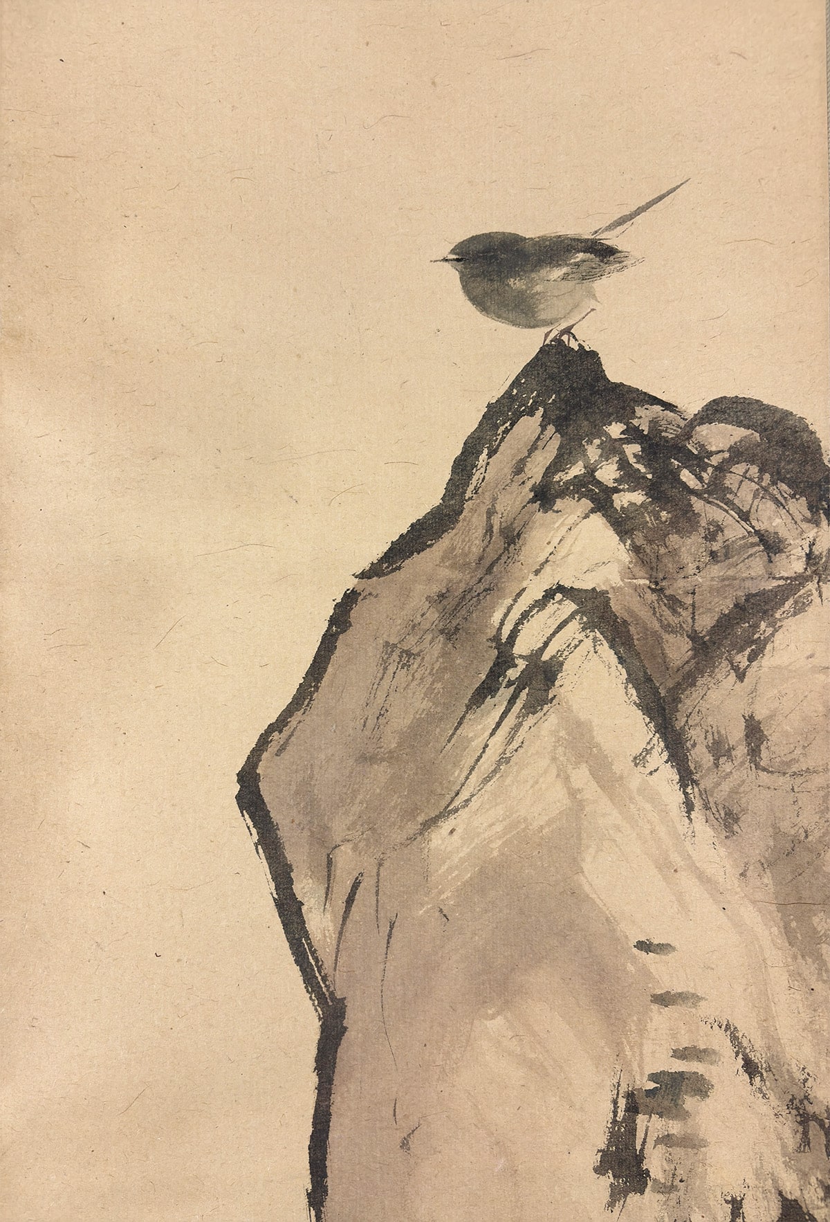 ●画面の中心には、墨の濃淡でしっかりと描かれた岩があり、その上に一羽の鴬がそっととまっています。鴬は体を少しふくらませ、まだ冷たい空気の中でじっと春を待つような姿をしています。