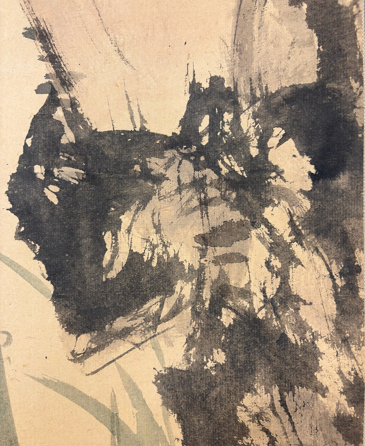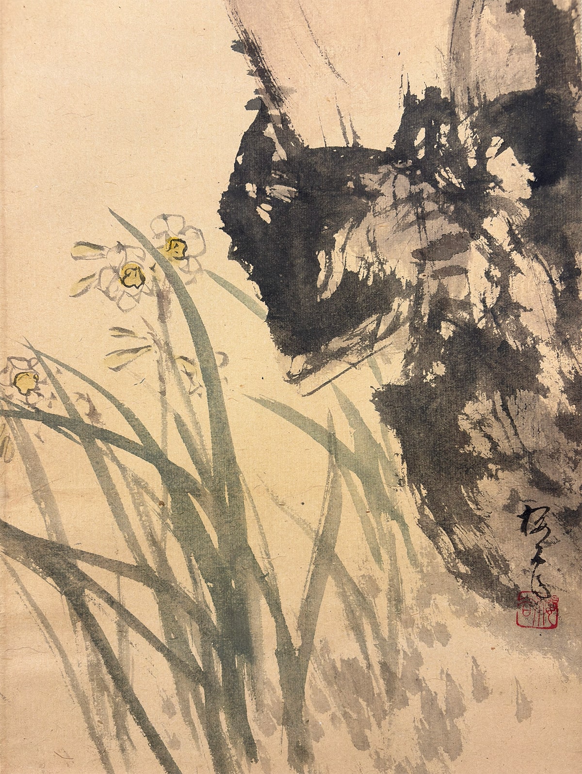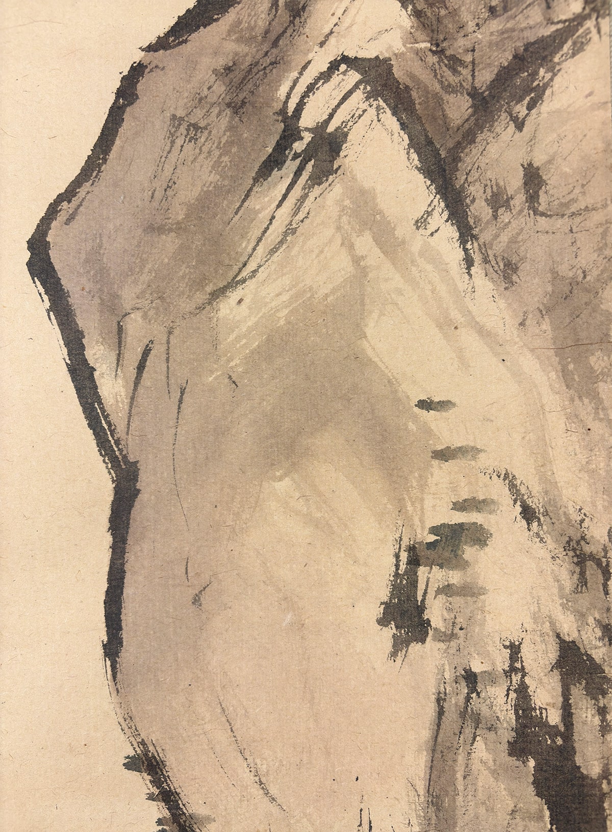 ●画面の中心には、墨の濃淡でしっかりと描かれた岩があり、その上に一羽の鴬がそっととまっています。鴬は体を少しふくらませ、まだ冷たい空気の中でじっと春を待つような姿をしています。