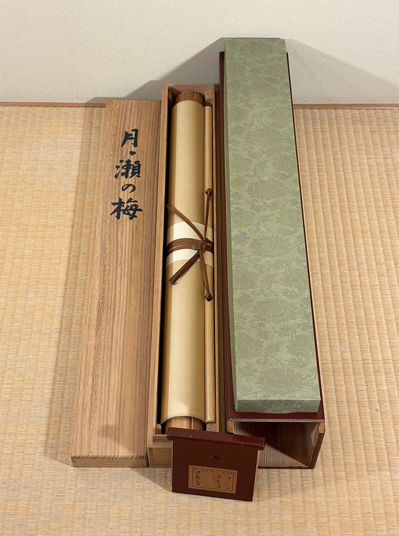 ●本作は、伝統的な日本画の風情を大切にしつつ、表装には現代感覚を取り入れた創作仕立てを採用しています。落ち着いた色調とすっきりとした意匠が、和室だけでなく、モダンな住宅や新築の空間にも自然に馴染むのが大きな魅力です。床の間はもちろん、玄関ホールやリビングの一角にも品よく調和し、季節の彩りをさりげなく添えてくれます。
