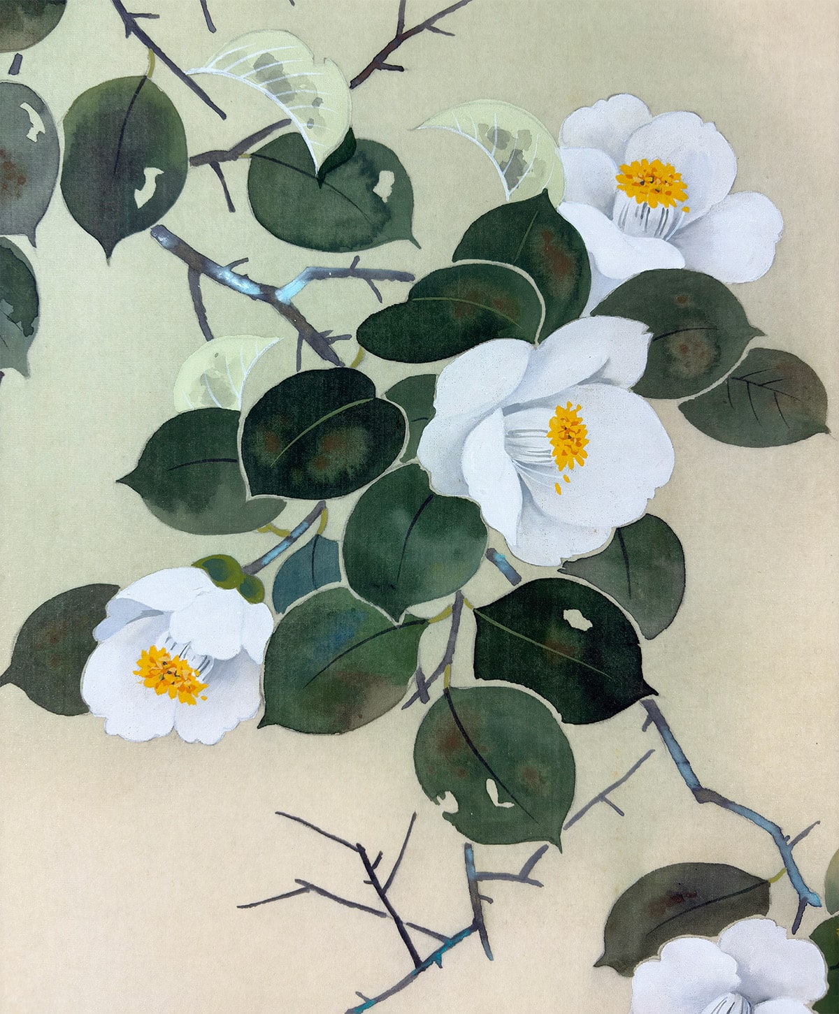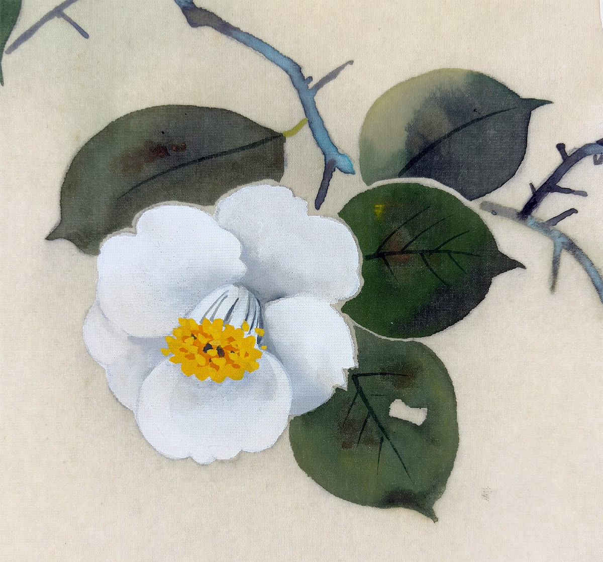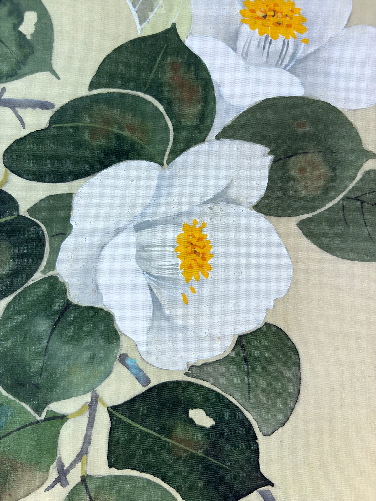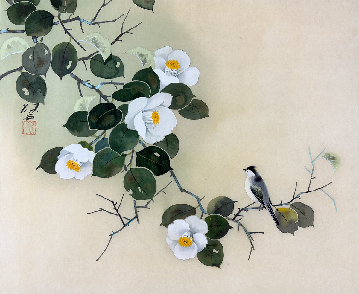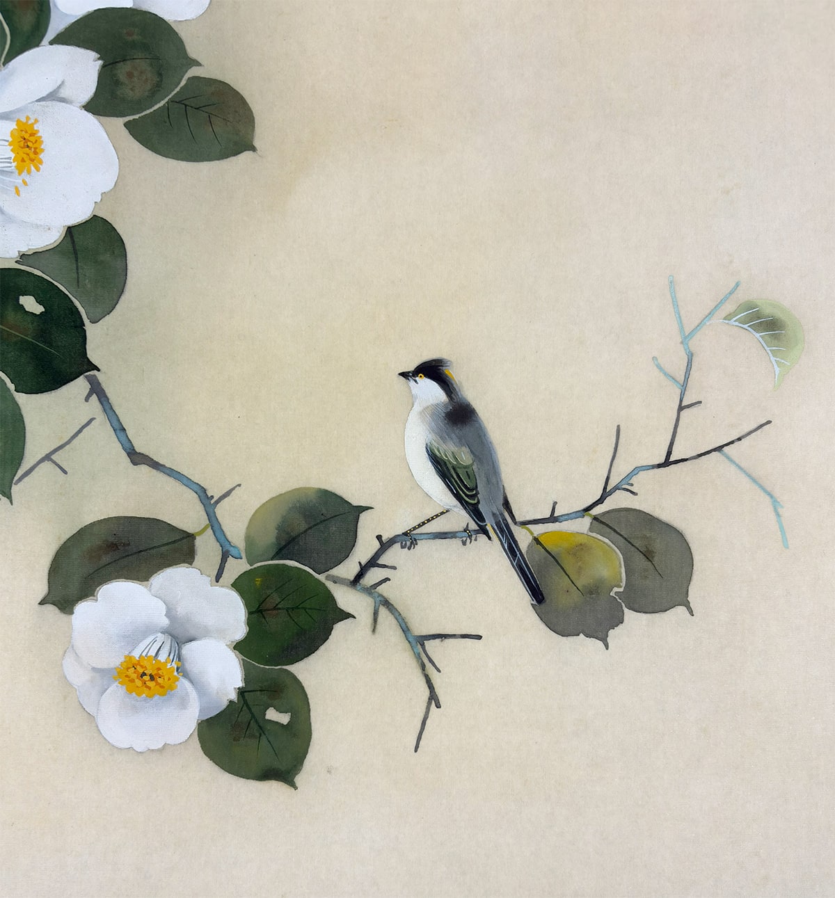 ●白椿の清冽な花姿に、静かに寄り添う小禽、冬から早春にかけての静謐な自然美を、写実と余白の妙で描き出した一幅です。