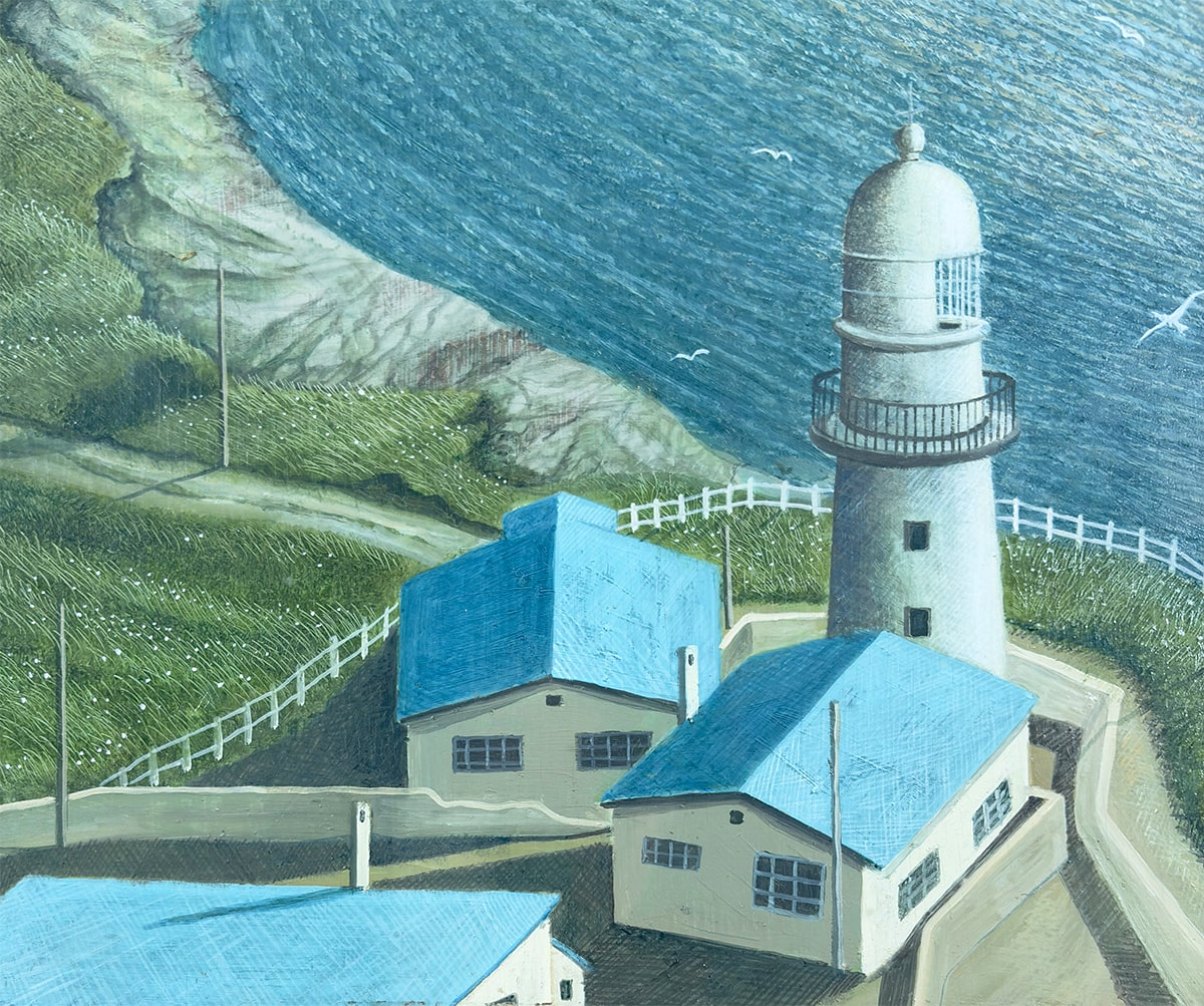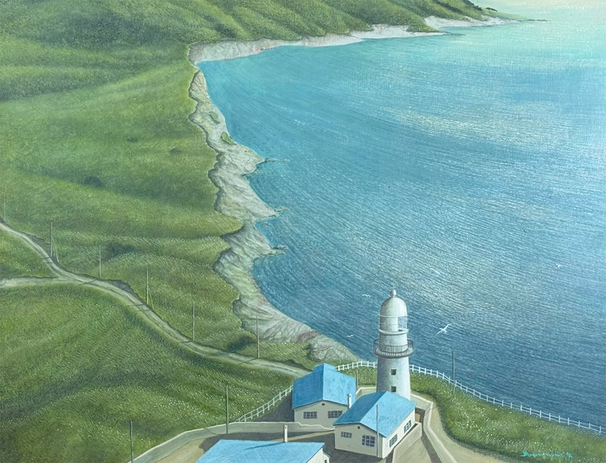 ●白亜の灯台と青屋根の家々が並ぶ岬の風景を、上代誠先生が油彩ならではの深い色調と重厚なマチエールで描き上げた一作です。