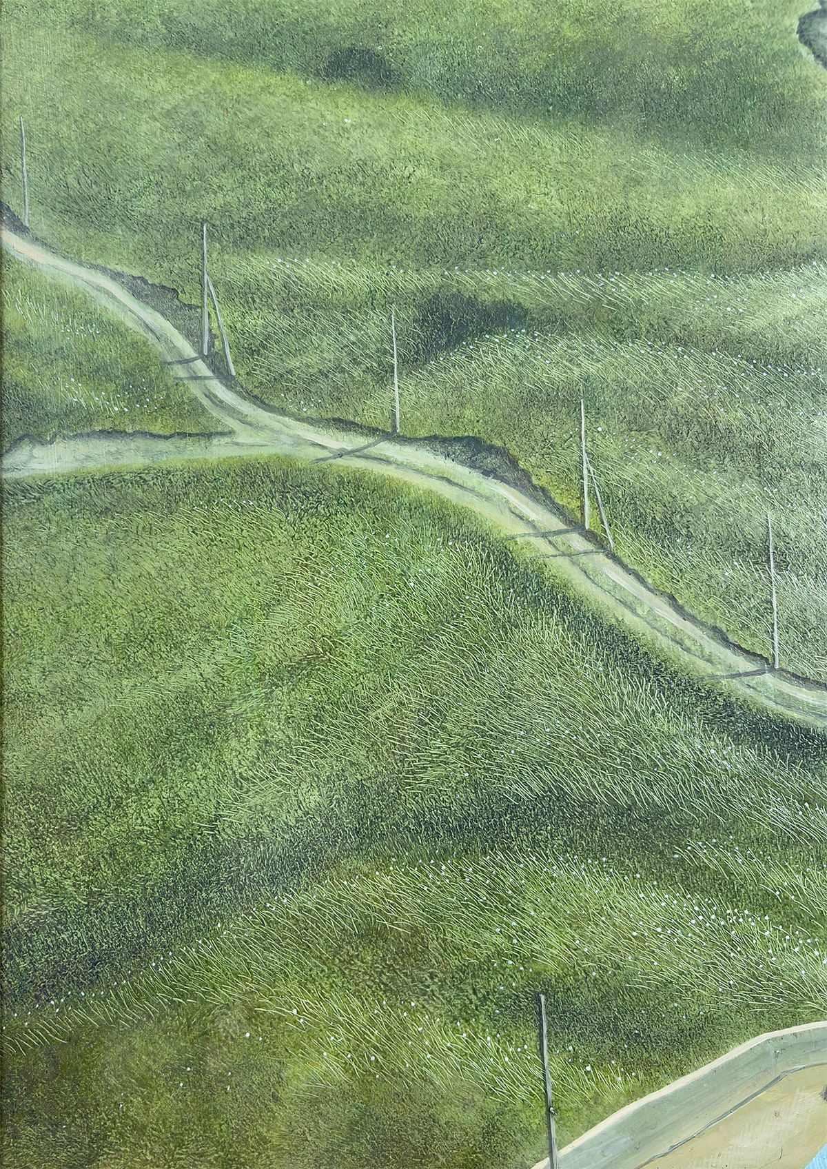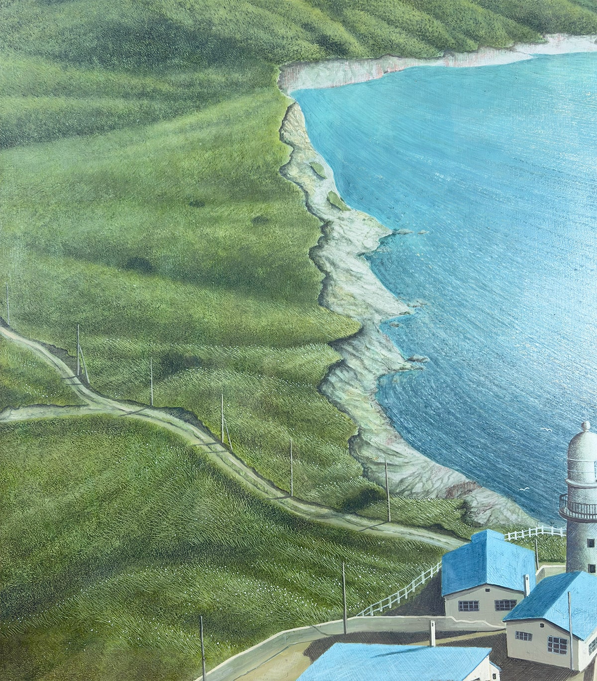 ●油絵具の厚みを生かした筆致は、夏の陽光に照らされた草地のきらめきや、海面の奥行きあるブルーを豊かに表現し、まるで風が通り抜けるような清涼感をもたらします。