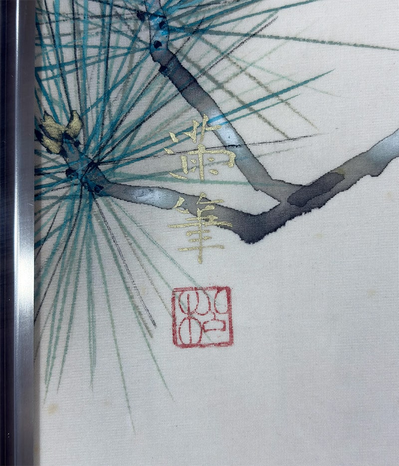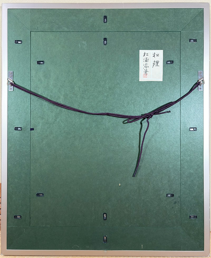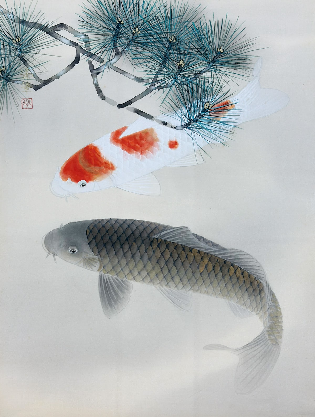 ●松浦満先生による本作「松鯉」は、松と鯉という吉祥の組み合わせを、静謐で品格ある筆致でまとめ上げた一幅です。