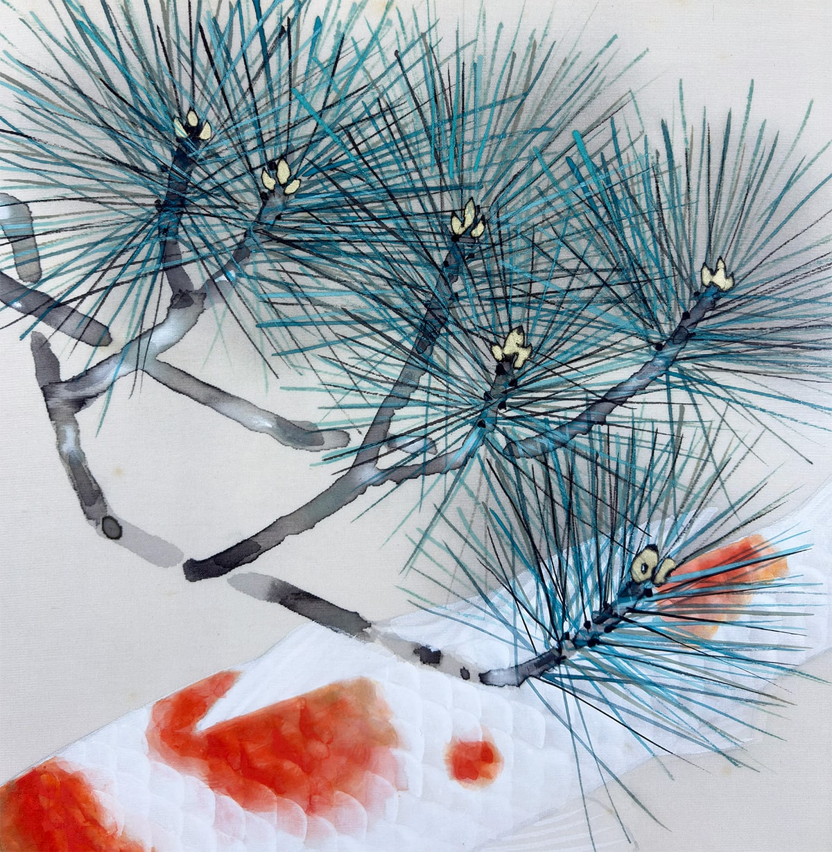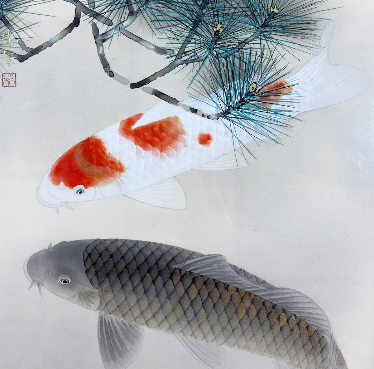 画面上部には、長寿・不変・守護を象徴する松の枝が伸び、下には優雅に泳ぐ二匹の鯉が描かれています。白地に朱を帯びた錦鯉と、落ち着いた墨色の鯉が対をなし、調和・夫婦円満・繁栄を象徴する構図となっています。
