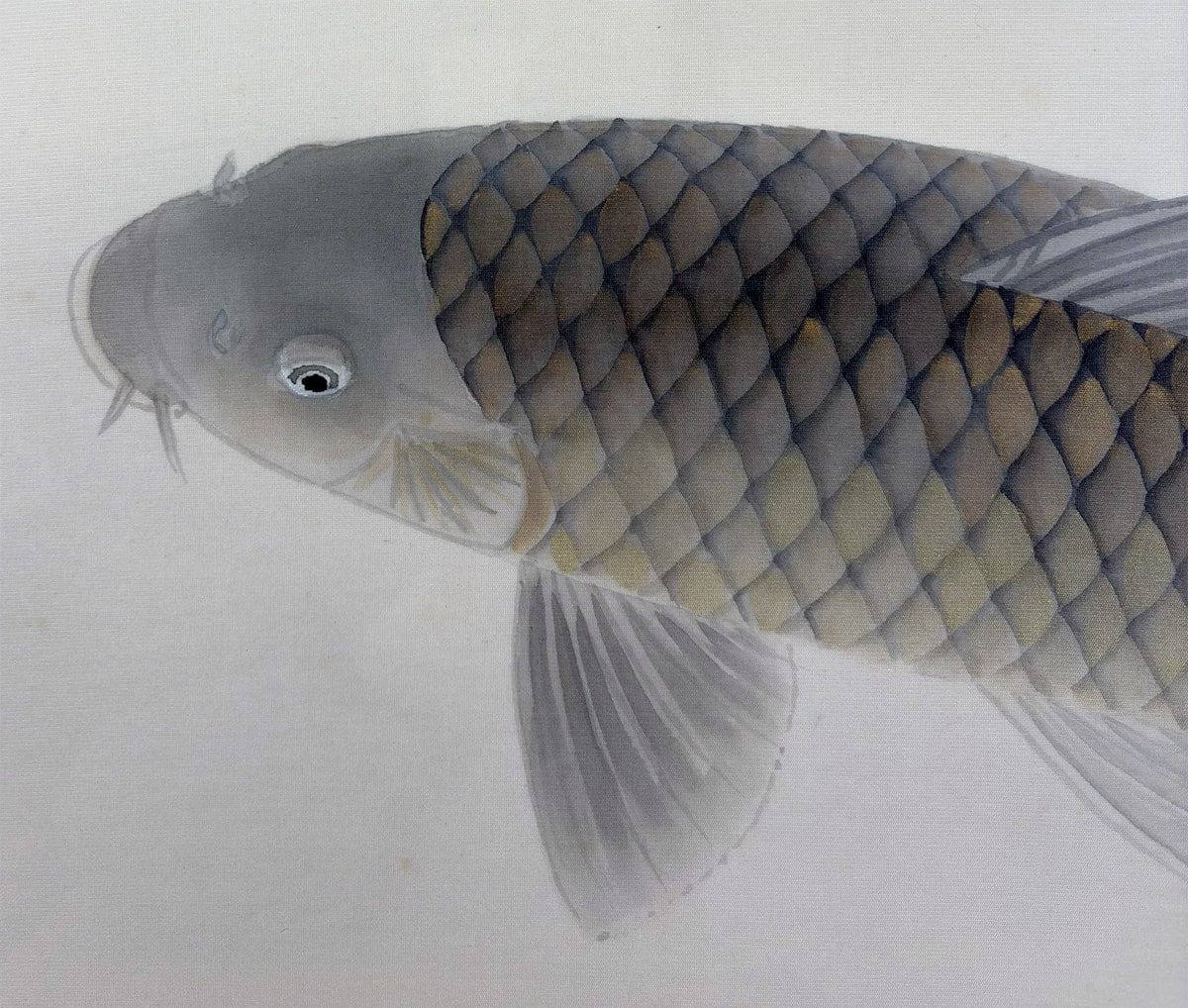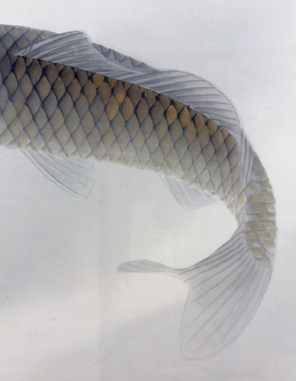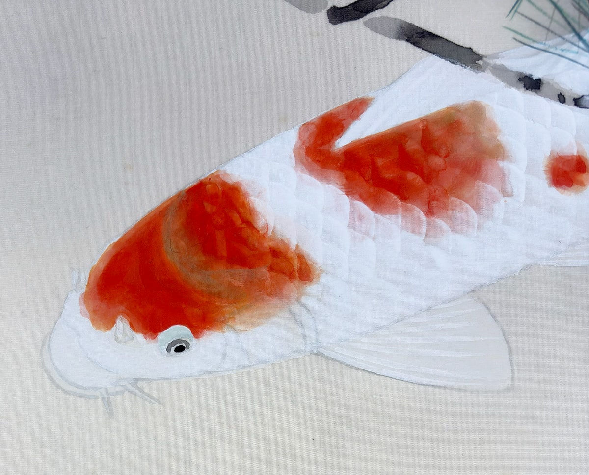 満先生らしい、柔らかな色面と繊細な線の運びが生きており、鯉の体躯の張りや水中の静かな気配まで感じられる仕上がりです。