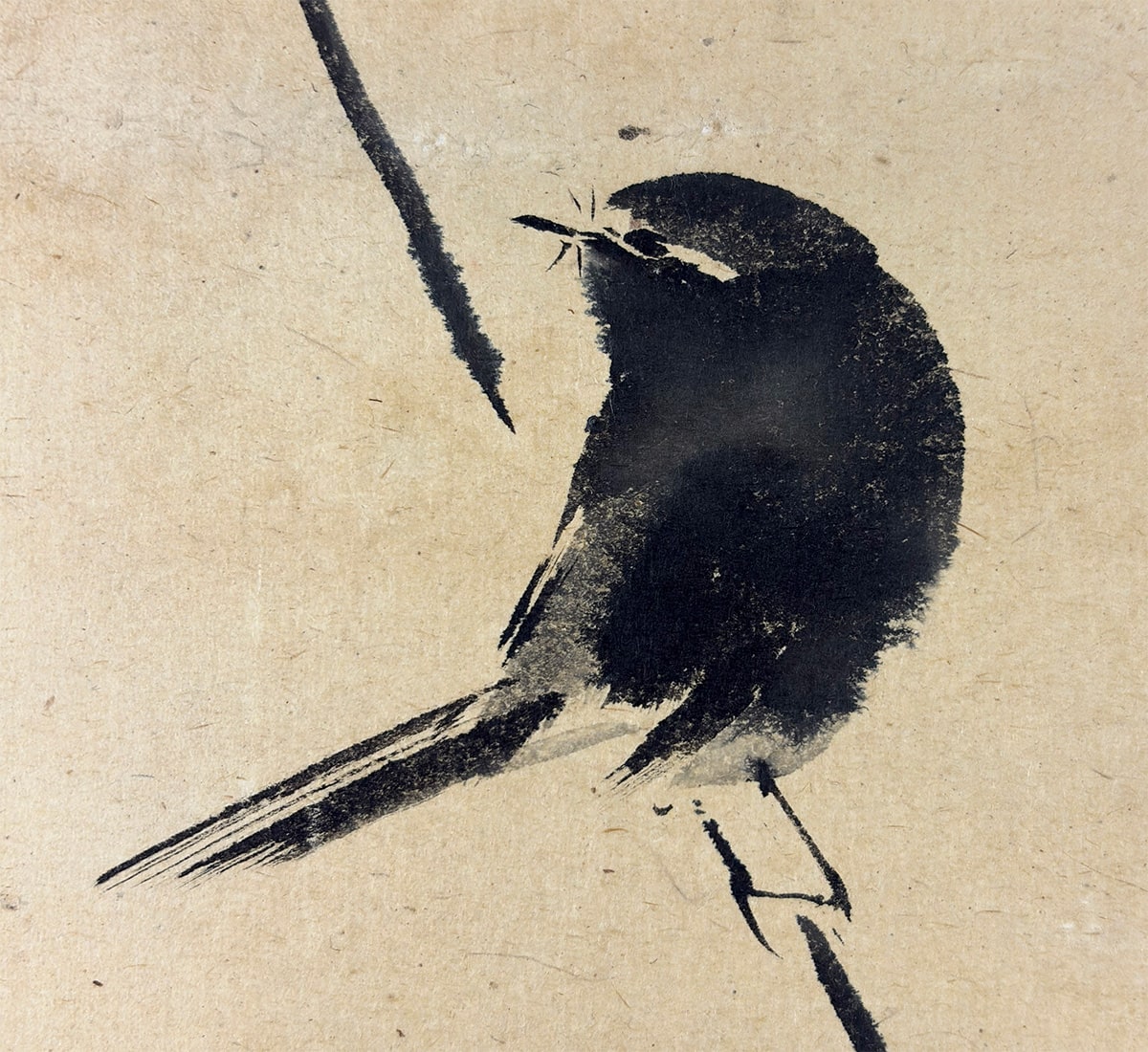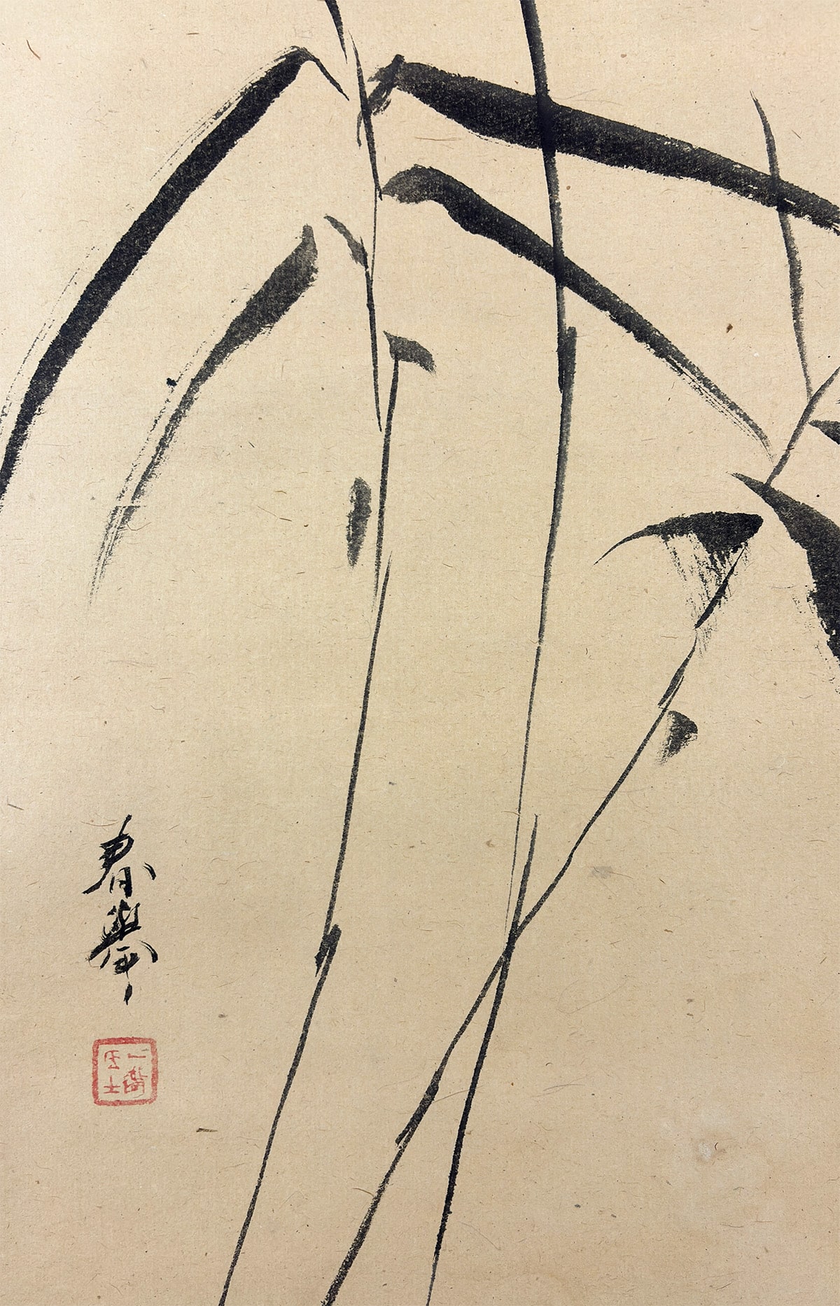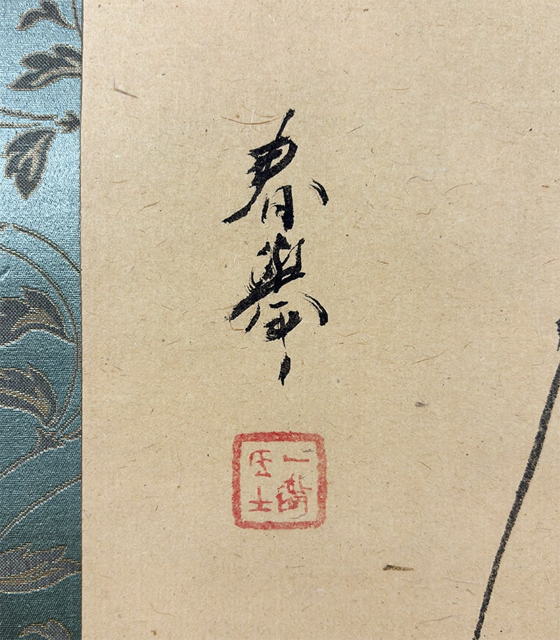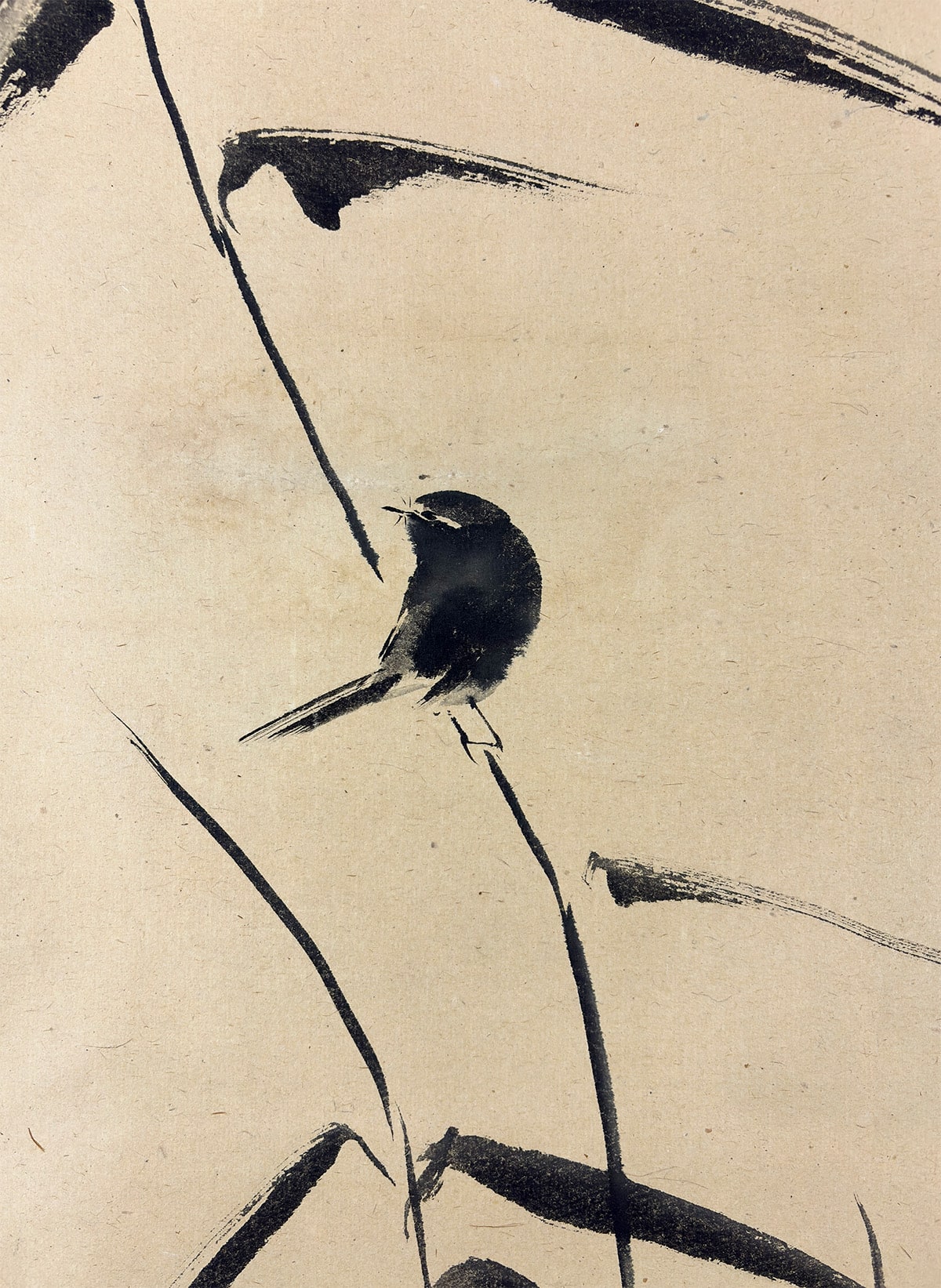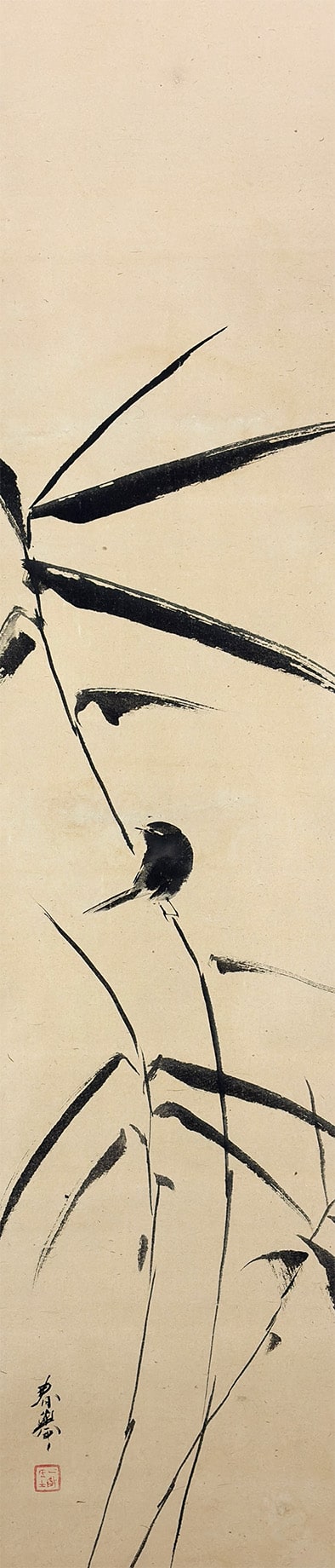 ●墨の濃淡だけで笹のしなやかさと風の気配を捉え、そこに一羽の鴬が静かに佇む姿が描かれています。余白を活かした構図は、春挙先生らしい清新な美しさを感じさせます。