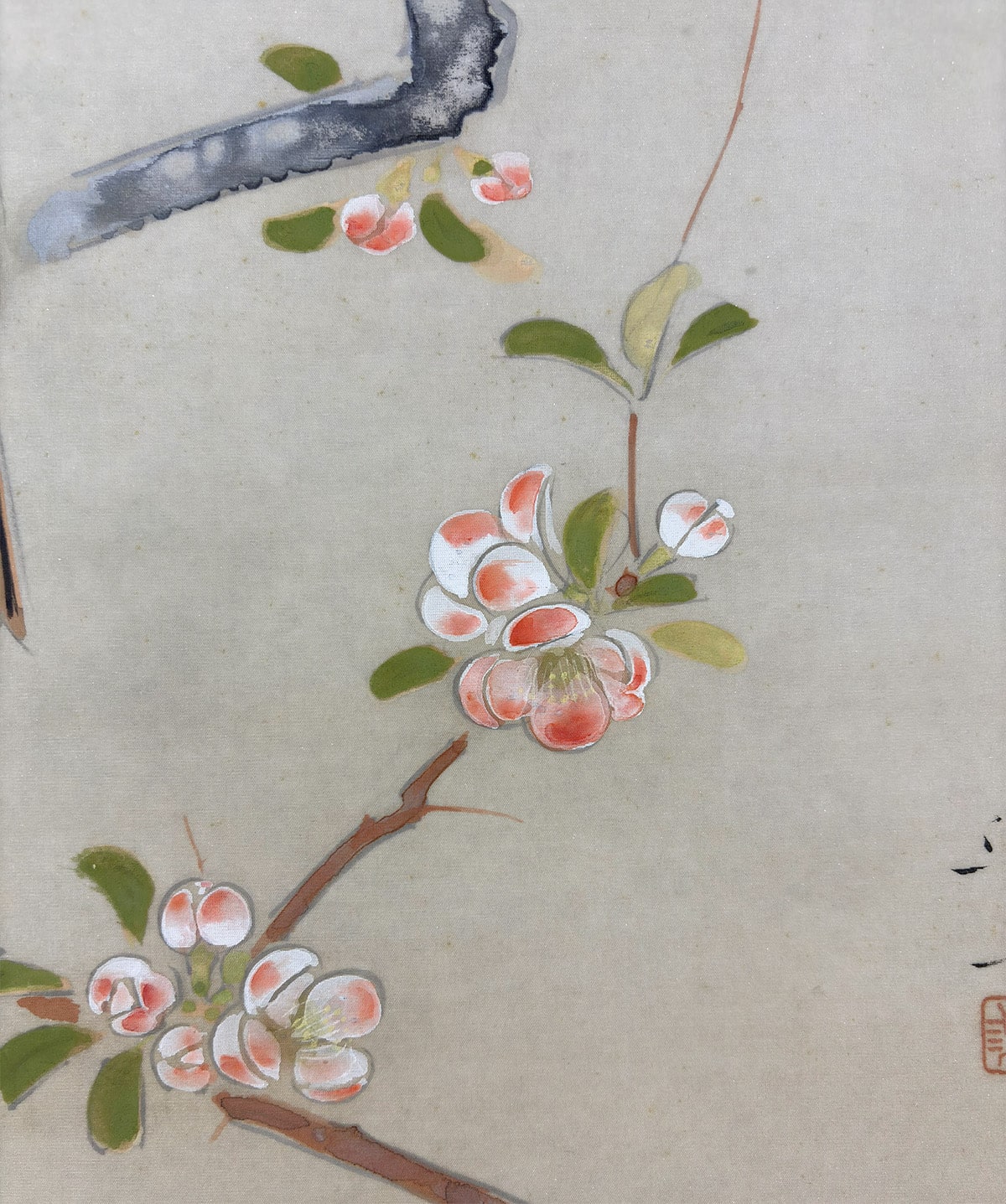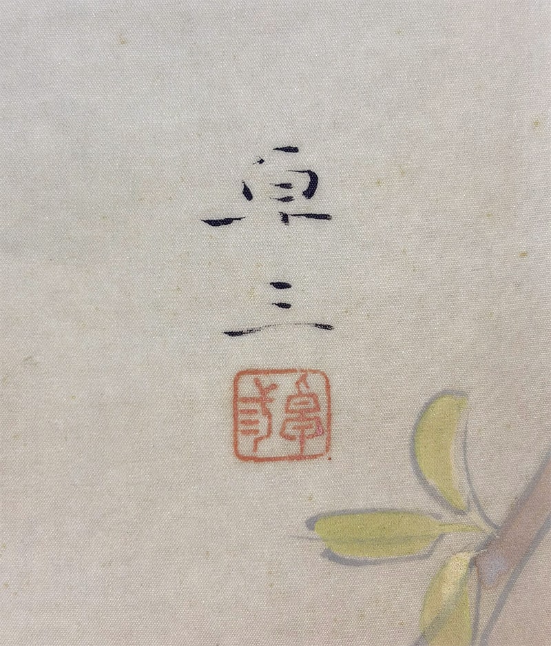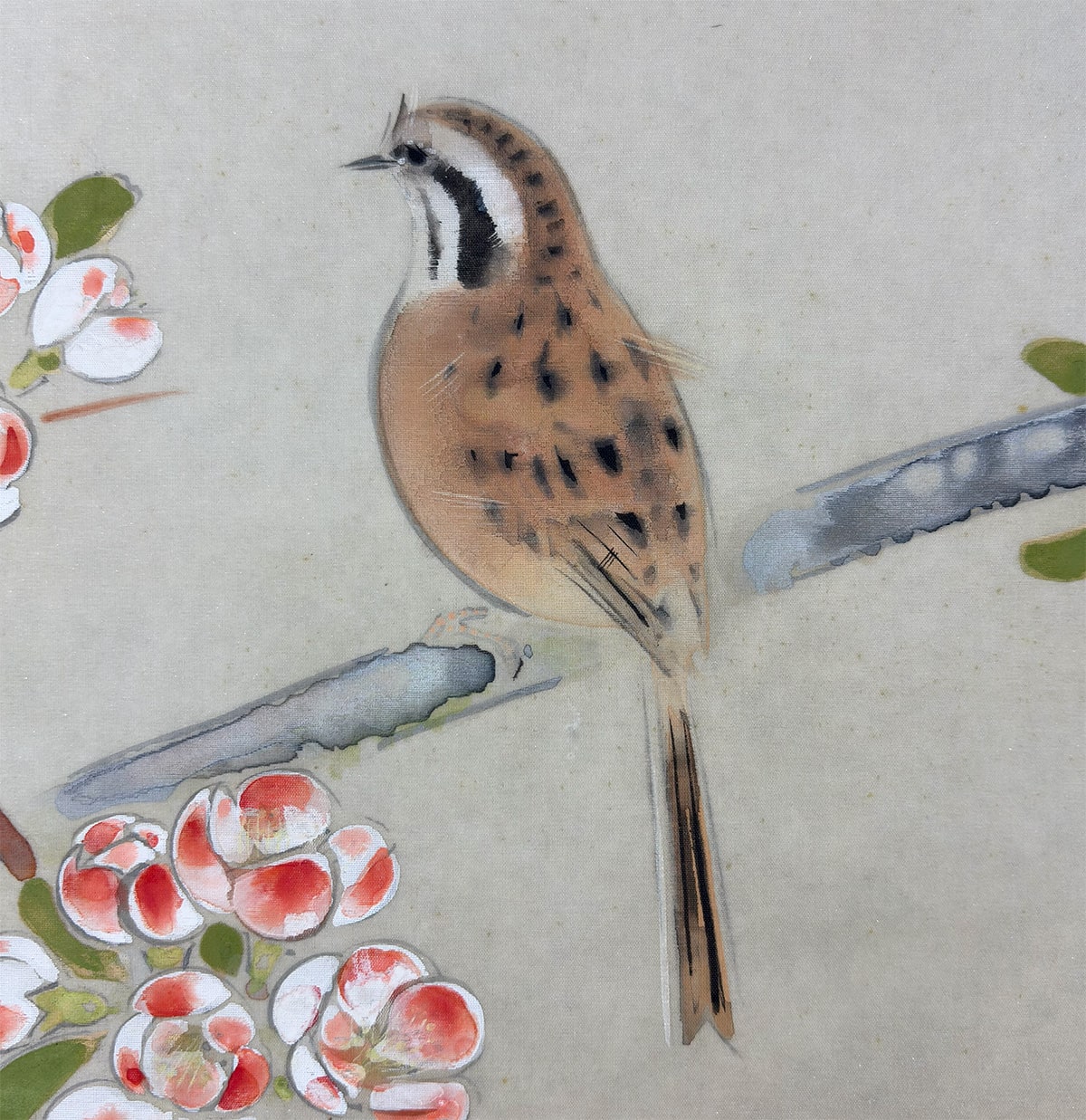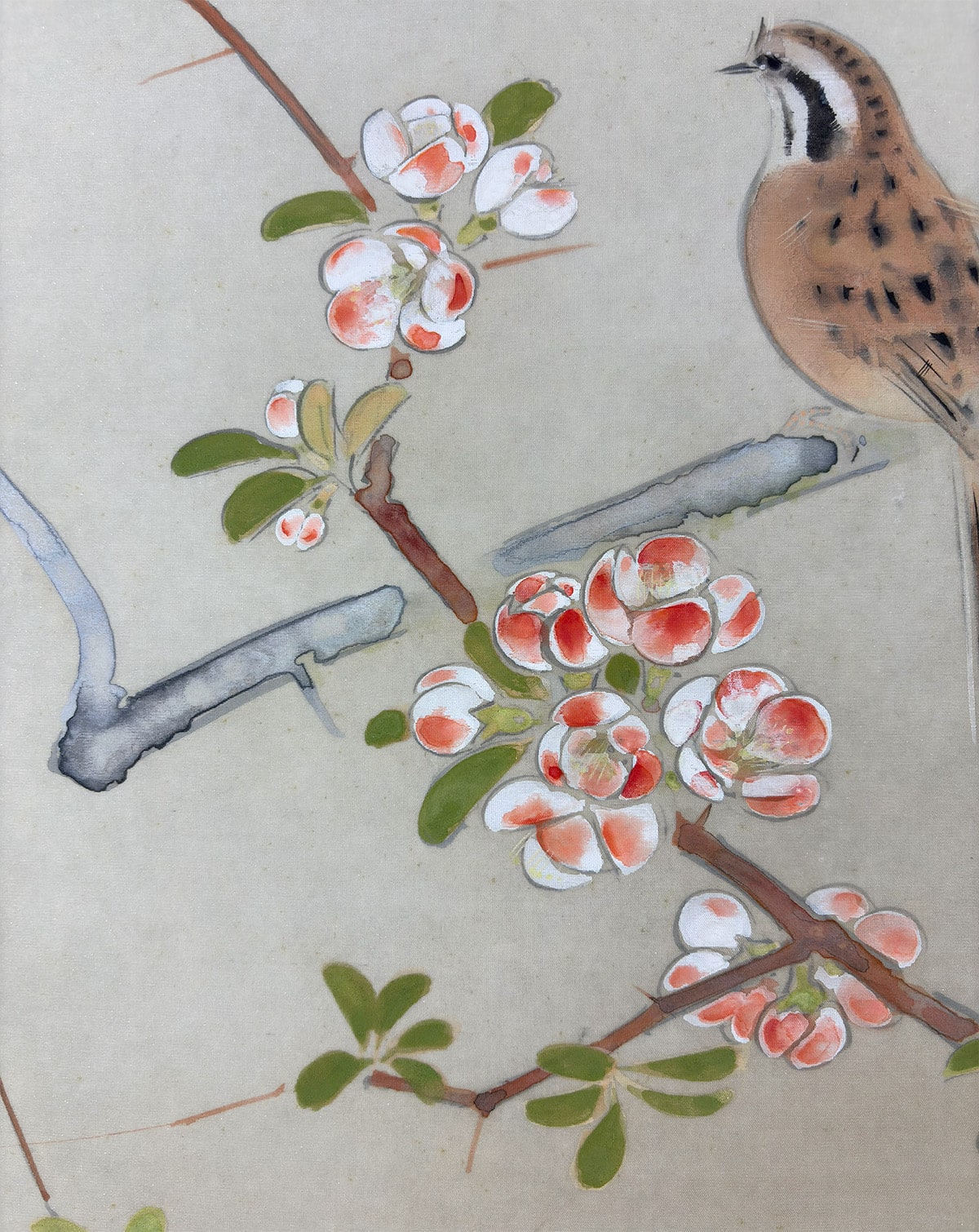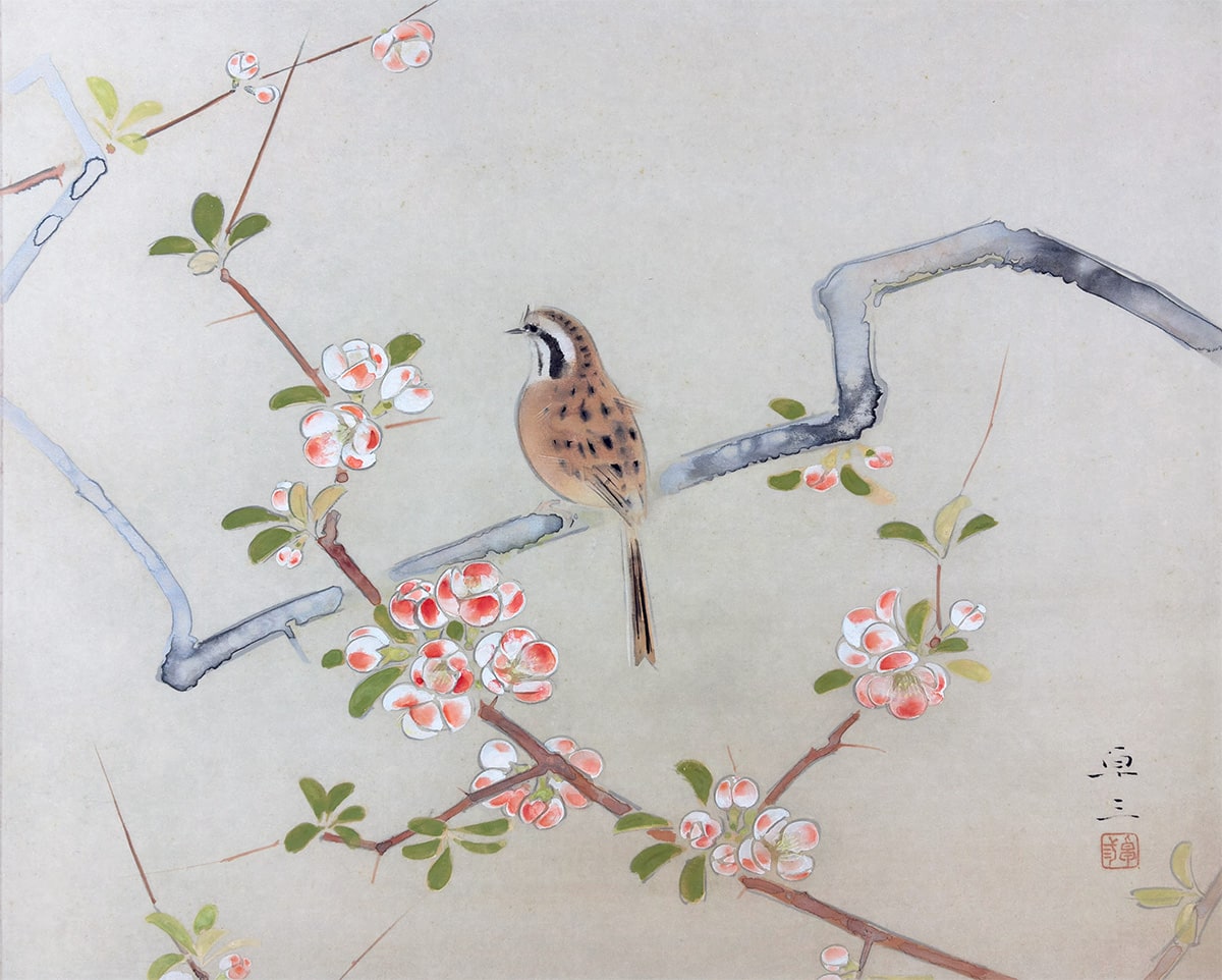 ●《麗春》は、早春に咲く木瓜(ぼけ)の花枝に、白い頬が愛らしい頬白(ほおじろ)がそっと寄り添う、清雅な花鳥画です。柔らかな筆致で描かれた木瓜の花は光を含んだようにふんわりと開き、そこに佇む頬白の姿は静かな生命感を湛えています。卓三先生らしい端正な構図と繊細な色づかいが調和し、眺めるほどに心を和ませる一幅です。