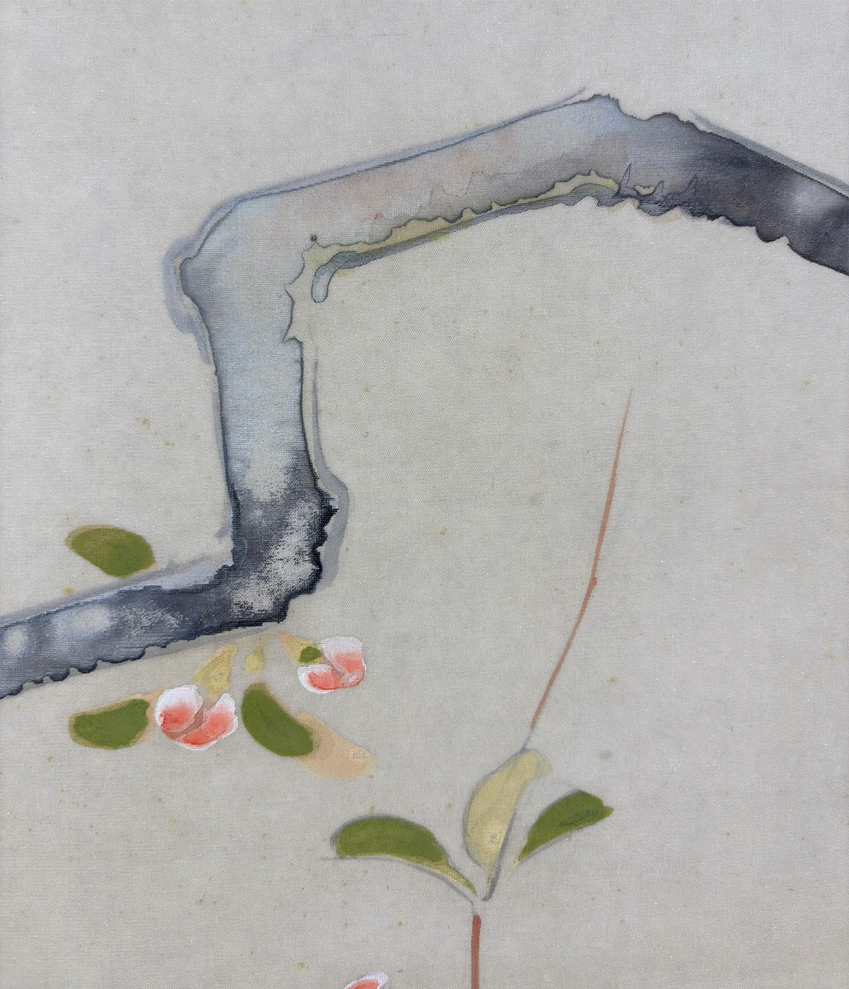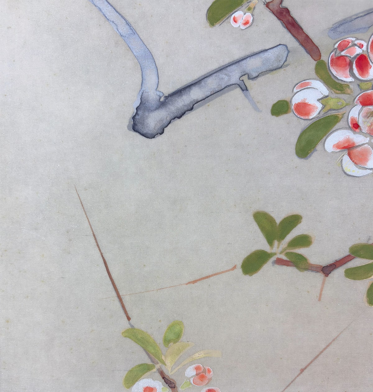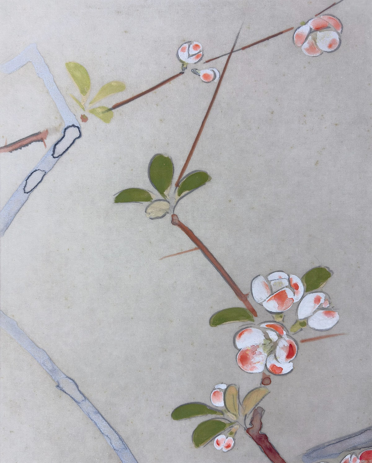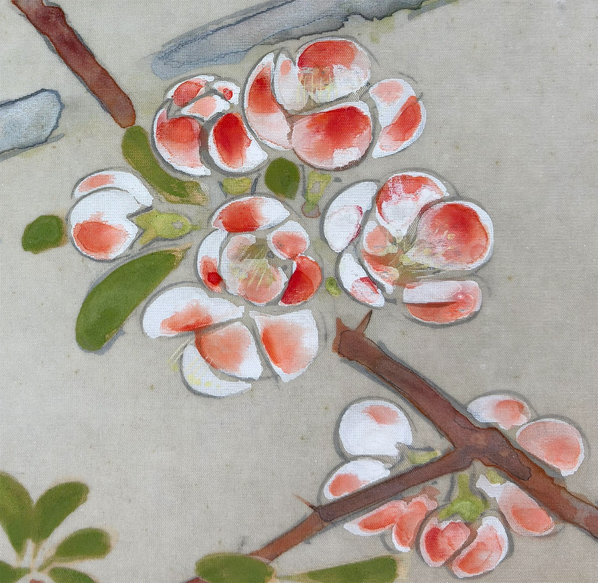 ●《麗春》は、早春に咲く木瓜(ぼけ)の花枝に、白い頬が愛らしい頬白(ほおじろ)がそっと寄り添う、清雅な花鳥画です。柔らかな筆致で描かれた木瓜の花は光を含んだようにふんわりと開き、そこに佇む頬白の姿は静かな生命感を湛えています。卓三先生らしい端正な構図と繊細な色づかいが調和し、眺めるほどに心を和ませる一幅です。