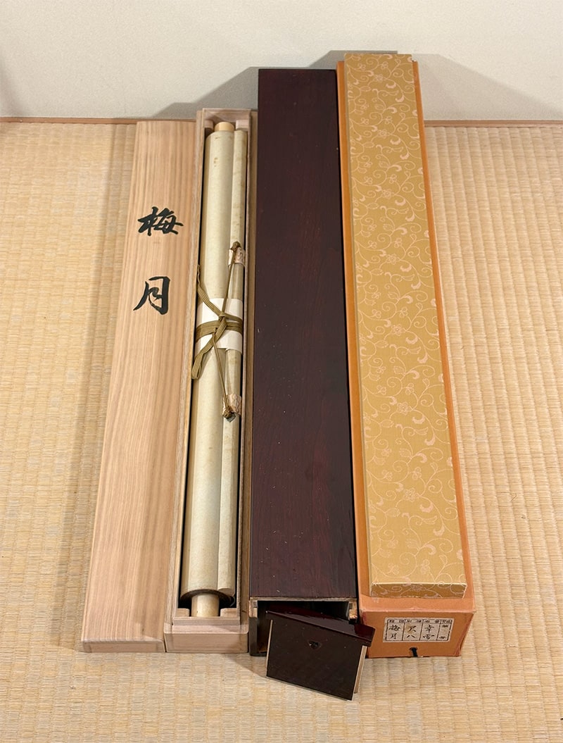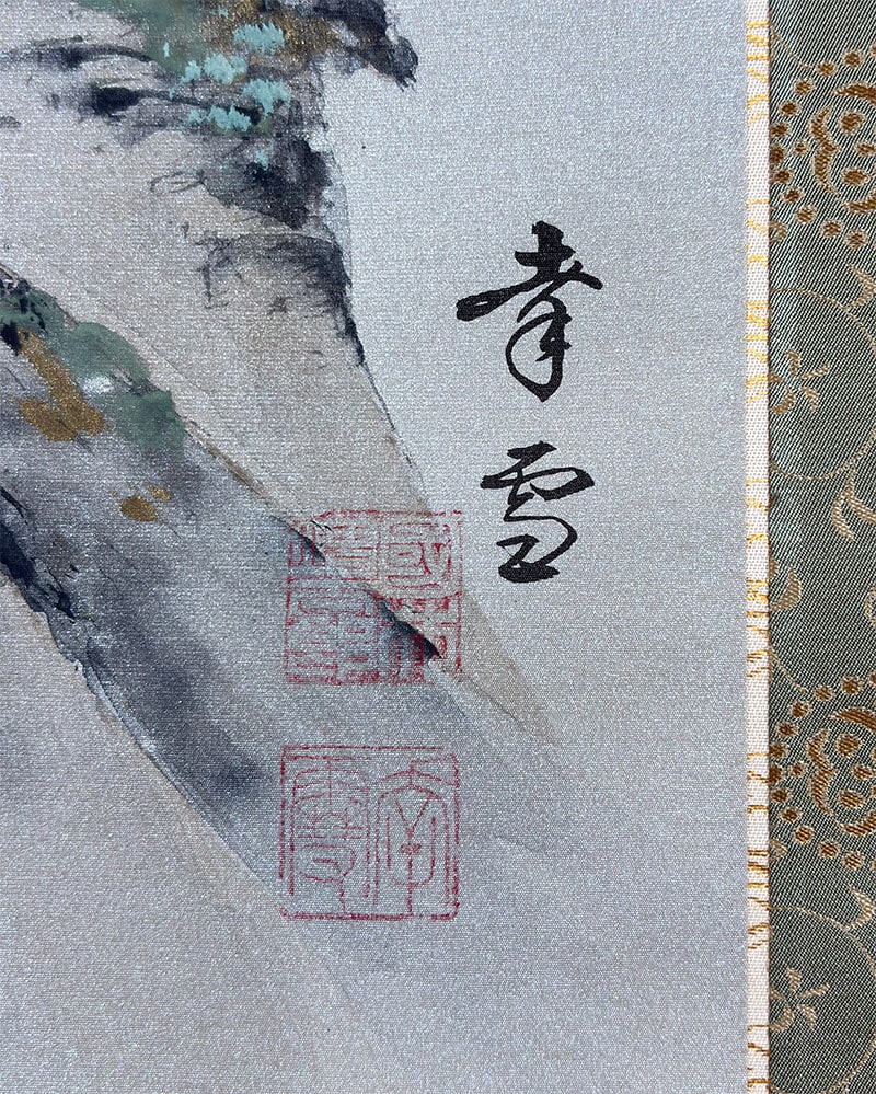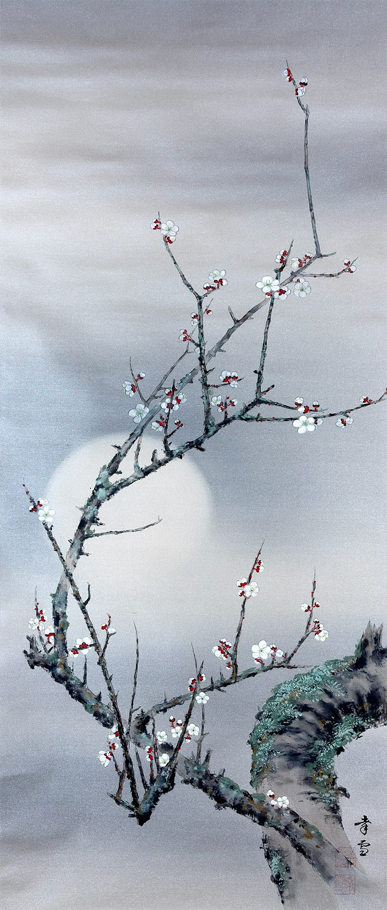 ●国井幸雪による「梅月」は、春の訪れを告げる白梅と、静かに浮かぶ月を題材にした、気品あふれる掛軸です。