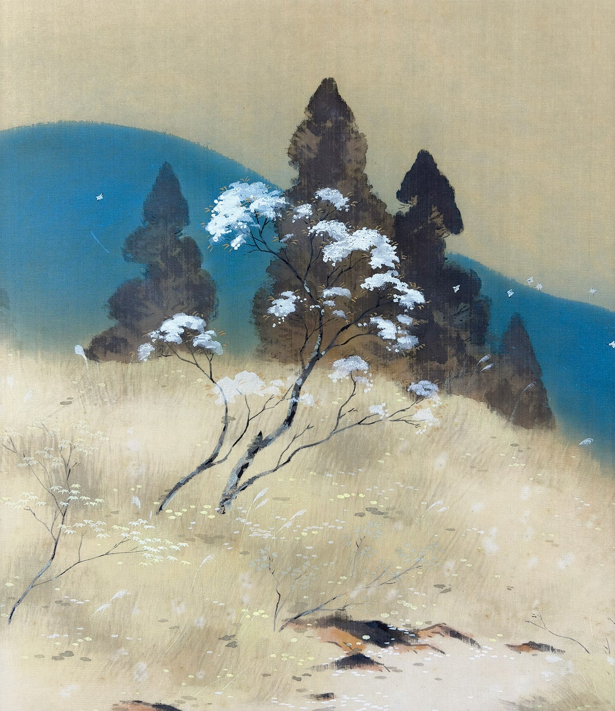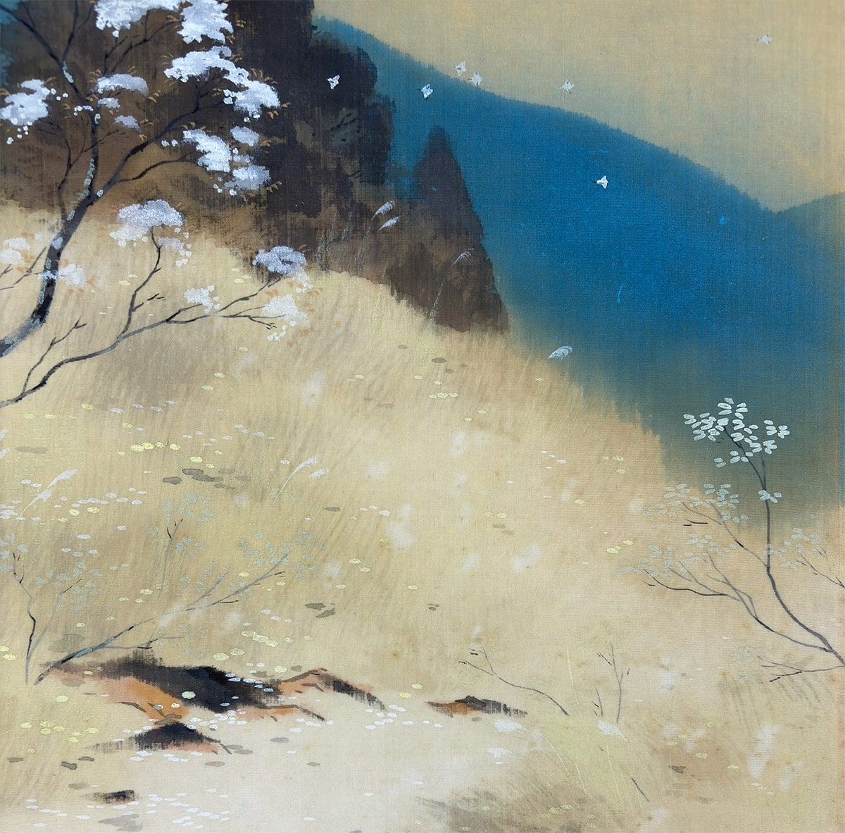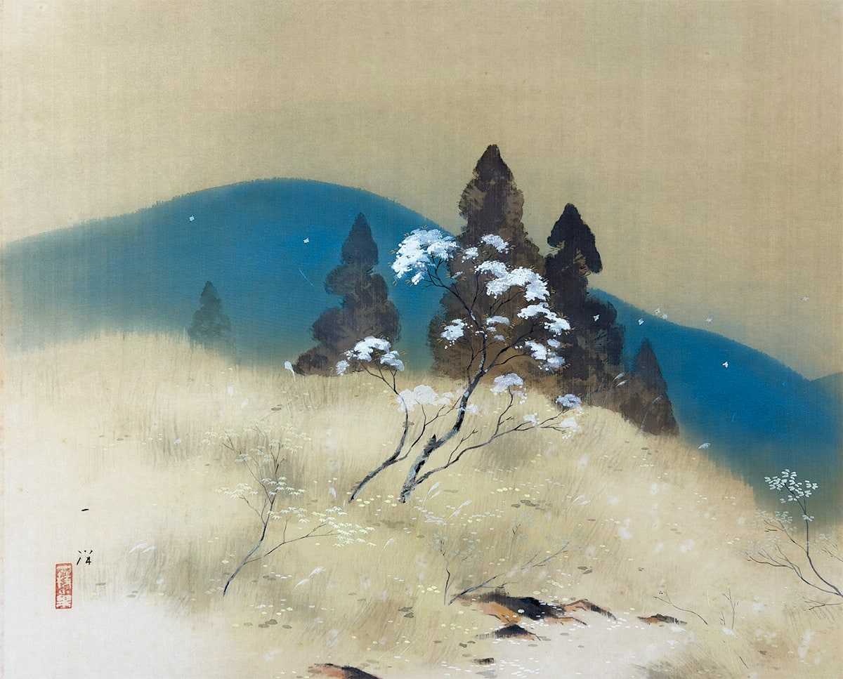 ●この作品は、冬の名残と春の気配がそっと寄り添う、穏やかな峠の風景を描いた一幅です。