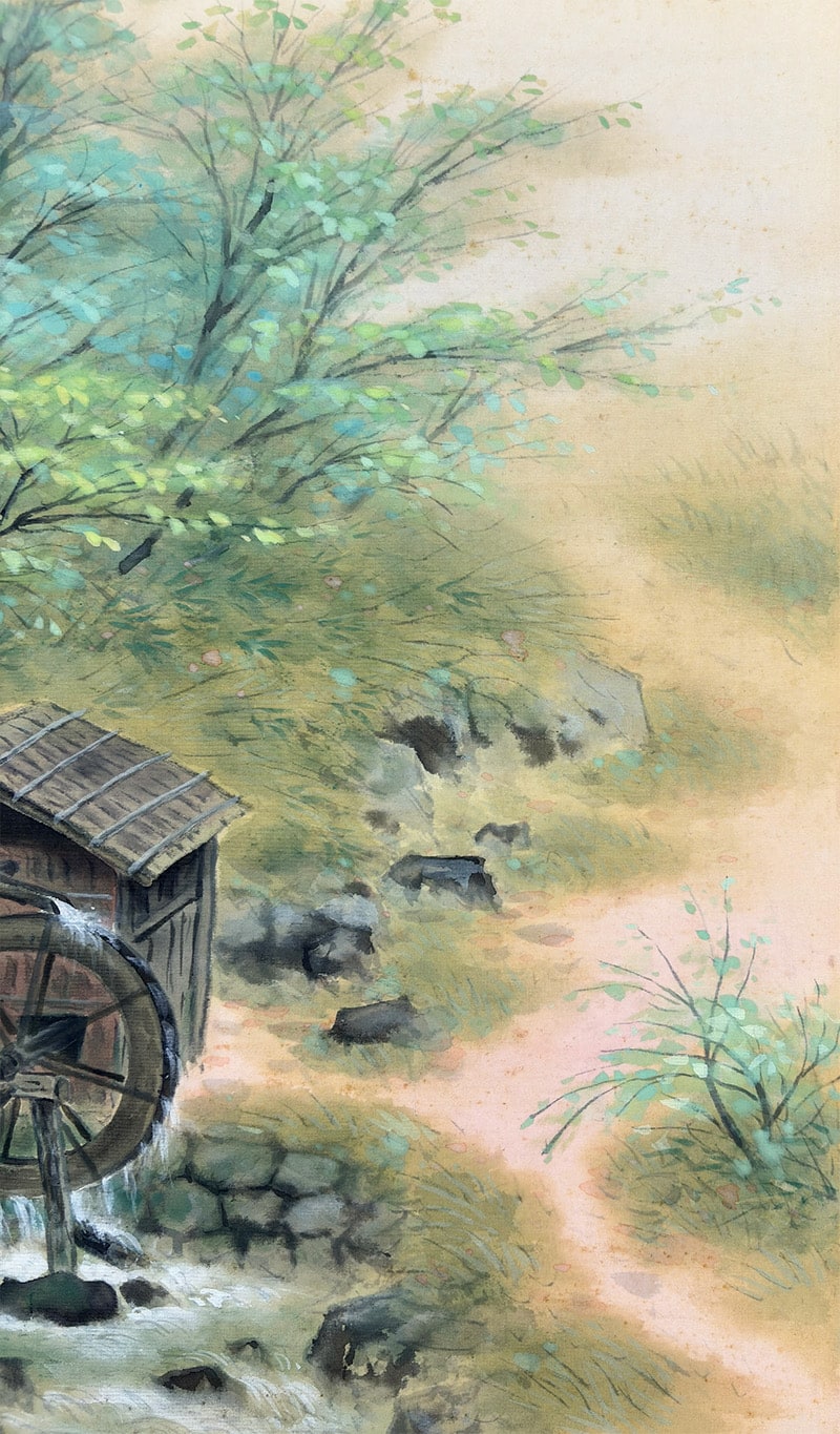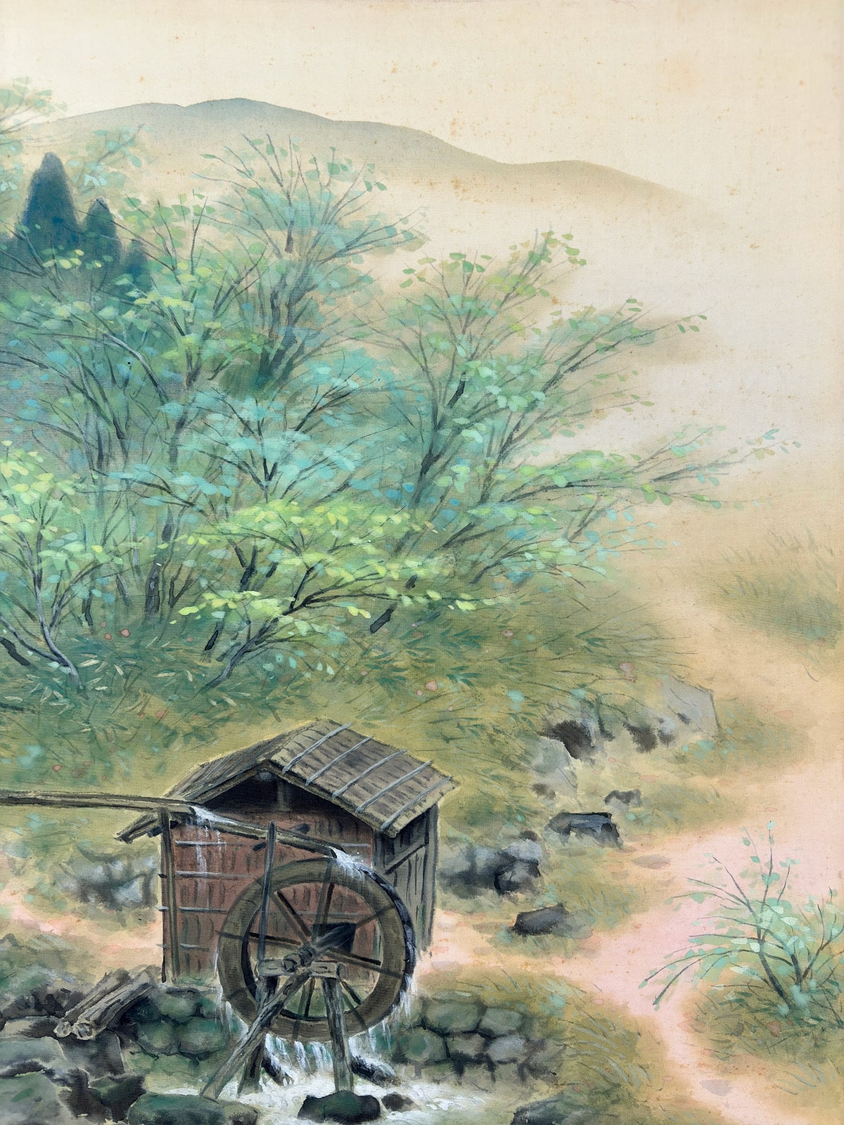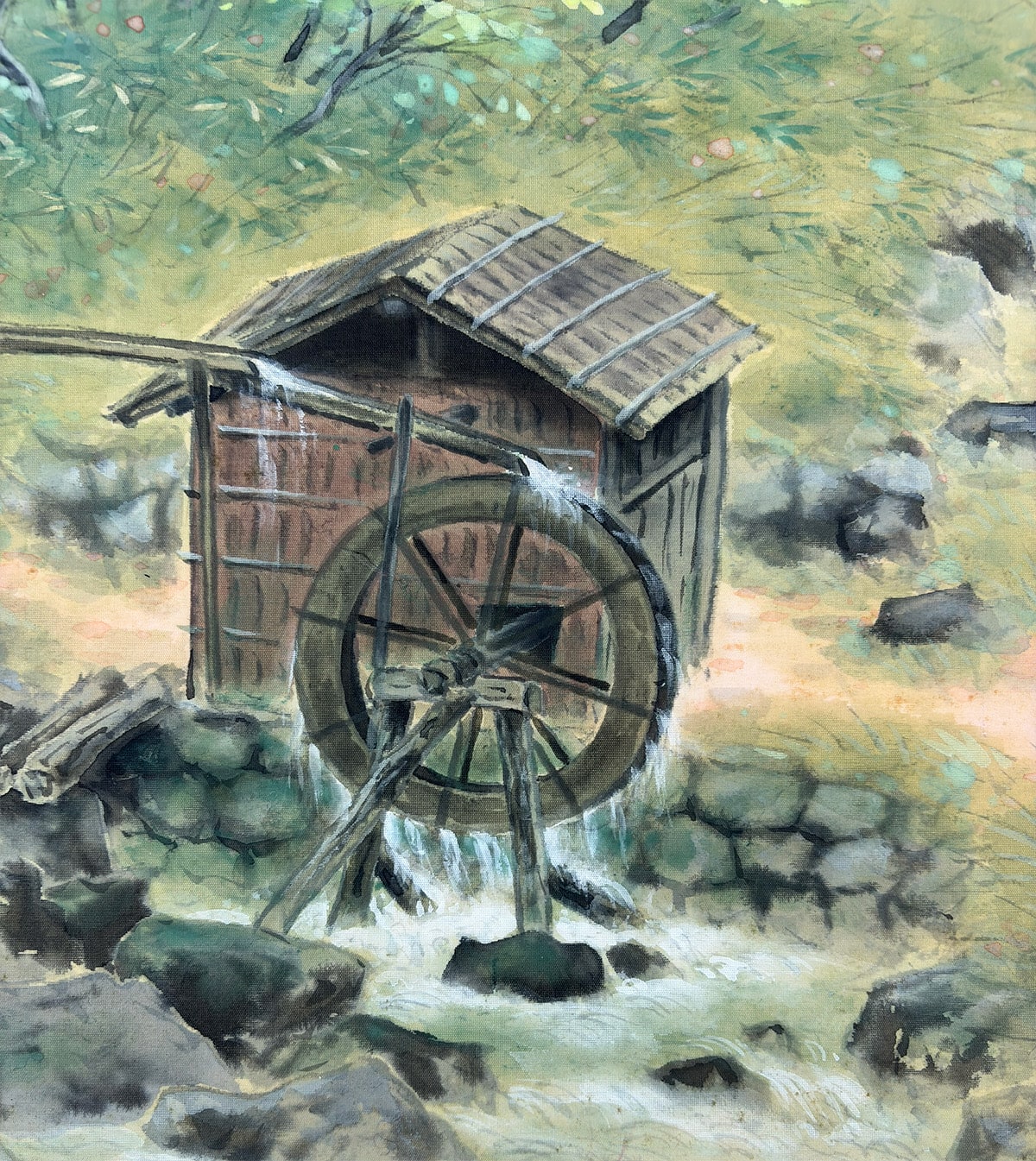 ●深い緑陰に包まれた水車小屋を静かに描いた一幅です。