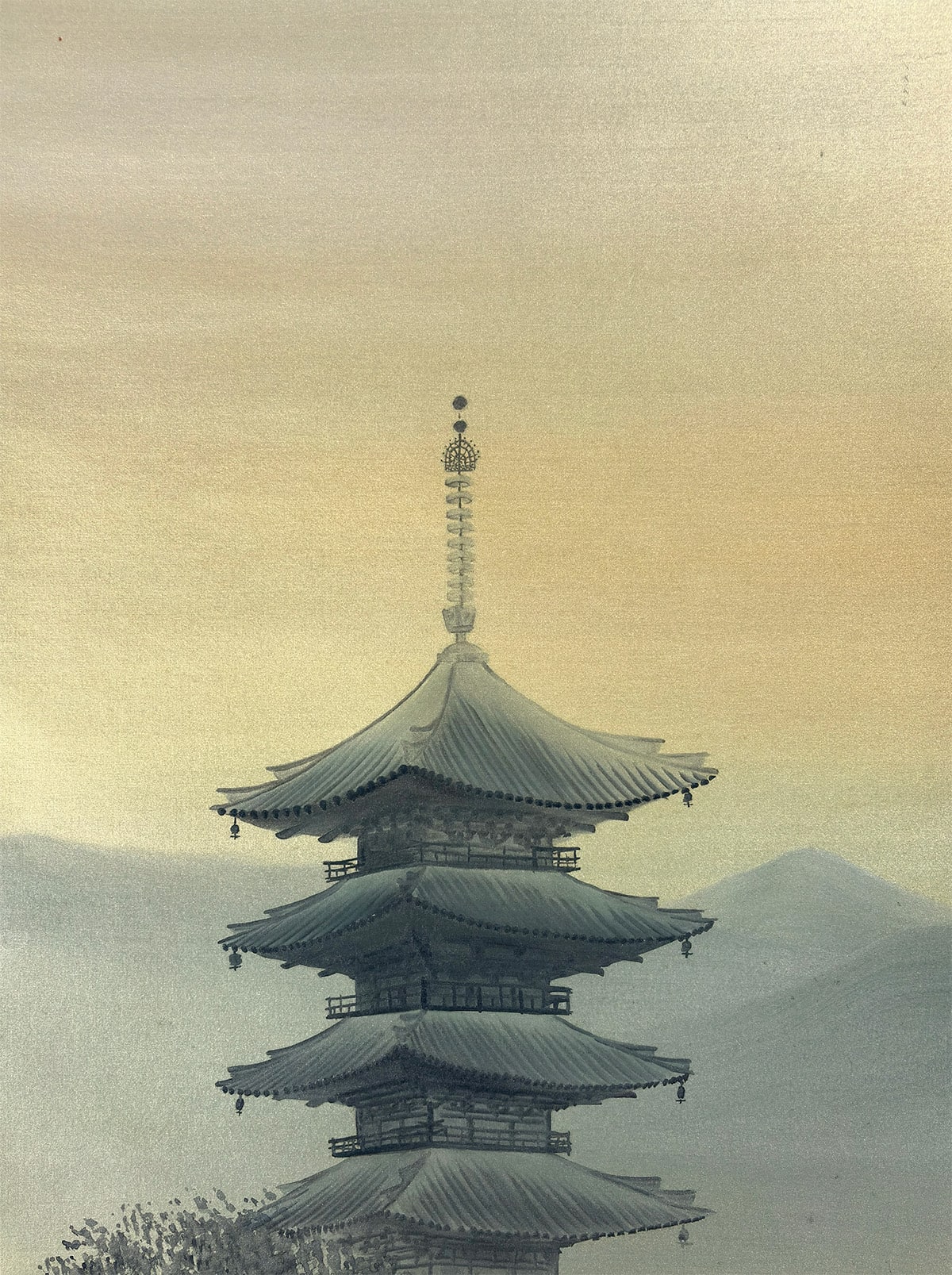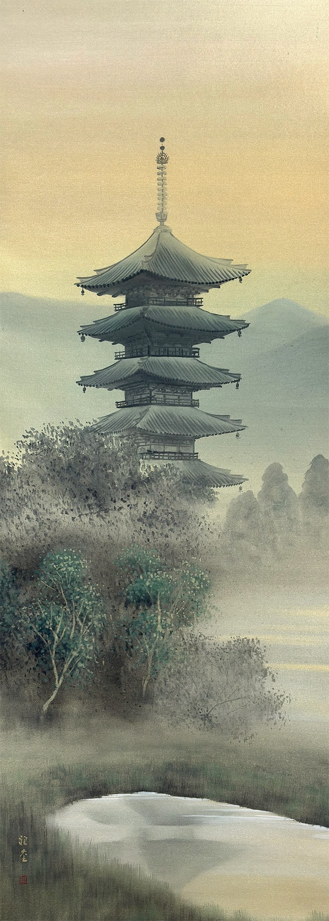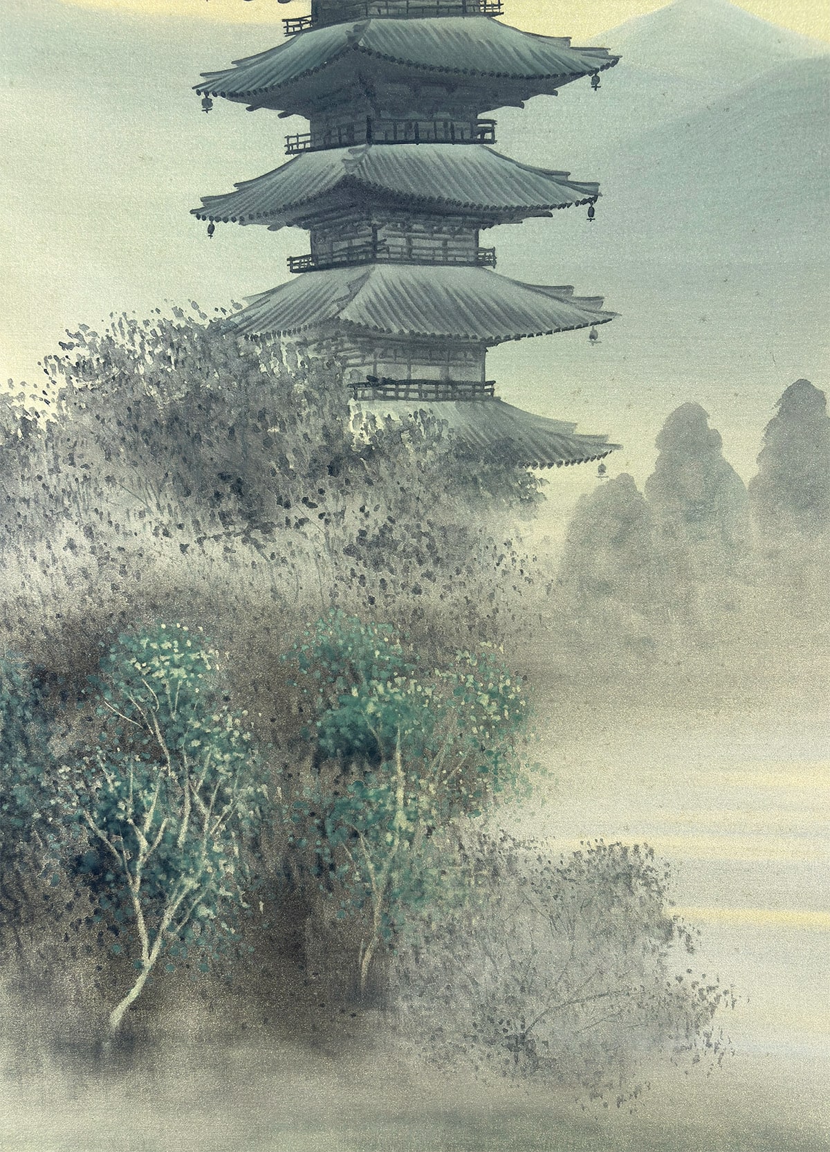 ●深い山あいにそびえる五重塔を、静かな水辺越しに描いた一幅です。淡い靄に包まれた山影と、塔の端正な姿が柔らかく溶け合い、古都の気配と自然の静寂がひとつに重なります。水面に映るわずかな光が、景色に奥行きと清らかさを添え、眺めるほどに心を落ち着かせてくれる作品です。
