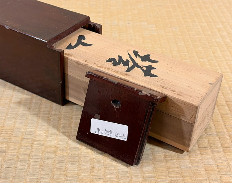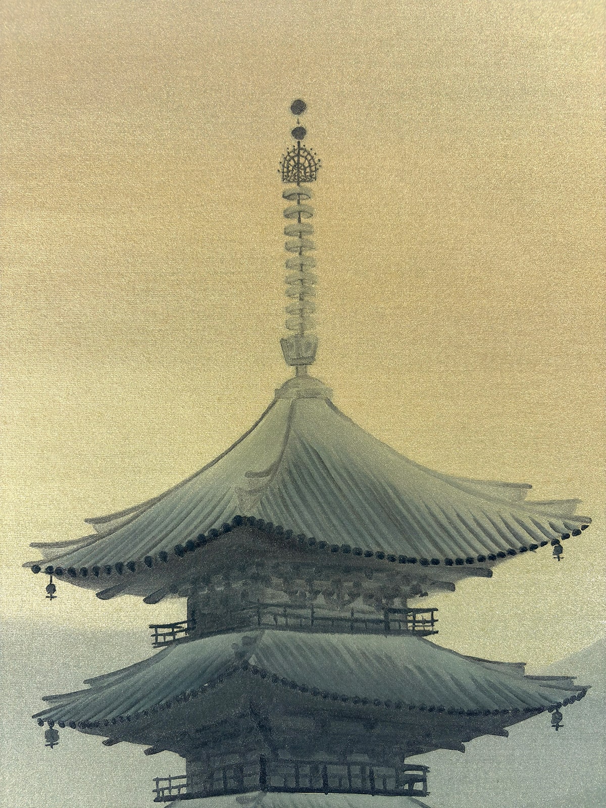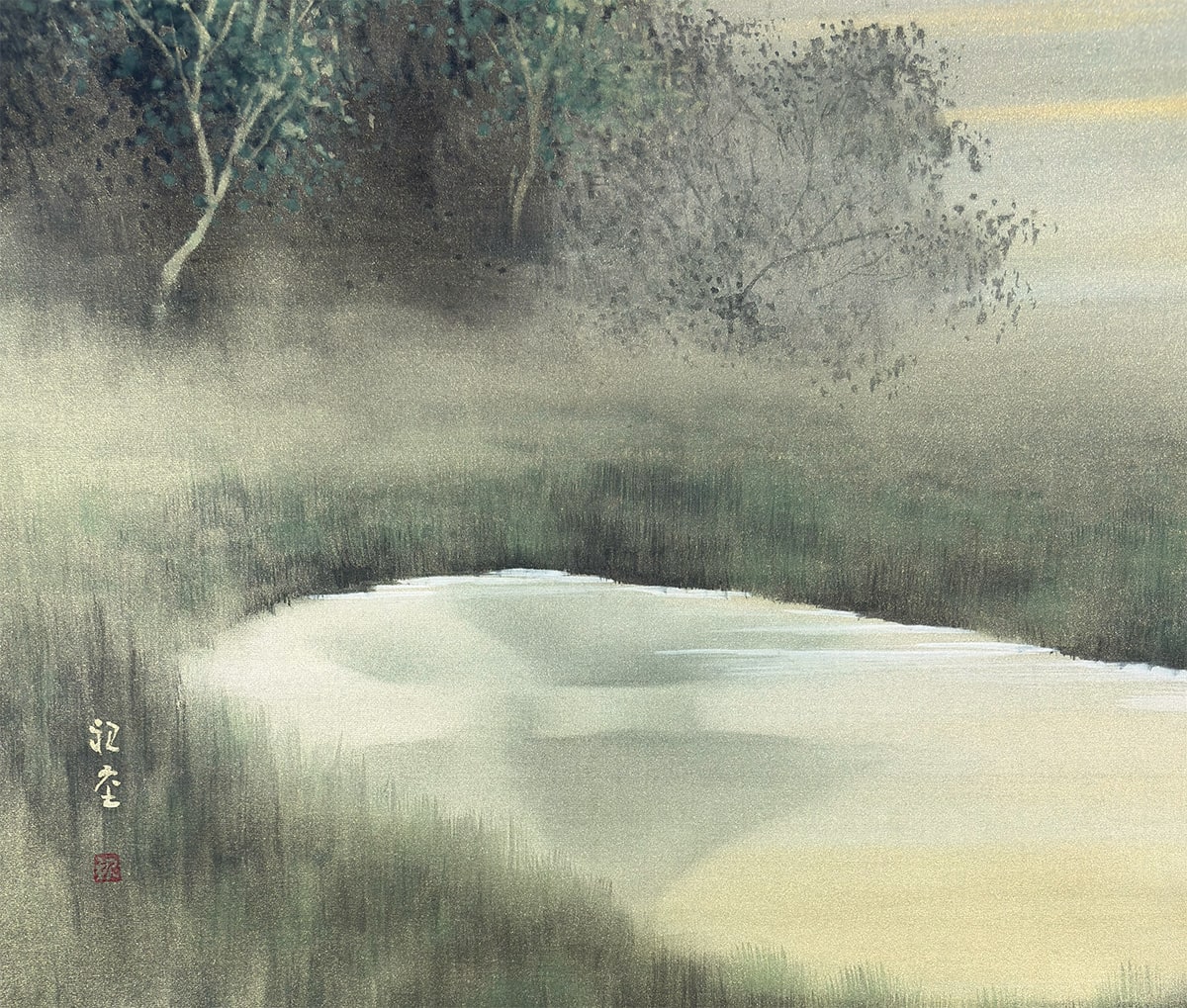 ●深い山あいにそびえる五重塔を、静かな水辺越しに描いた一幅です。淡い靄に包まれた山影と、塔の端正な姿が柔らかく溶け合い、古都の気配と自然の静寂がひとつに重なります。水面に映るわずかな光が、景色に奥行きと清らかさを添え、眺めるほどに心を落ち着かせてくれる作品です。