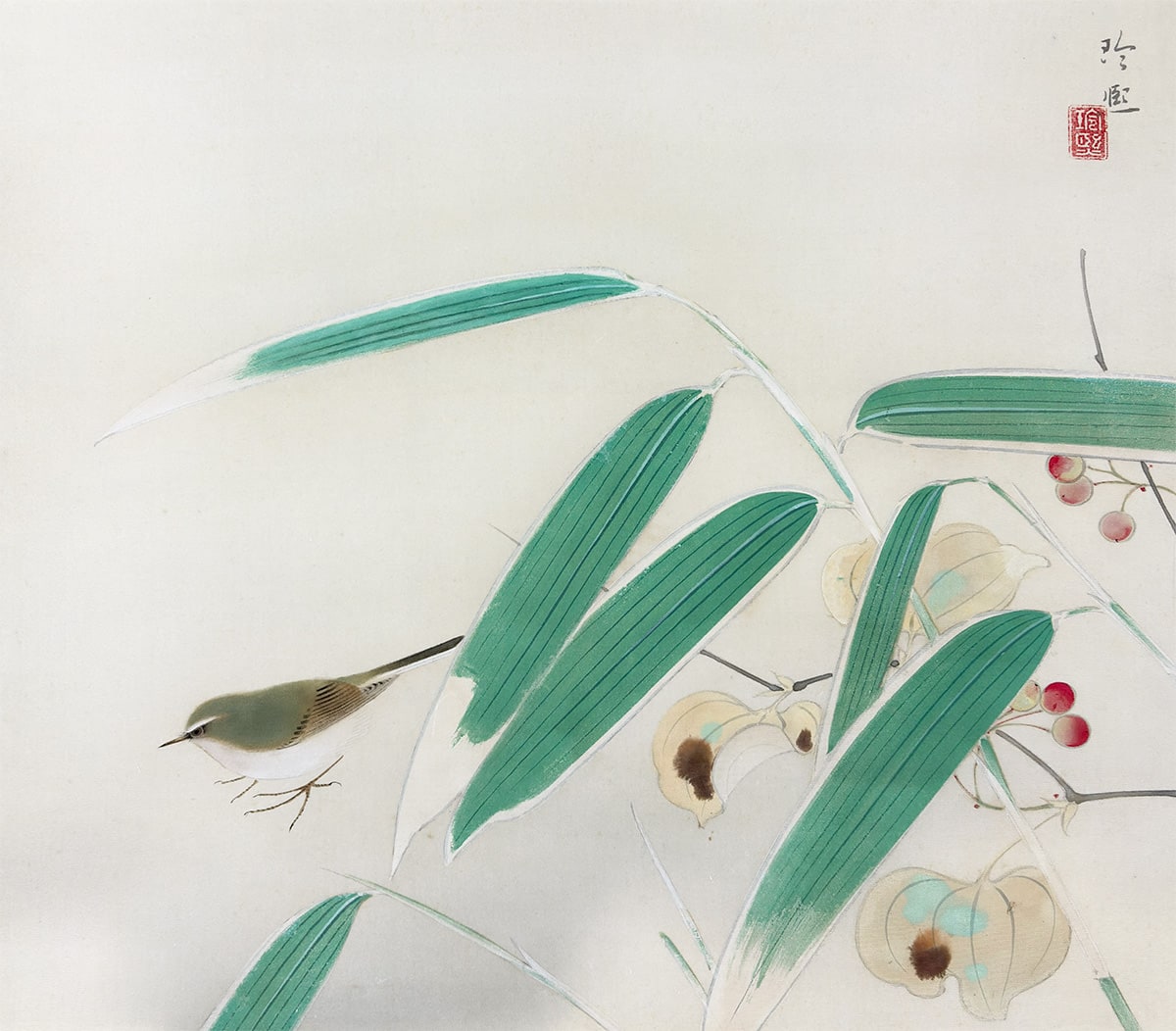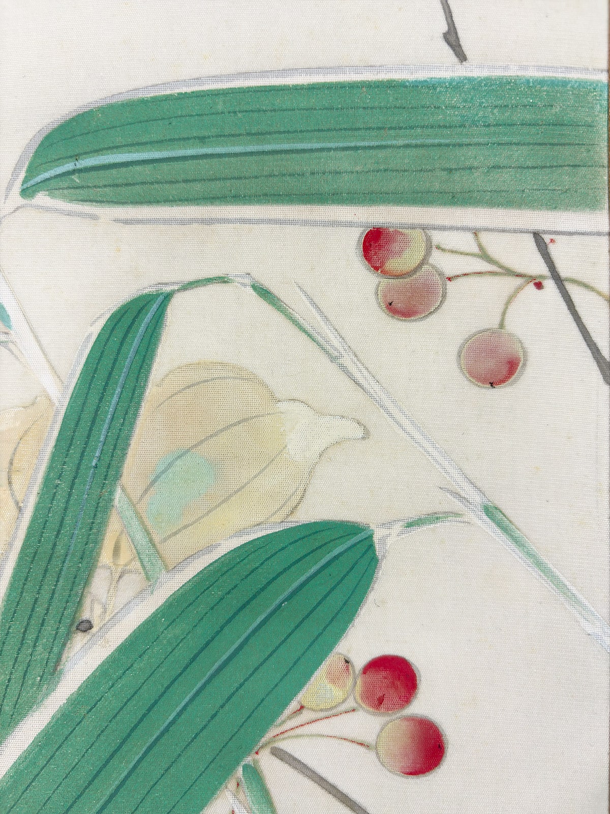●竹の瑞々しい緑、赤い実の対比、鴬の穏やかな姿が、空間に清らかな気配をもたらしています。