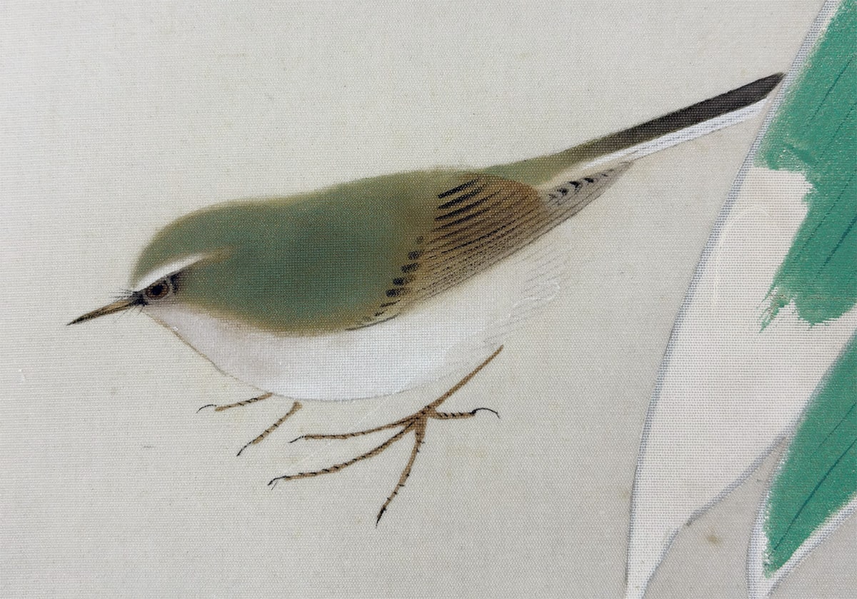 やわらかな光の中、竹の青さと鴬の佇まいが静かに調和する一幅です。