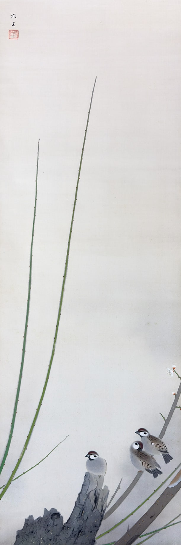 ●井上流光先生が描く「早春(梅花雀)」は、冬の名残がまだ空気に残る頃、梅の枝にふっと舞い降りた雀の姿を捉えた作品です。