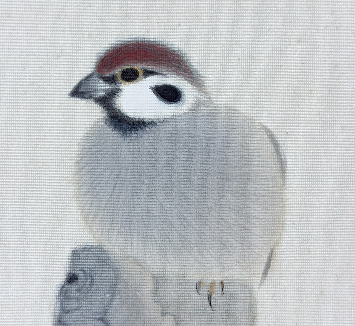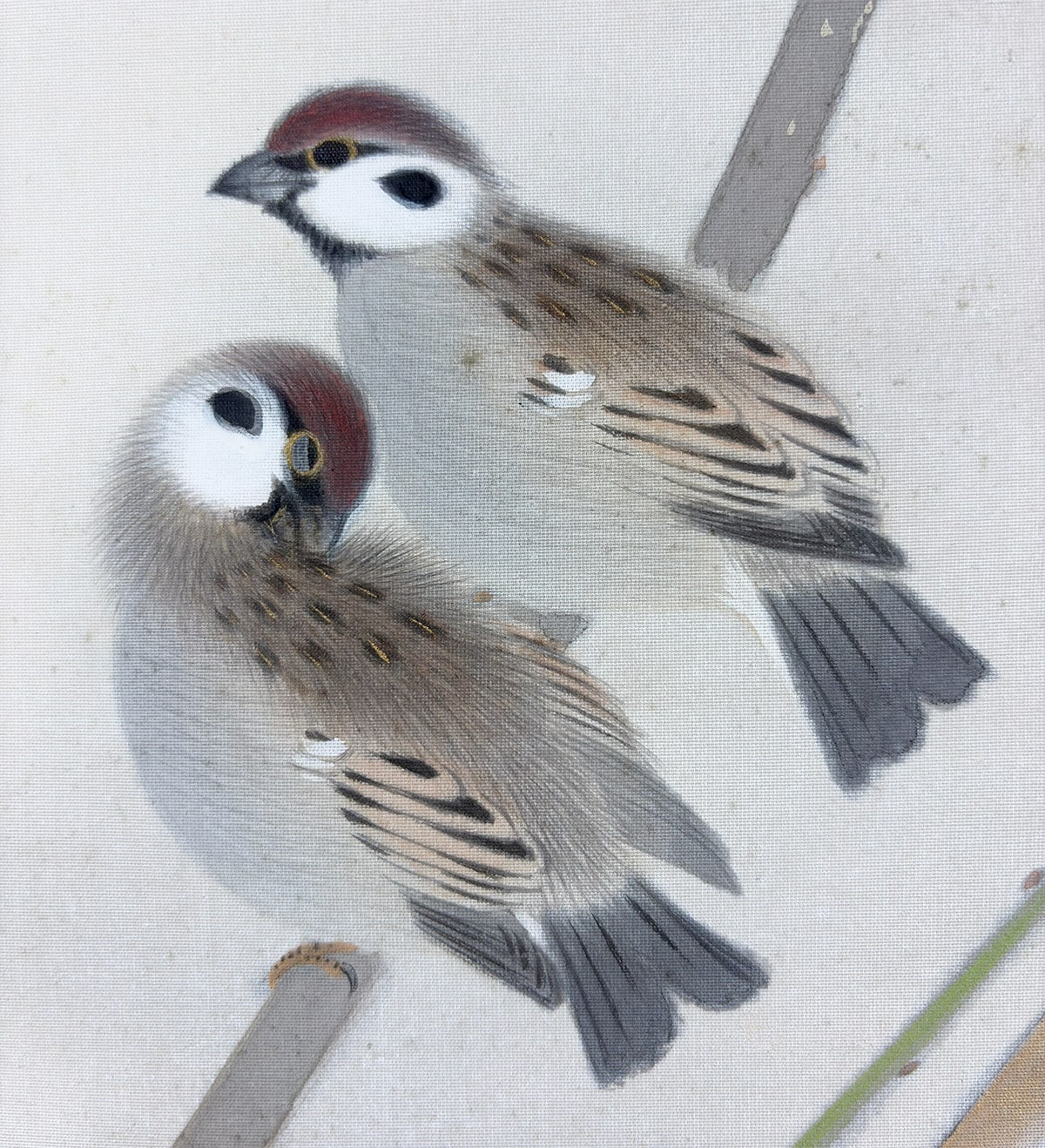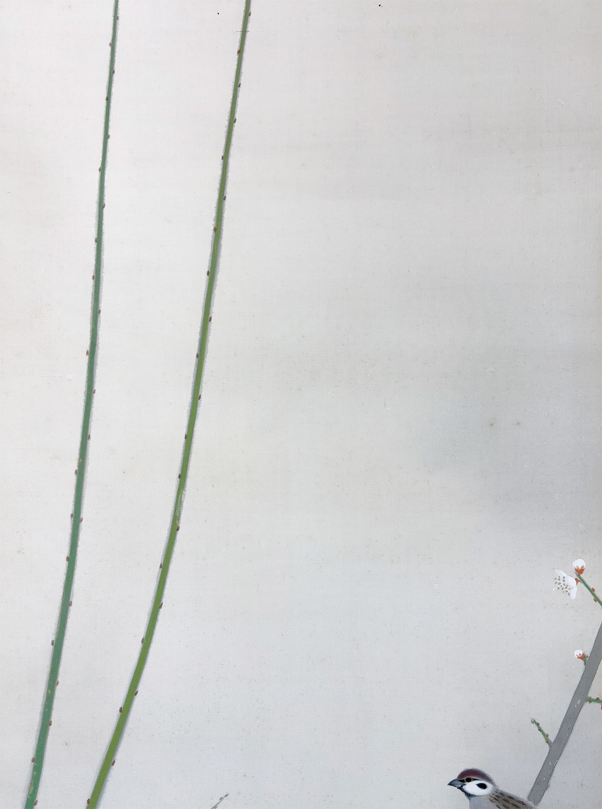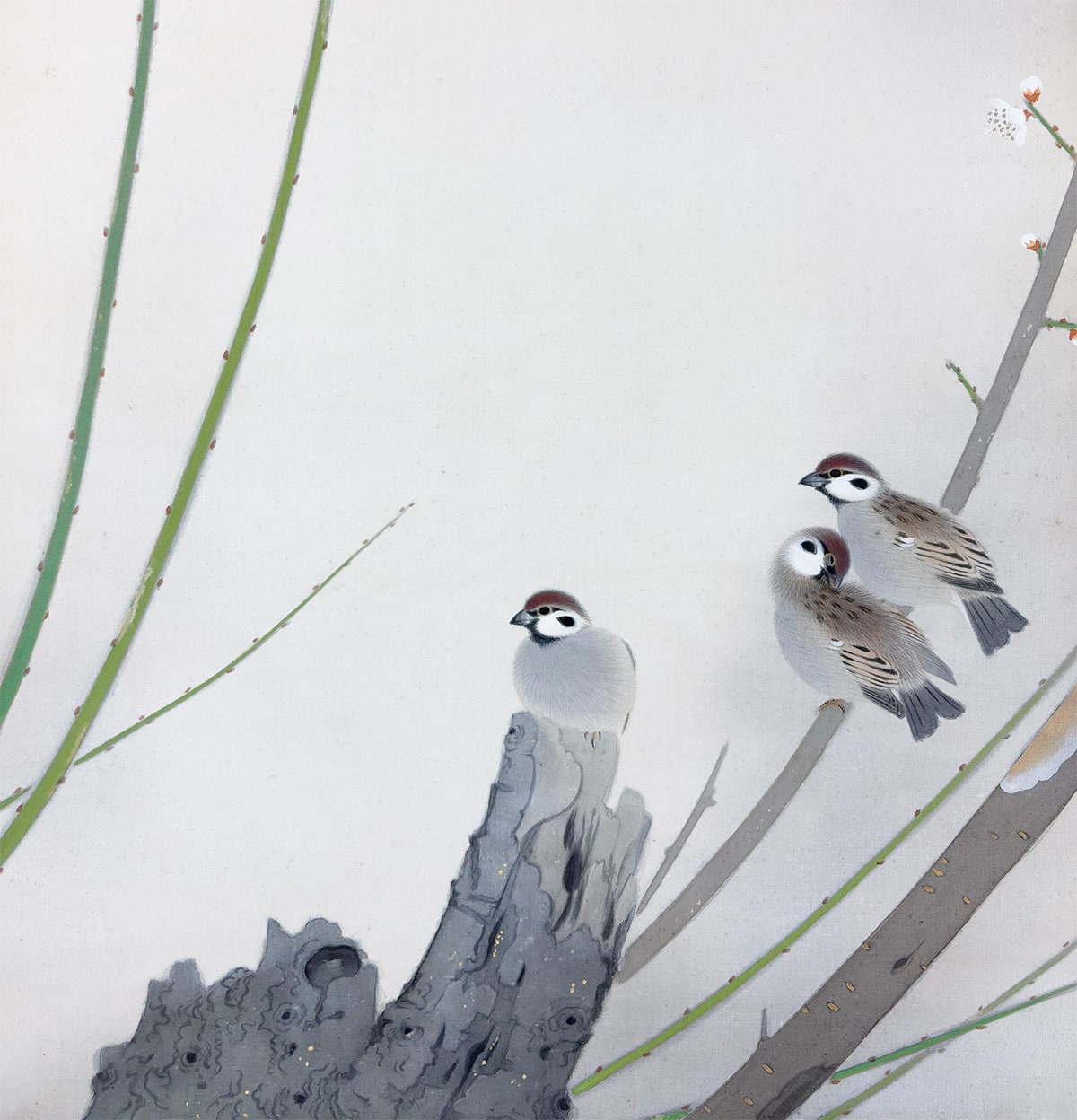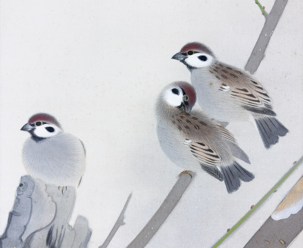 梅花のにじみ、雀の柔らかな羽毛の表現が、日本画ならではの繊細な筆致でまとめられています。