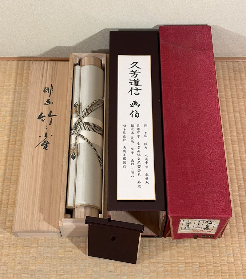 太巻き芯棒は岩絵具の剥離や折れ等を防ぎ、作品の状態をできるだけ良好に保つための保存箱です。