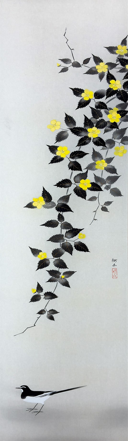 ●明るい山吹の花と、静かに佇む小鳥が春のやわらかな空気を伝える一幅です。お部屋を明るくしながら落ち着いた雰囲気も保つため、玄関やリビングなど幅広い場所に飾りやすい作品です。