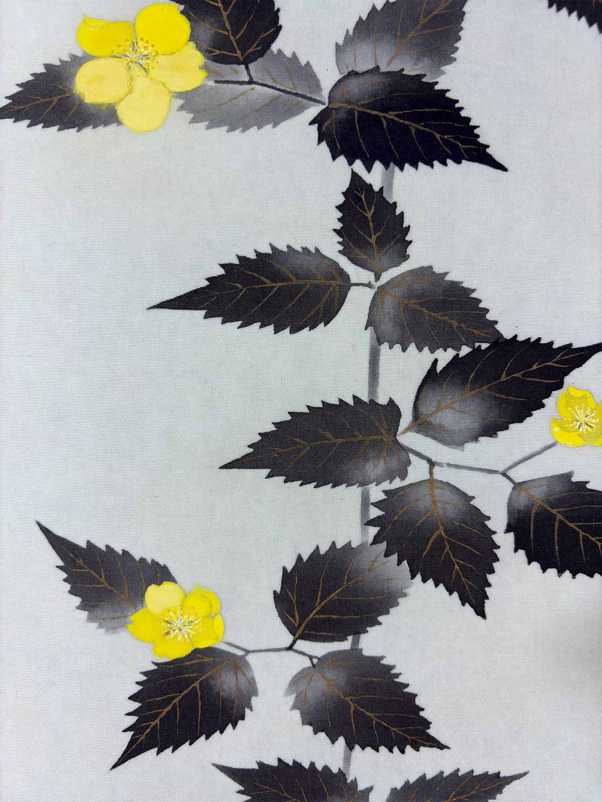●春の終わりごろに咲く山吹の花を、明るく上品な黄色で描いた掛軸です。