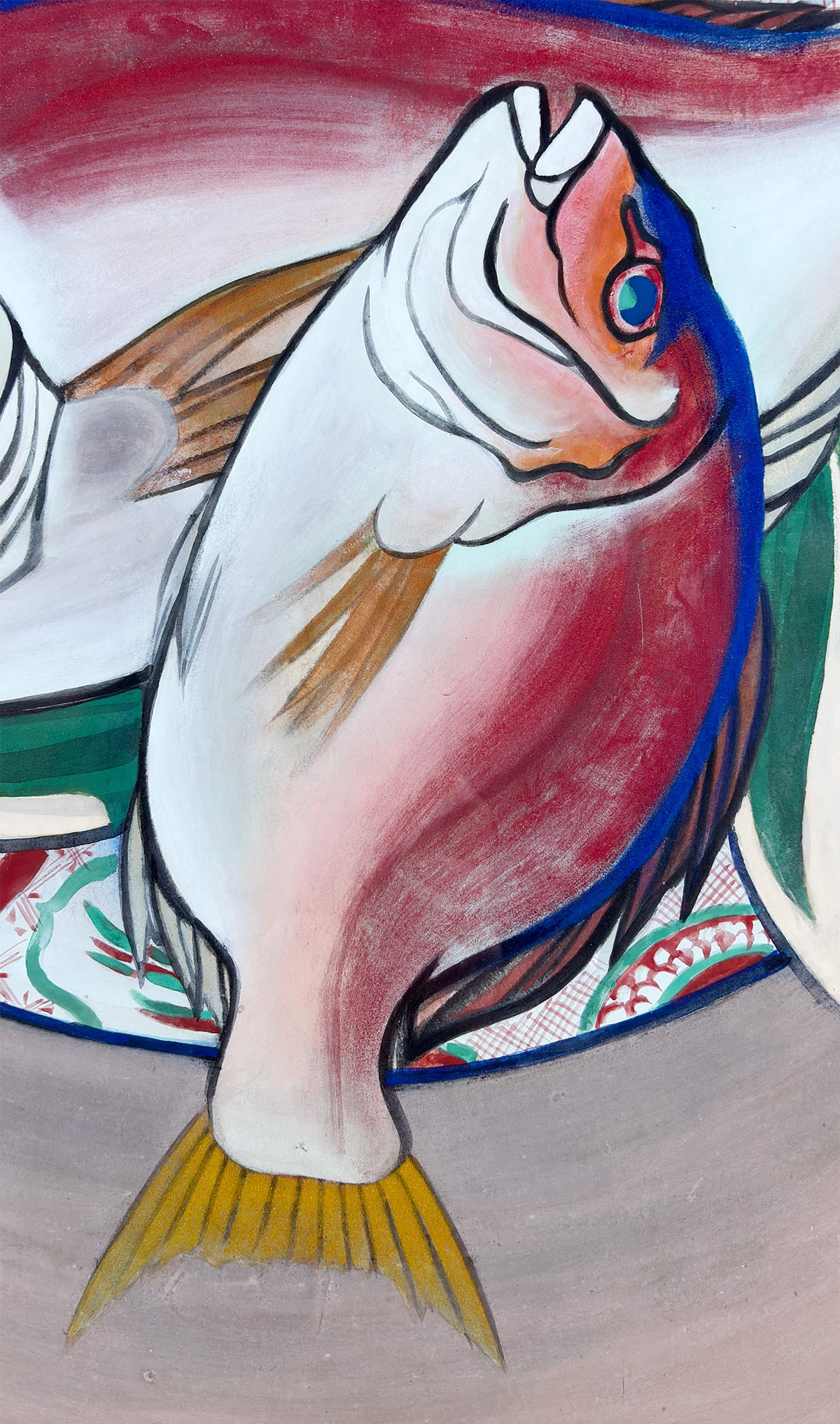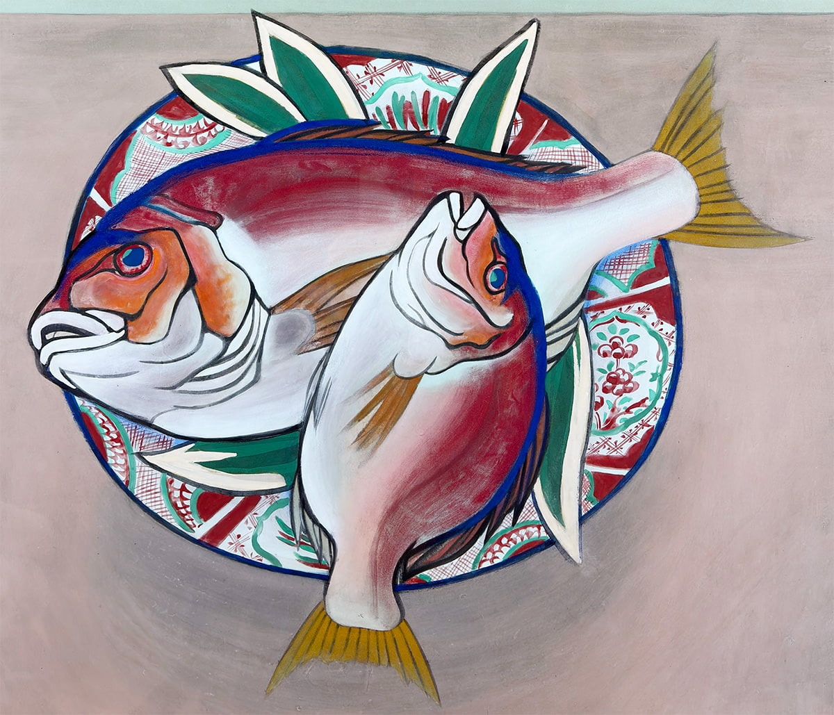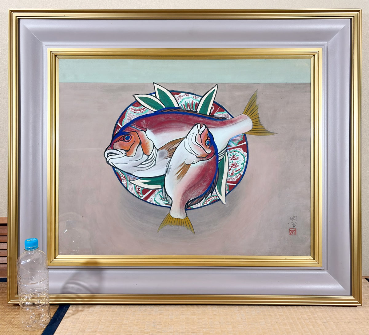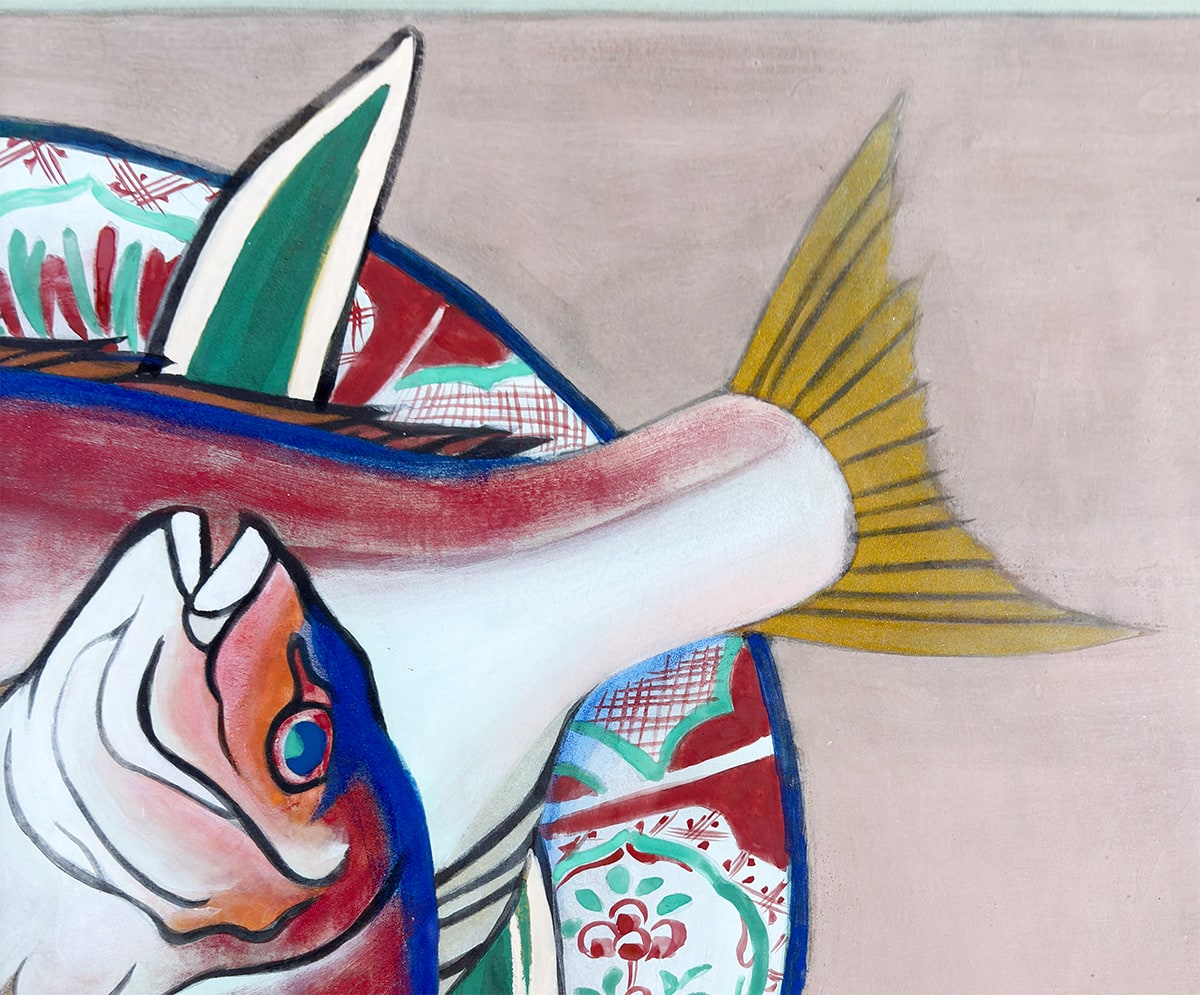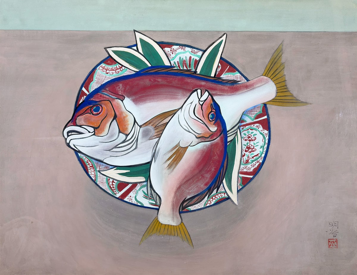 ●瑞々しい赤と白の色彩で描かれた二尾の鯛は、生命感と品格を兼ね備え、画面に豊かな祝意を湛えています。下に敷かれた文様皿や青葉のあしらいは、晴れやかな席を思わせ、作品全体に格調高い華やぎを添えています。