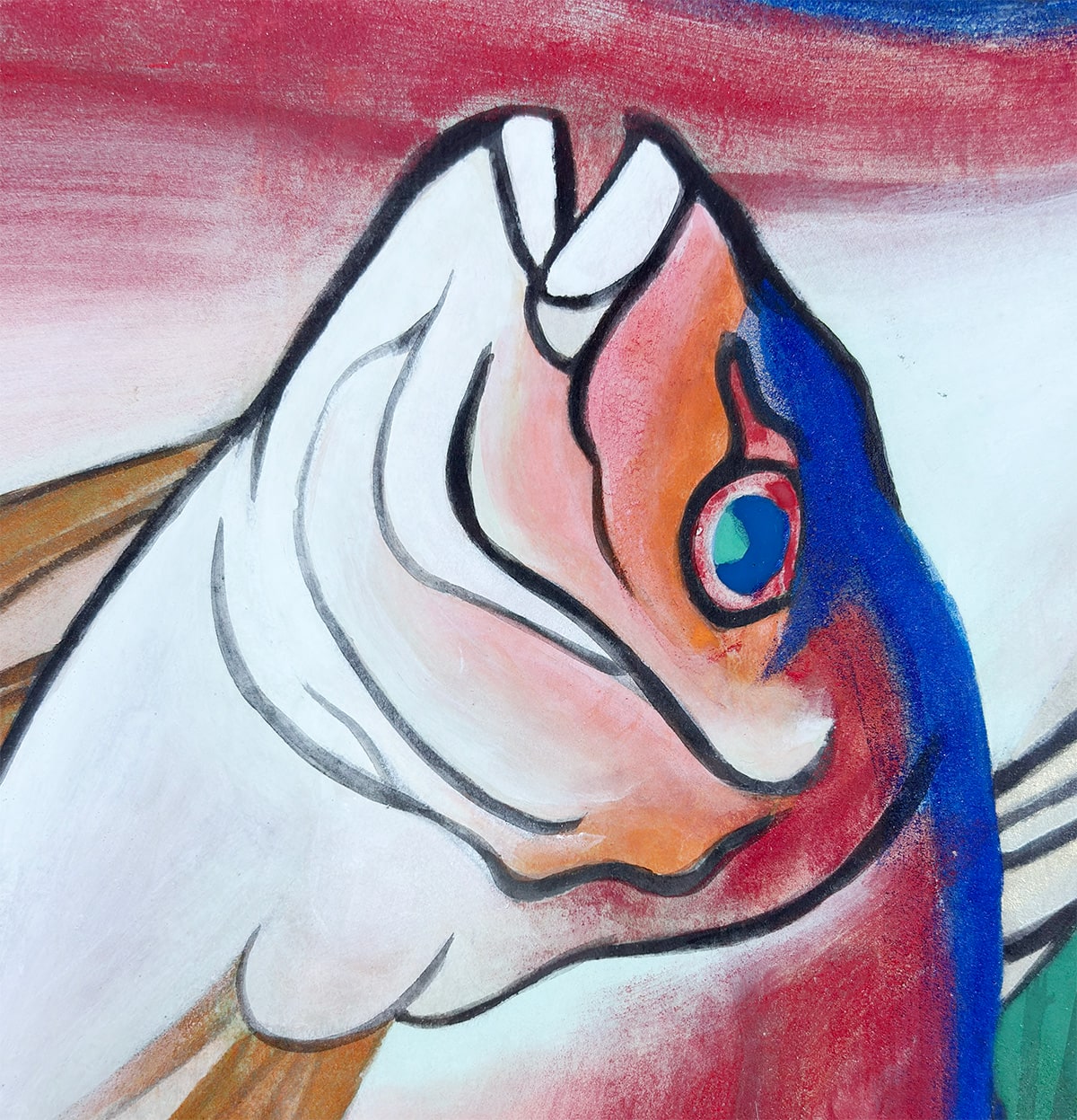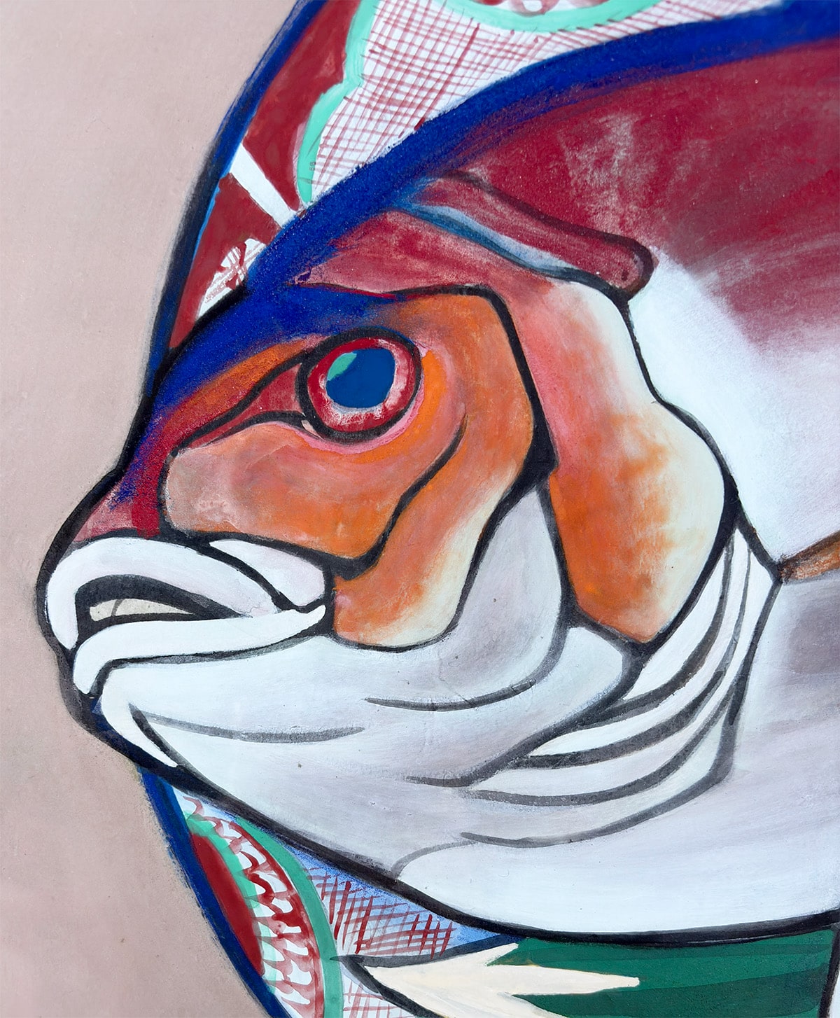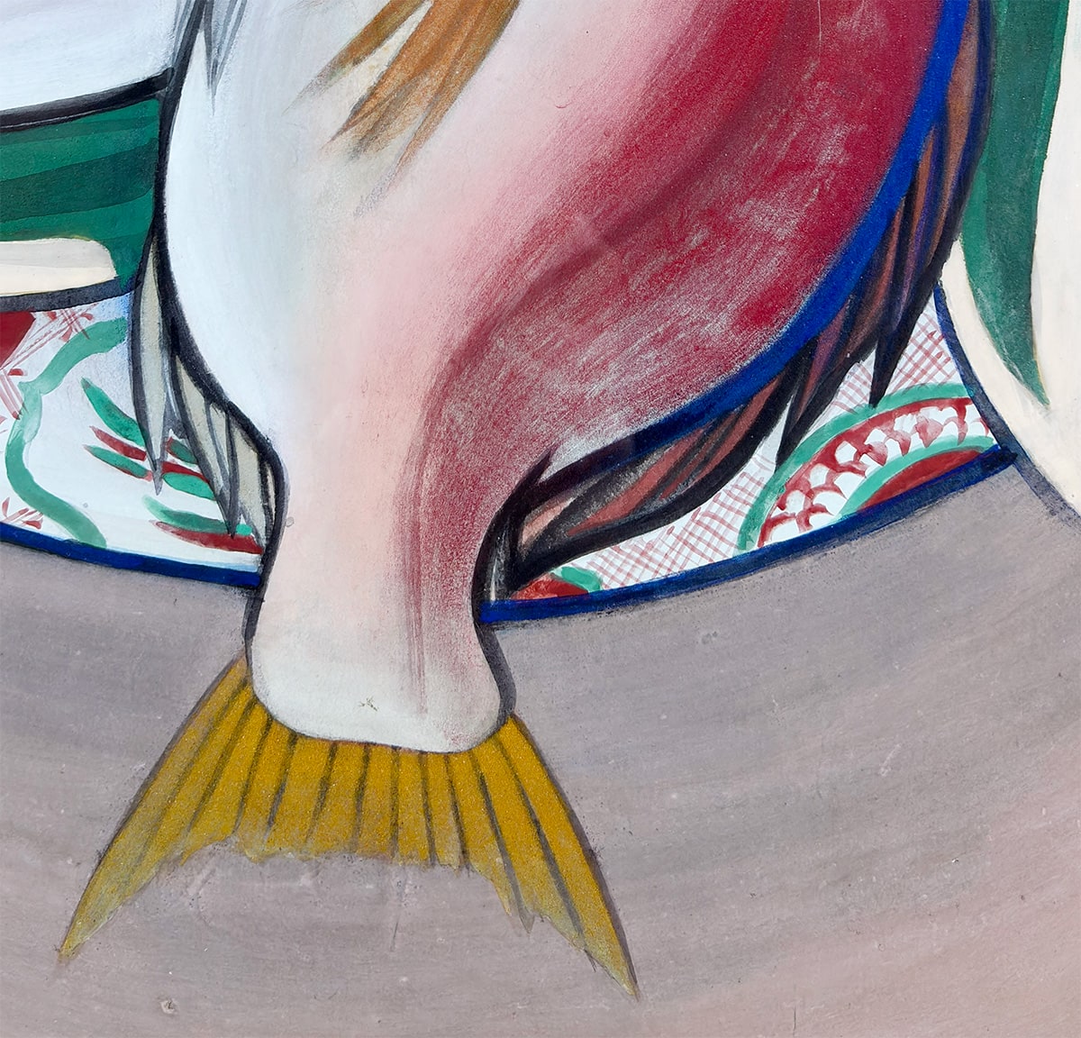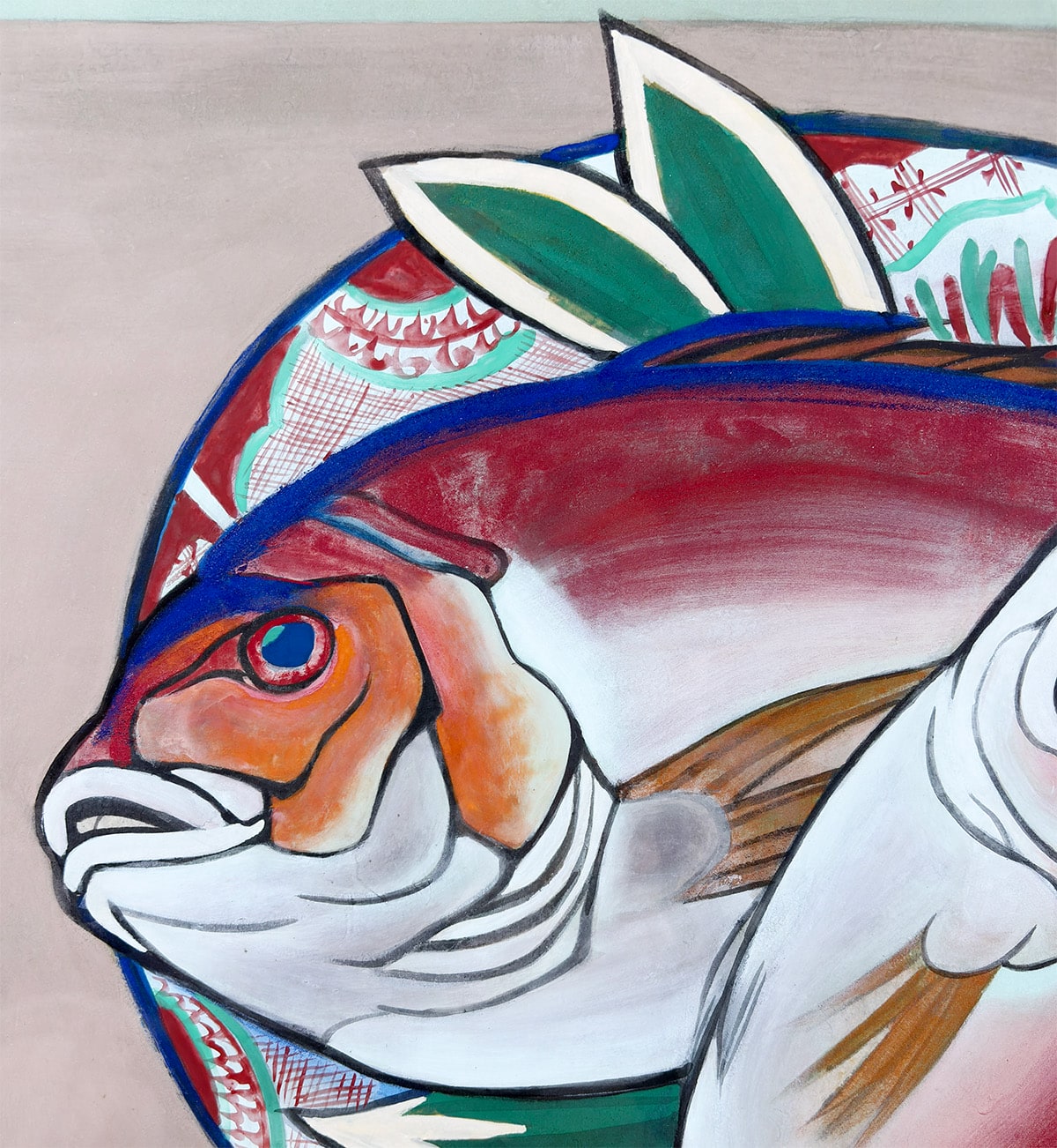 ●瑞々しい赤と白の色彩で描かれた二尾の鯛は、生命感と品格を兼ね備え、画面に豊かな祝意を湛えています。下に敷かれた文様皿や青葉のあしらいは、晴れやかな席を思わせ、作品全体に格調高い華やぎを添えています。
