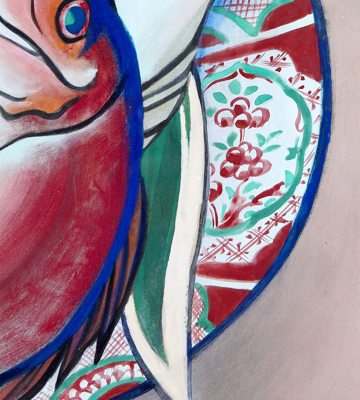 ●鯛が載せられている絵皿は、伊万里焼を思わせる白磁と文様が特徴的で、晴れの席を象徴する雅趣と格式を作品に添えています。伊万里焼は江戸期より国内外で高く評価されてきた磁器であり、その清浄な白と華やかな絵付けは、鯛の赤をいっそう引き立て、作品全体に格調高い華やぎをもたらします。