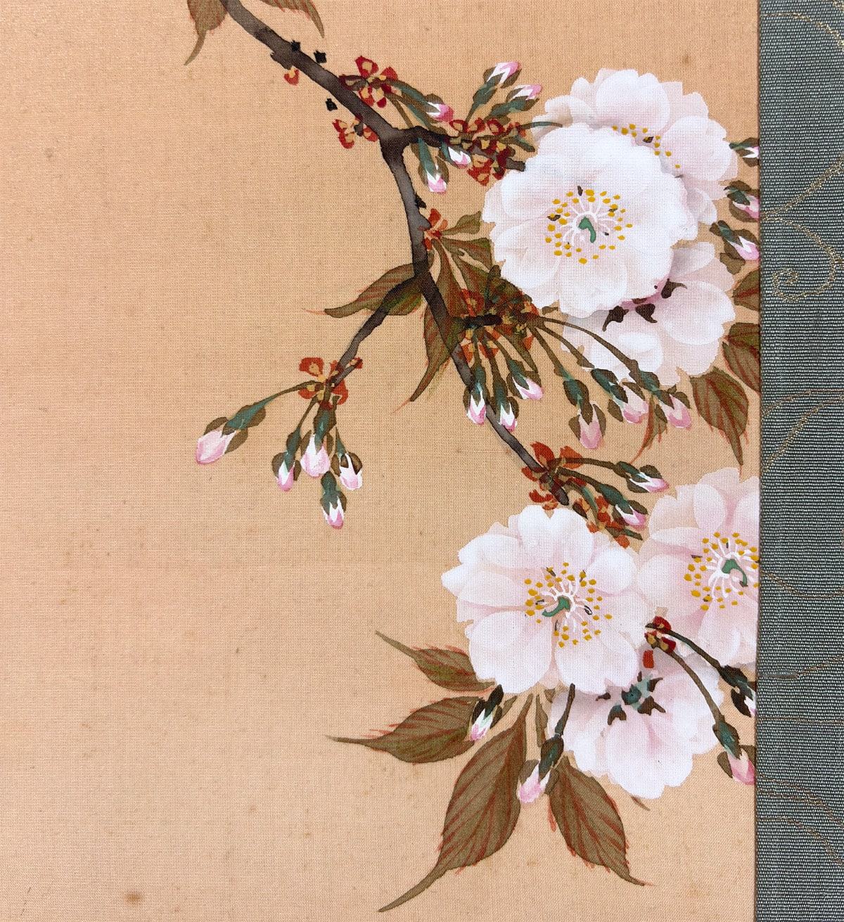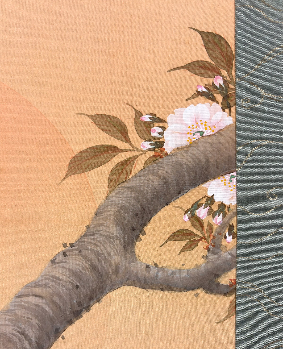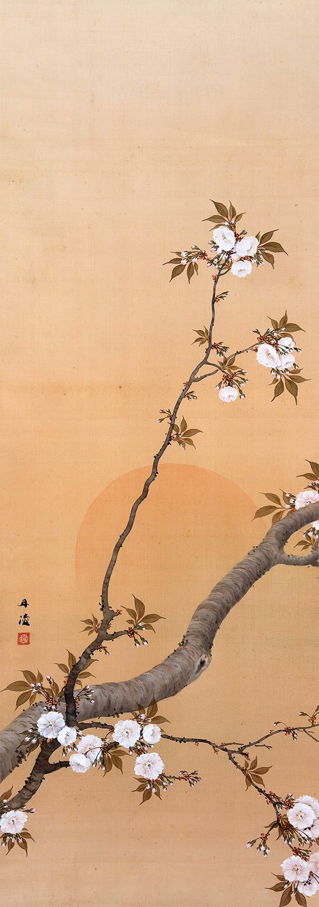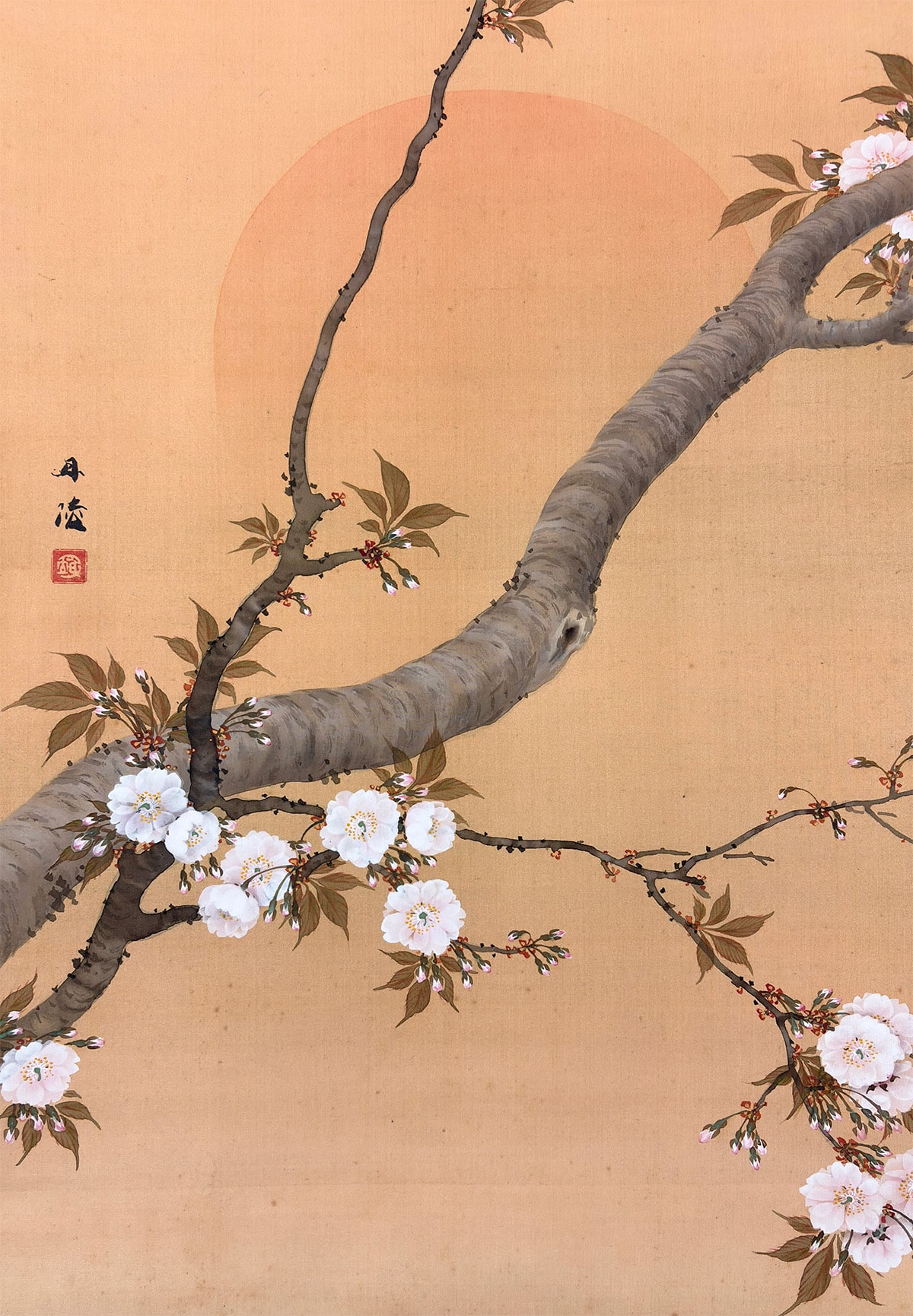 ●柔らかな朝日を受けて咲きほこる桜を描いた《旭日桜花》は、一日の始まりを象徴する光と、春の生命力を宿す桜が調和した、たいへん縁起のよい題材です。