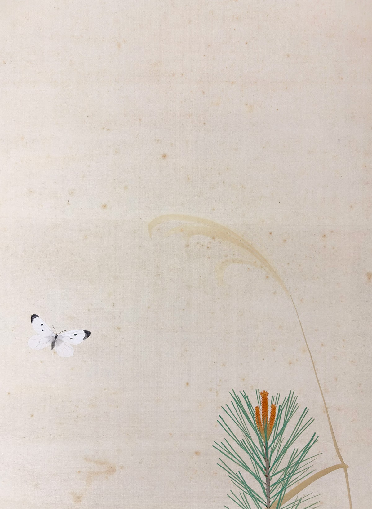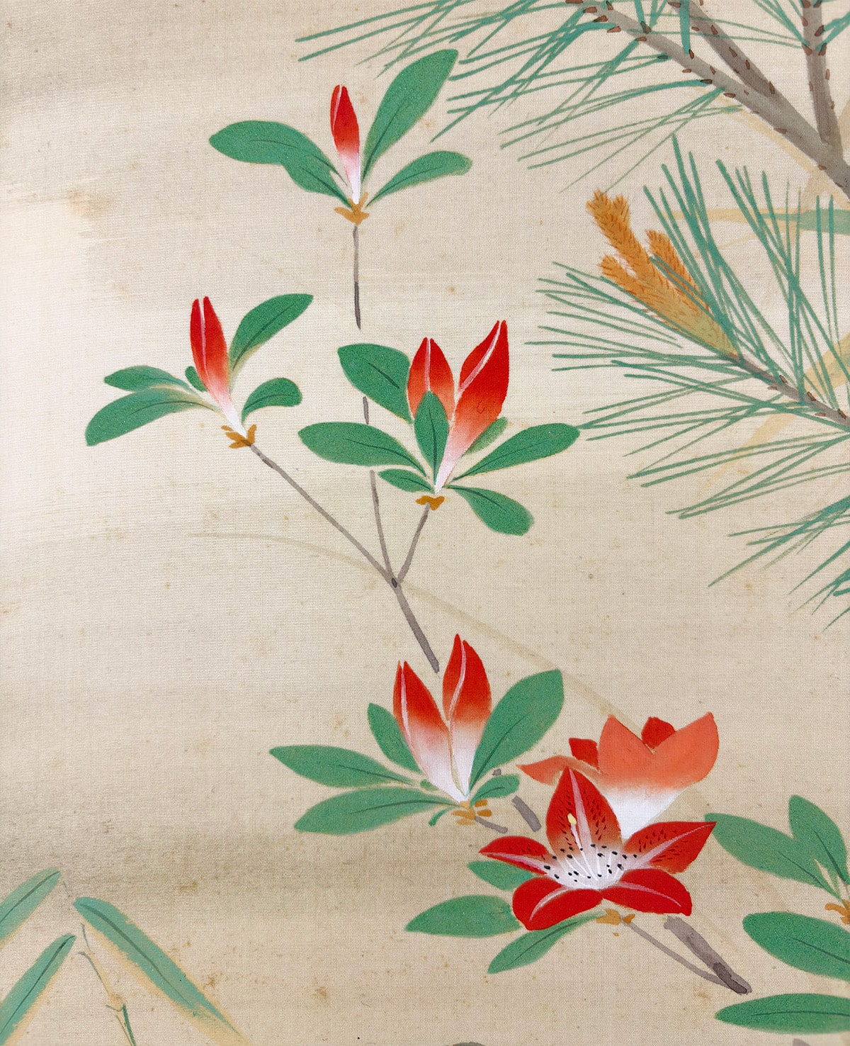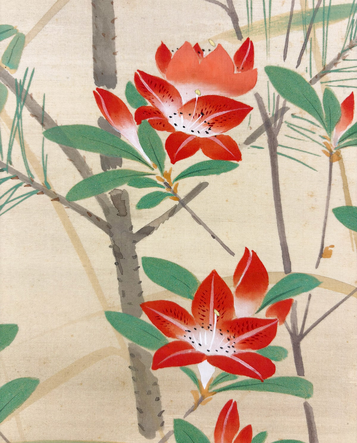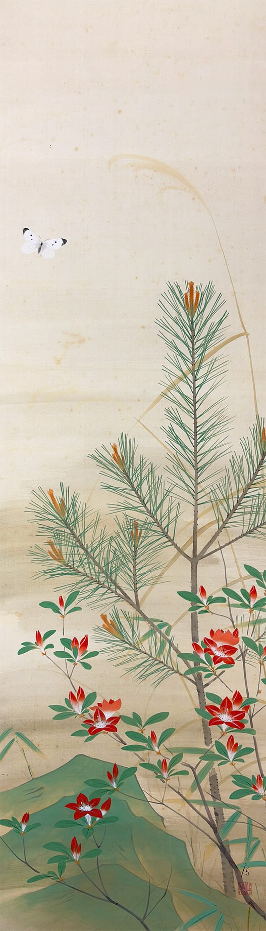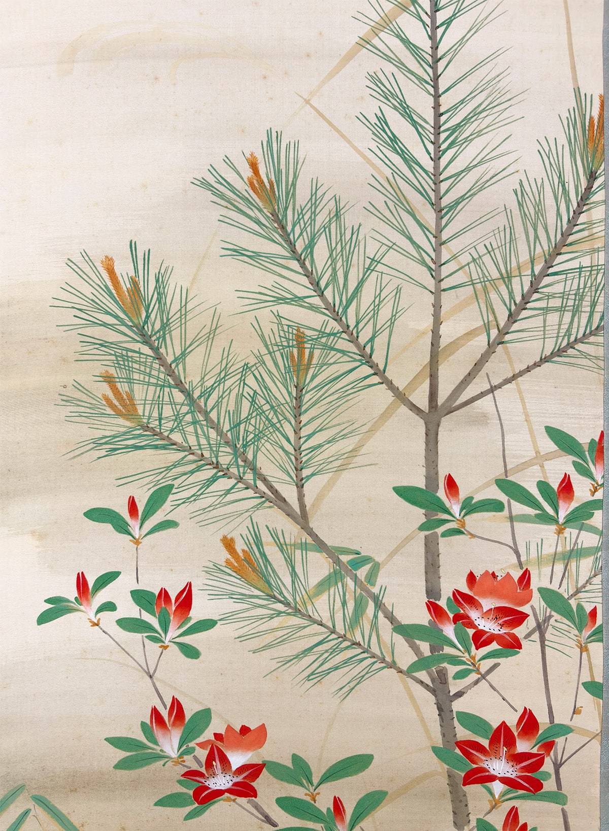 ●常緑の若松が象徴する安泰と、春の躑躅がもたらす華やぎを一幅にまとめた、たいへん縁起の良い作品です。