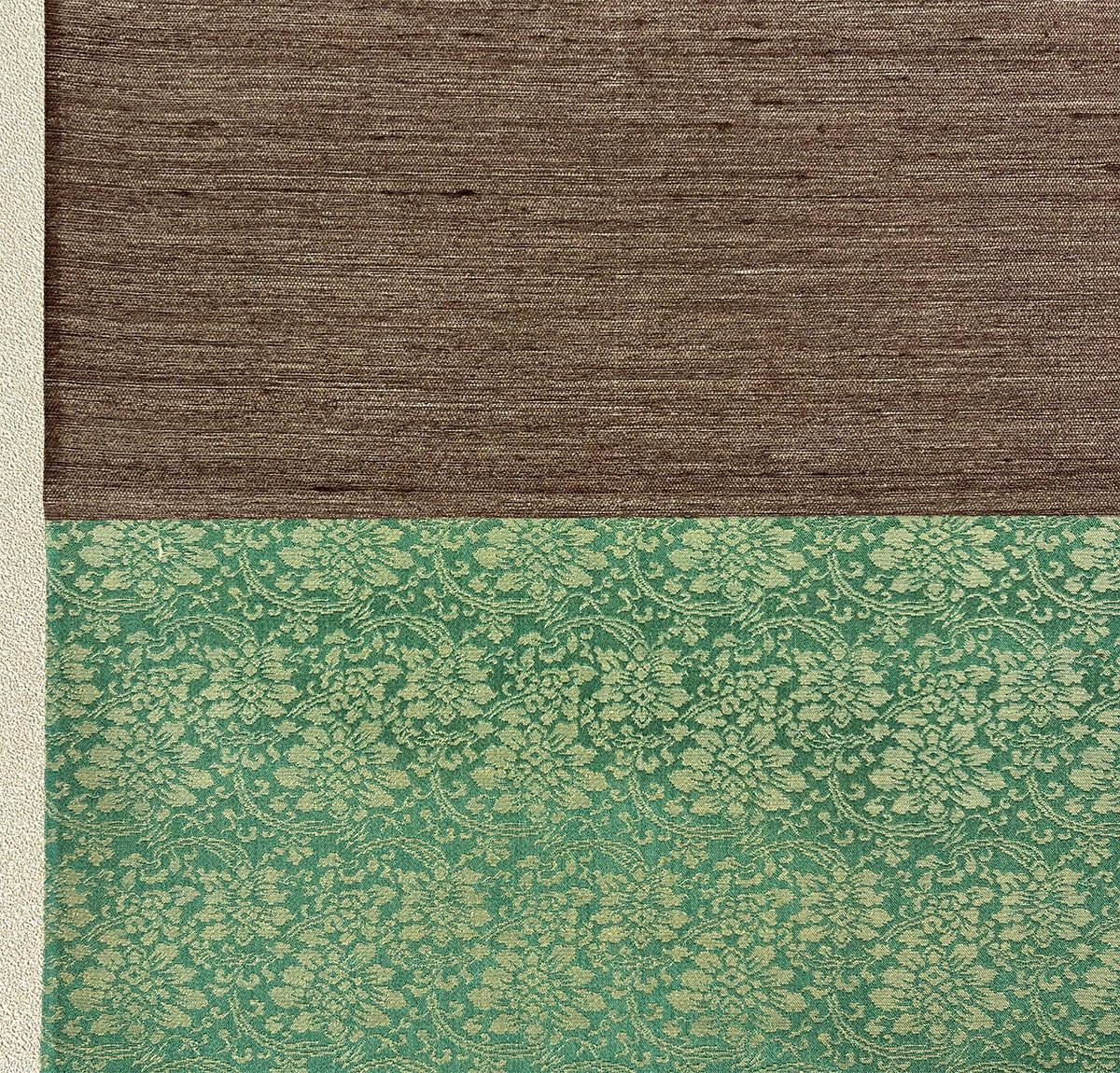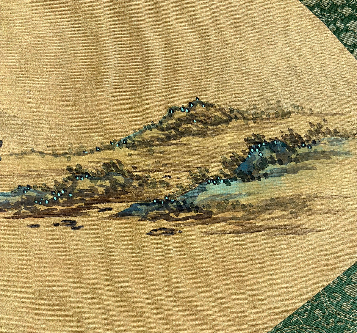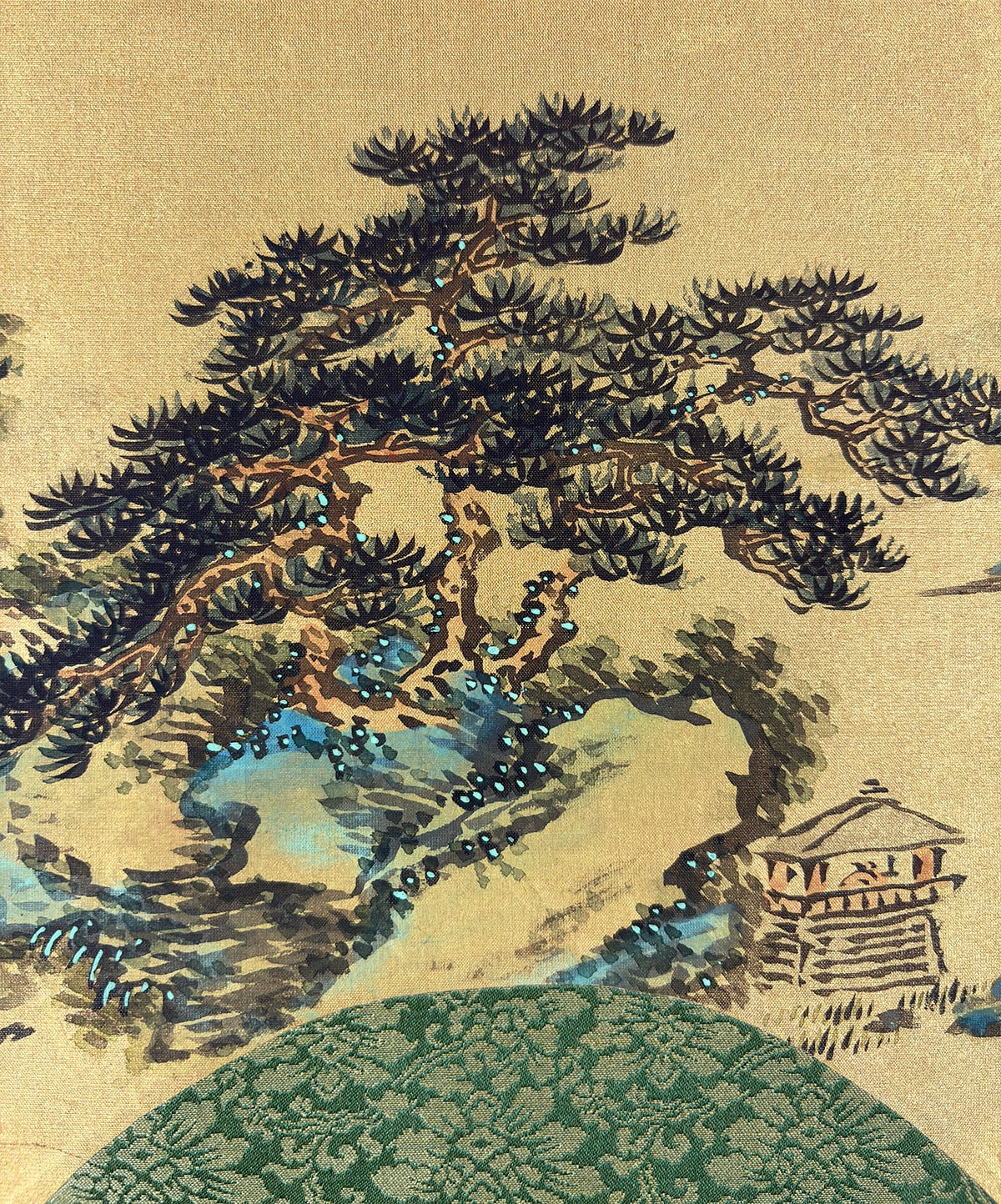 手前の大樹は落ち着いた筆致で量感を持たせ、奥へ進むほどに淡く霞み、山並みが静かに溶け込んでいきます。