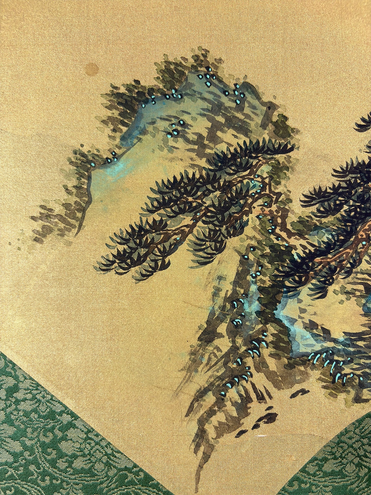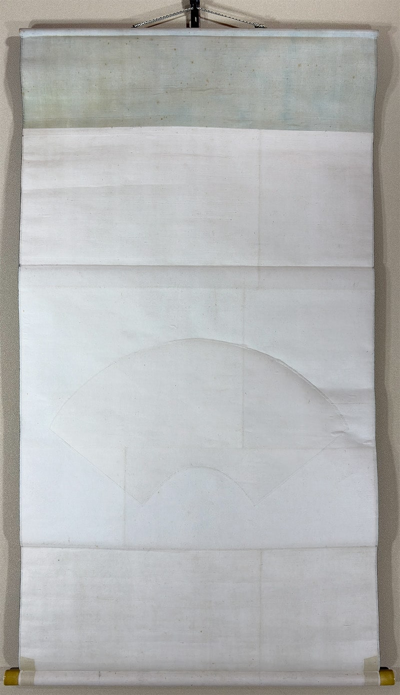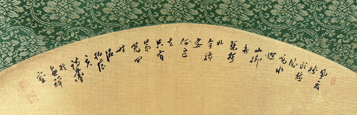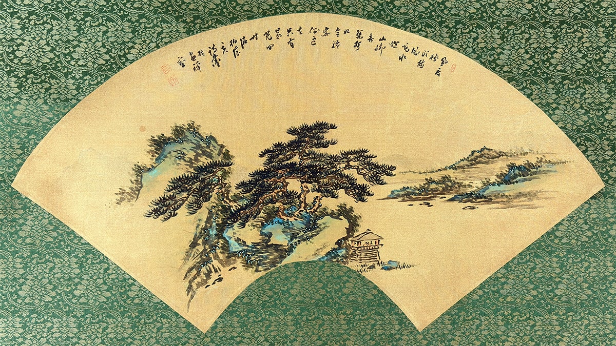 ●扇面のゆるやかな弧に沿って、古木・山影・水辺が穏やかに配置された山水画です。