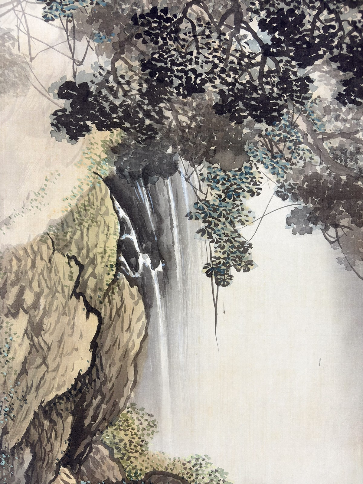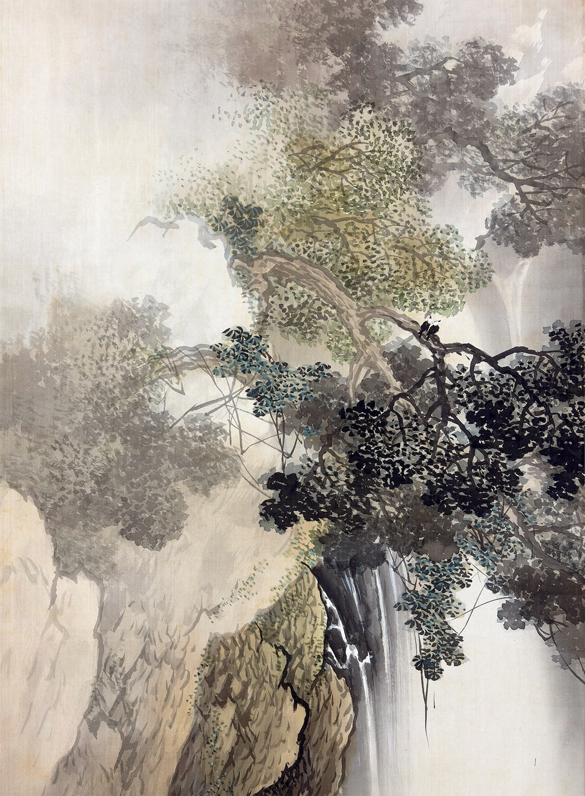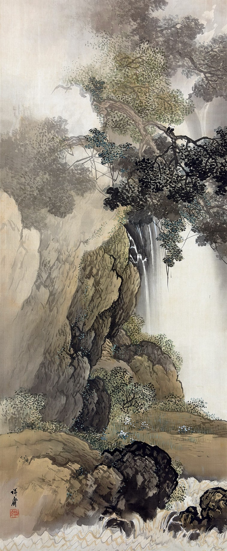 ●切り立つ岩肌を縫うように流れ落ちる瀑布と、深い山あいの静けさを対照的に描いた一幅です。