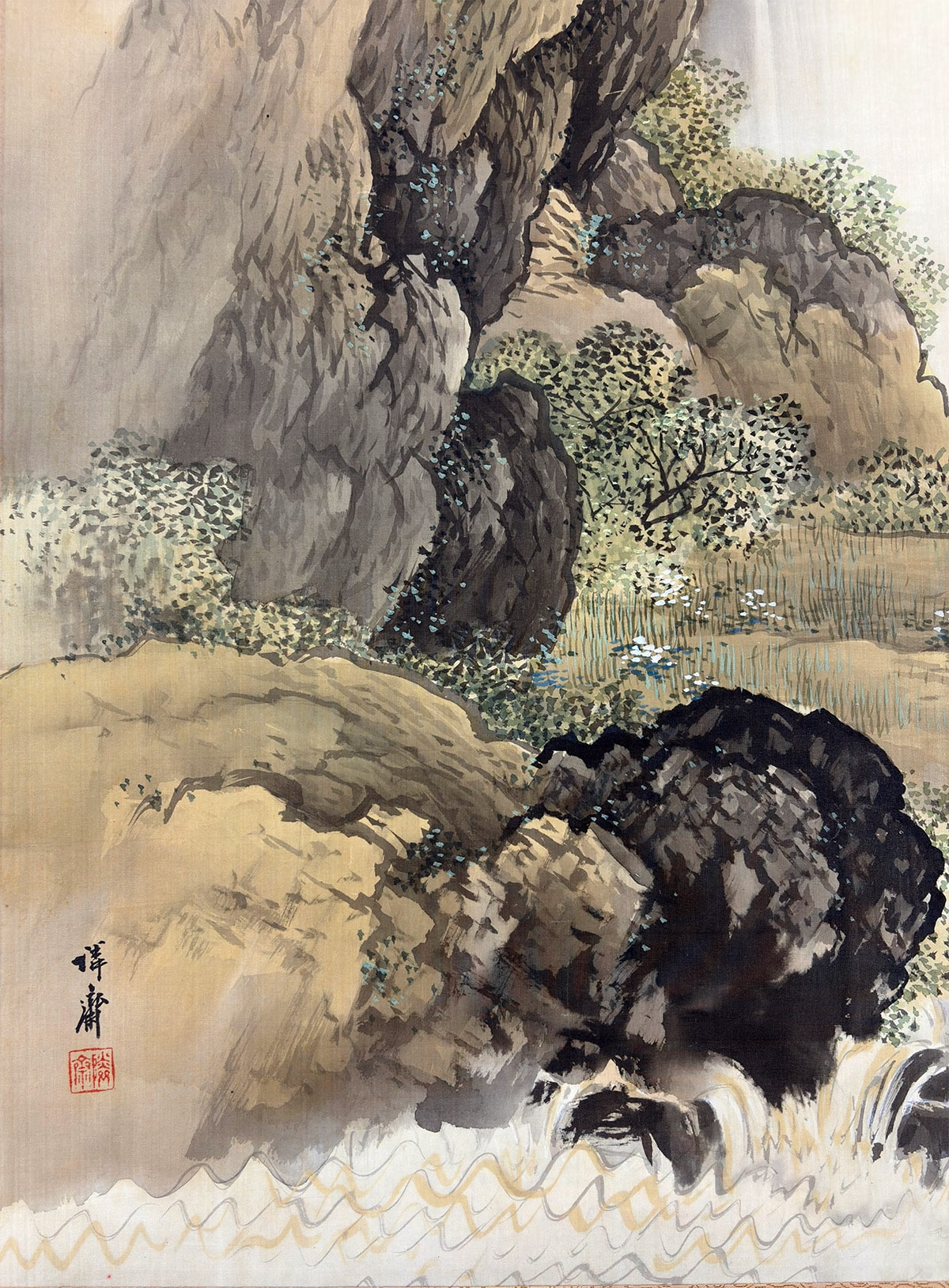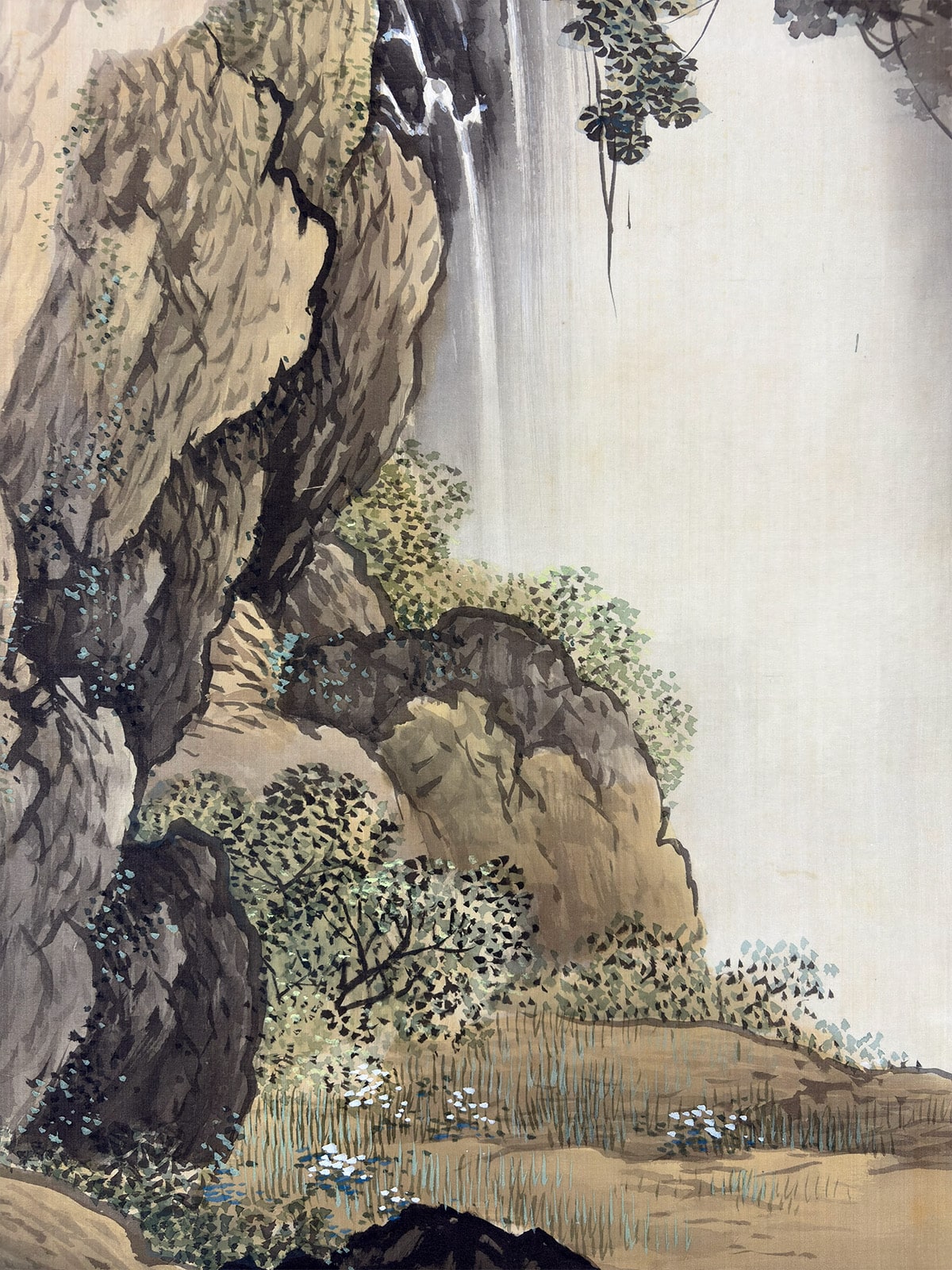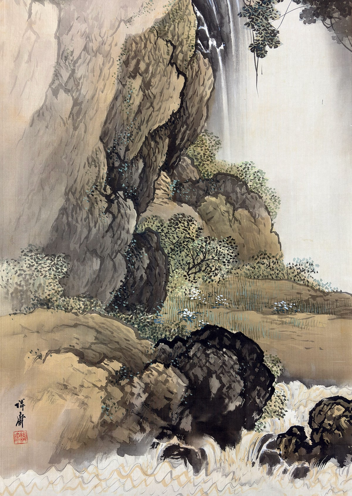 ●切り立つ岩肌を縫うように流れ落ちる瀑布と、深い山あいの静けさを対照的に描いた一幅です。