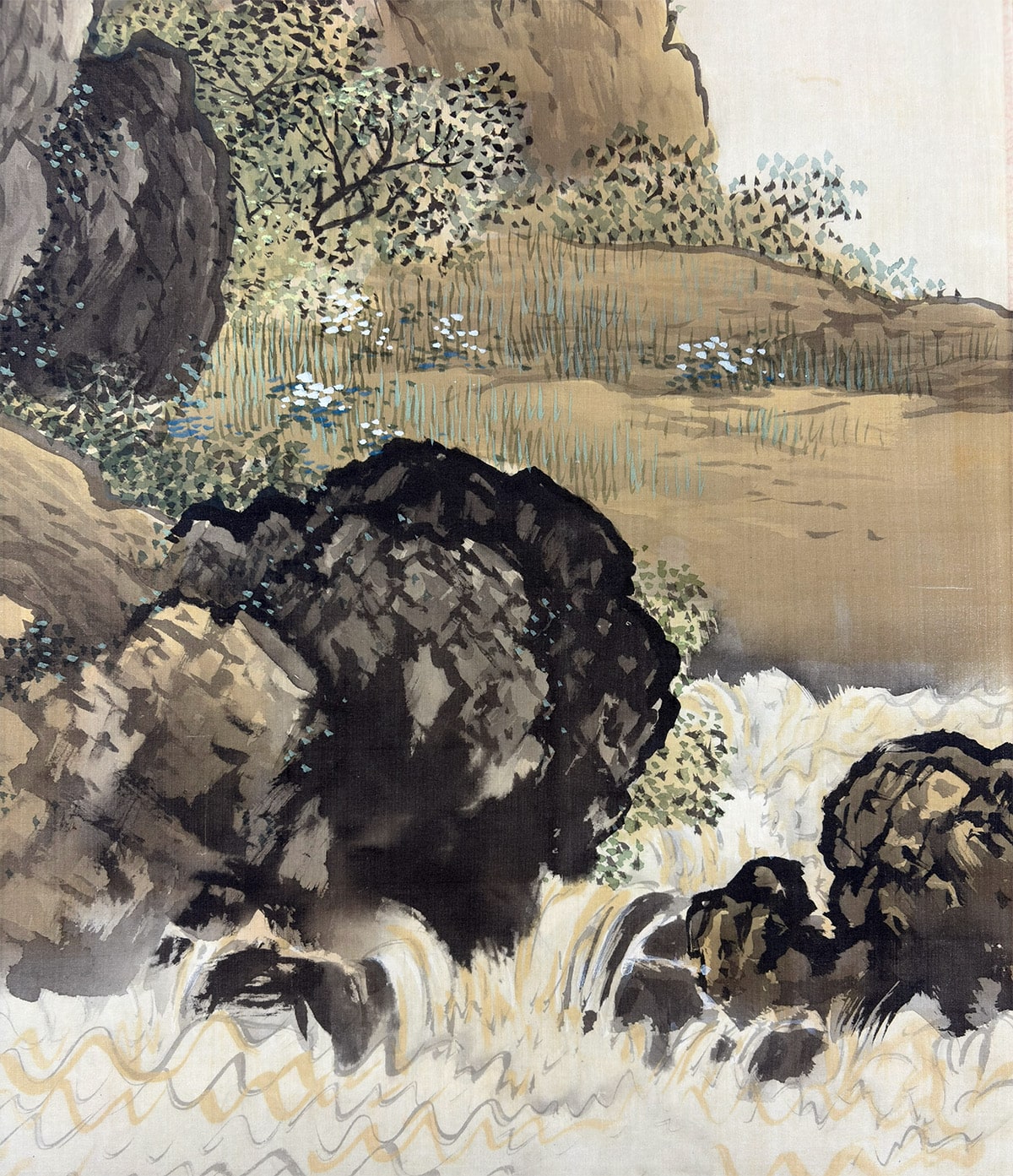 力強い水流の描写と、奥へ向かうほど柔らかく霞む山並みが美しく調和し、画面に奥行きと清涼感をもたらしています。