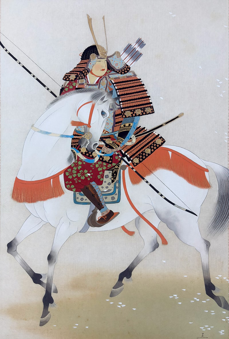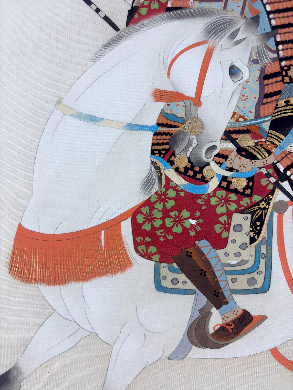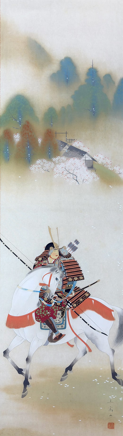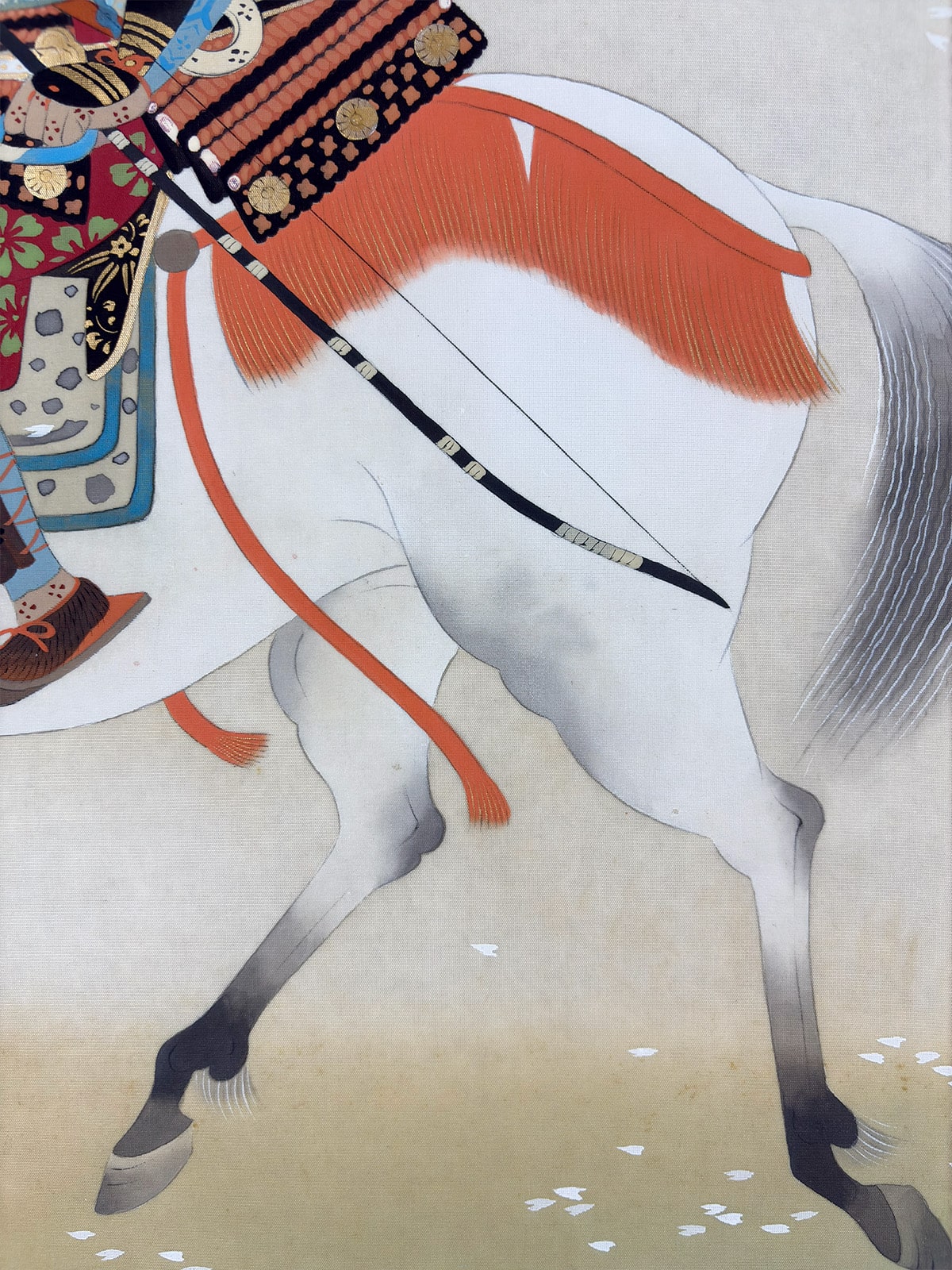 ●この作品では武人が満開の山桜の中に緻密な筆で美しく描かれています。鞍上の武人は天下一の武勇の士と賞讃された源義家で、勿来(なこそ)の関の場面と思われます。勿来の関は白河関、念珠関と並んで奥羽三古関の一つとして名高い関所です。これを「勿来」(来るなかれ)と呼んだのは平安中期ごろからで、北方の蝦夷の南下をせきとめるためであったと言われています。紀貫之、小野小町、和泉式部、西行法師など多くの歌人が風光明媚なこの関を歌に詠んで有名ですが、なかでも義家の歌は千載集に掲載されて広く知られています。