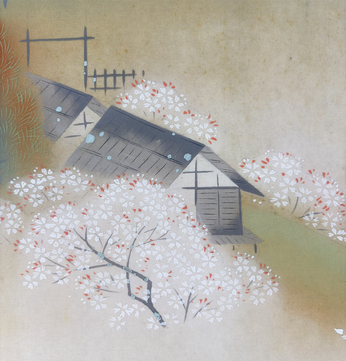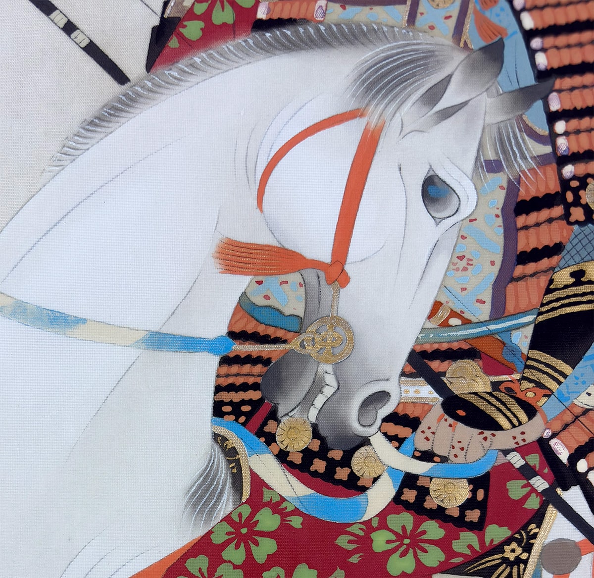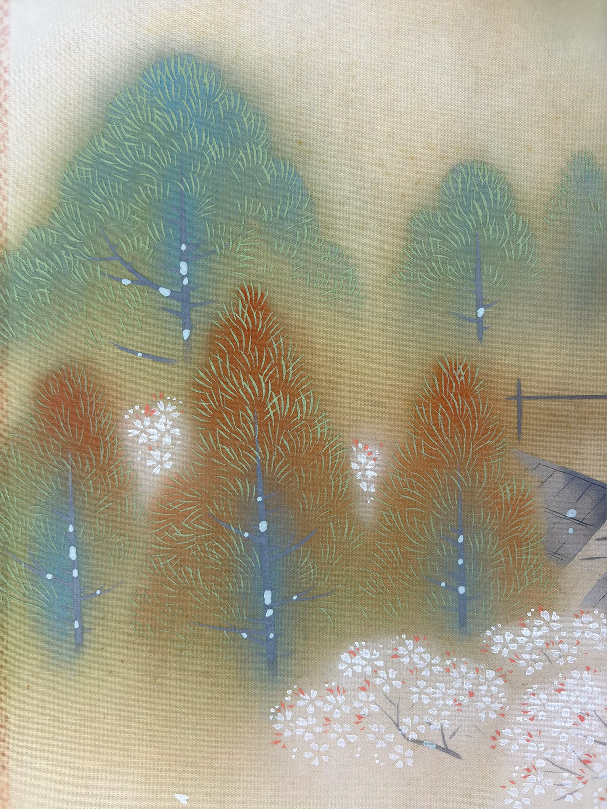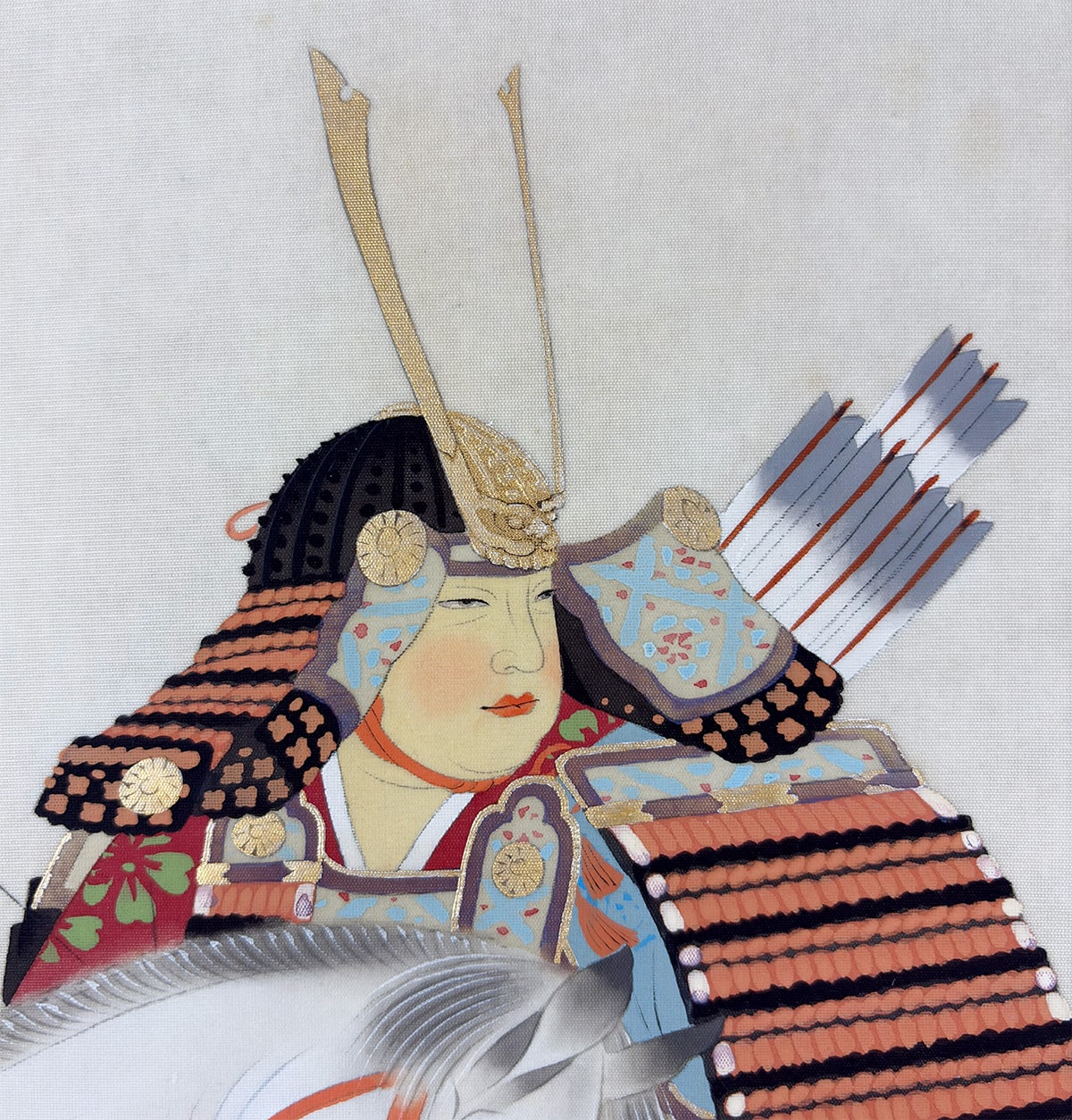 ●この作品では武人が満開の山桜の中に緻密な筆で美しく描かれています。鞍上の武人は天下一の武勇の士と賞讃された源義家で、勿来(なこそ)の関の場面と思われます。勿来の関は白河関、念珠関と並んで奥羽三古関の一つとして名高い関所です。これを「勿来」(来るなかれ)と呼んだのは平安中期ごろからで、北方の蝦夷の南下をせきとめるためであったと言われています。紀貫之、小野小町、和泉式部、西行法師など多くの歌人が風光明媚なこの関を歌に詠んで有名ですが、なかでも義家の歌は千載集に掲載されて広く知られています。